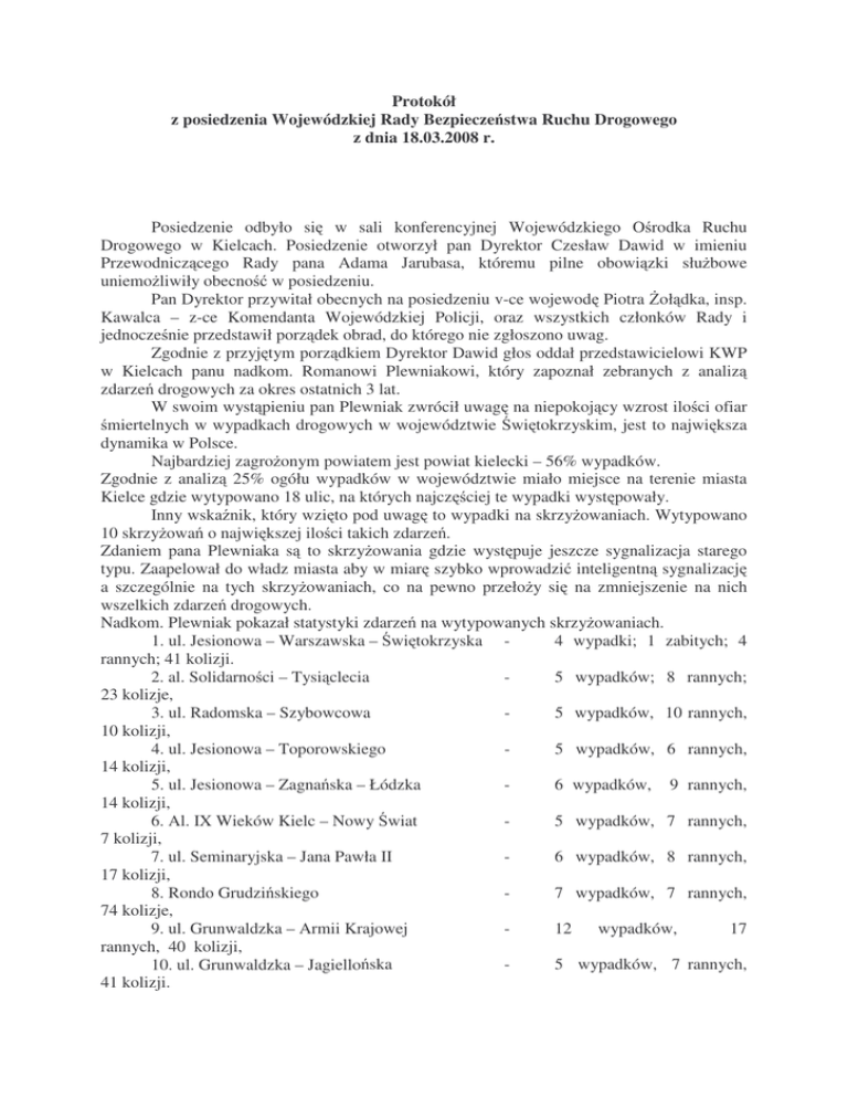 Protokół z posiedzenia Wojewódzkiej Rady Bezpiecze stwa Ruchu Drogowego z dnia 18.03.2008 r. Posiedzenie odbyło si w sali konferencyjnej Wojewódzkiego O rodka Ruchu Drogowego w Kielcach. Posiedzenie otworzył pan Dyrektor Czesław Dawid w imieniu Przewodnicz cego Rady pana Adama Jarubasa, któremu pilne obowi zki słu bowe uniemo liwiły obecno w posiedzeniu. Pan Dyrektor przywitał obecnych na posiedzeniu v-ce wojewod Piotra oł dka, insp. Kawalca – z-ce Komendanta Wojewódzkiej Policji, oraz wszystkich członków Rady i jednocze nie przedstawił porz dek obrad, do którego nie zgłoszono uwag. Zgodnie z przyj tym porz dkiem Dyrektor Dawid głos oddał przedstawicielowi KWP w Kielcach panu nadkom. Romanowi Plewniakowi, który zapoznał zebranych z analiz zdarze drogowych za okres ostatnich 3 lat. W swoim wyst pieniu pan Plewniak zwrócił uwag na niepokoj cy wzrost ilo ci ofiar miertelnych w wypadkach drogowych w województwie wi tokrzyskim, jest to najwi ksza dynamika w Polsce. Najbardziej zagro onym powiatem jest powiat kielecki – 56% wypadków. Zgodnie z analiz 25% ogółu wypadków w województwie miało miejsce na terenie miasta Kielce gdzie wytypowano 18 ulic, na których najcz ciej te wypadki wyst powały. Inny wska nik, który wzi to pod uwag to wypadki na skrzy owaniach. Wytypowano 10 skrzy owa o najwi kszej ilo ci takich zdarze . Zdaniem pana Plewniaka s to skrzy owania gdzie wyst puje jeszcze sygnalizacja starego typu. Zaapelował do władz miasta aby w miar szybko wprowadzi inteligentn sygnalizacj a szczególnie na tych skrzy owaniach, co na pewno przeło y si na zmniejszenie na nich wszelkich zdarze drogowych. Nadkom. Plewniak pokazał statystyki zdarze na wytypowanych skrzy owaniach. 1. ul. Jesionowa – Warszawska – wi tokrzyska 4 wypadki; 1 zabitych; 4 rannych; 41 kolizji. 2. al. Solidarno ci – Tysi clecia 5 wypadków; 8 rannych; 23 kolizje, 3. ul. Radomska – Szybowcowa 5 wypadków, 10 rannych, 10 kolizji, 4. ul. Jesionowa – Toporowskiego 5 wypadków, 6 rannych, 14 kolizji, 5. ul. Jesionowa – Zagna ska – Łódzka 6 wypadków, 9 rannych, 14 kolizji, 6. Al. IX Wieków Kielc – Nowy wiat 5 wypadków, 7 rannych, 7 kolizji, 7. ul. Seminaryjska – Jana Pawła II 6 wypadków, 8 rannych, 17 kolizji, 8. Rondo Grudzi skiego 7 wypadków, 7 rannych, 74 kolizje, 9. ul. Grunwaldzka – Armii Krajowej 12 wypadków, 17 rannych, 40 kolizji, 5 wypadków, 7 rannych, 10. ul. Grunwaldzka – Jagiello ska 41 kolizji. Na tych wszystkich skrzy owaniach jest pilna potrzeba zmiana przestarzałej sygnalizacji na nowoczesn . Policja wskazuje tez na miejsca niebezpieczne na drogach krajowych i wojewódzkich lecz miejsca te w ci gu 3 lat analizowanych nie powtarzaj si , a wi c zdaniem p. Plewniaka wiadczy to mo e o bł dach ludzkich natomiast geografia zdarze drogowych si zmienia. Ko cz c p. Plewniak stwierdził, e Policja robi wszystko, aby ograniczy liczby zdarze drogowych, ale mog t kwesti poprawi jedynie wspólne działania Policji i zarz dów dróg. W tym miejscu głos zabrał Starosta kielecki p. Janus zwracaj c uwag , e w analizie brak jest podziału dróg w powiecie kieleckim na drogi powiatowe, krajowe czy wojewódzkie przez co statystyka jest mało wiarygodna a wr cz dla niego jako Starosty bardzo krzywdz ca. Podkre lił, e na drogach powiatowych, którymi zarz dza jest bardzo mała ilo wypadków drogowych st d sugeruje, aby w przyszło ci dzieli drogi na powiatowe i inne pod k tem zarz dzaj cego drog . Dyrektor MZD p. Wójcik stwierdził, e jakkolwiek statystyka wypadkowa w Kielcach jest niekorzystna to uspokoił, e wszystkie elementy wymienione w analizie s podj te do realizacji, bo albo s ju projekty zmian organizacyjnych albo s projekty modernizacji sygnalizacji wietlnej. Je li uzyska si pieni dze z programu operacyjnego „Rozwój wi tokrzyskiego” w kwocie ok. 2 mln zł, to w tym roku wi kszo sygnalizacji zostanie zmodernizowana. Pozostałe w zły i skrzy owania czy odcinki proste obj te s projektami przebudowy lub czeka si na pieni dze. Prace trwaj i s na ró nym stopniu zaawansowania. Pan Dyrektor Dawid zapytał czy wobec głosu starosty kieleckiego Policja mo e rozbi zdarzenia na poszczególne kategorie dróg. Pan nadkom. Plewniak wyja nił, e oczywi cie takie informacje mo e przekaza panu Staro cie i ka demu z członków Rady je li b dzie sobie tego yczył. Zdarzenia b d rozbite na poszczególne kategorie dróg. Pani Iwona Podsiadło z GDDKiA poinformowała, e posiada informacje o wypadkach w wersji elektronicznej z podziałem na drogi powiatowe, krajowe, wojewódzkie i mo e te informacje równie przekaza zainteresowanym. Pan starosta uzupełnił, e nie mog uzyska pieni dzy z programu „Gambit”, bo wypadkowo na drogach powiatu kieleckiego jest zbyt niska a wi c przedstawione statystyki mijaj si z prawd i nie mo na mówi , e w powiecie kieleckim jest du o wypadków. Jednocze nie p. Starosta poprosił GDDKiA o elektroniczn statystyk z podziałem na wszystkie kategorie dróg. Sekretarz WRBRD Tadeusz Solarz zwrócił uwag , zebranym, e sprawa nie ko czy si na przedstawionej analizie, gdy jest to pierwszy etap. B d jeszcze dalsze informacje zespołu roboczego oparte na raportach Zarz dów dróg, a wi c dalsze informacje b d dokładniejsze i bardziej szczegółowe. Nast pnie P. Dyrektor Dawid poprosił o informacj z wydatkowania rodków na Brd przez WORD Kielce w roku 2007. Informacj przedstawił Asystent Dyrektora ds. Brd Pan Michał Piechota. Podkre lił, e wst pnie zaplanowana kwota na Brd wynosz ca 100 tys. zł została pó niej zwi kszona o 50% a w ostateczno ci w roku 2007 WORD wydatkował na Brd kwot 218 tys. zł. Pan Michał Piechota zapoznał zebranych z konkretnymi wydatkami na poszczególne działania szczegółowo analizuj c ka de z nich. Po przedstawieniu rozliczenia wydatków Dyrektor Dawid poprosił, p. M. Piechot o zapoznanie, zebranych z planowanymi wydatkami na BRD przez WORD w 2008 r. w celu zatwierdzenia ich przez Rad . Pan M. Piechota prze
