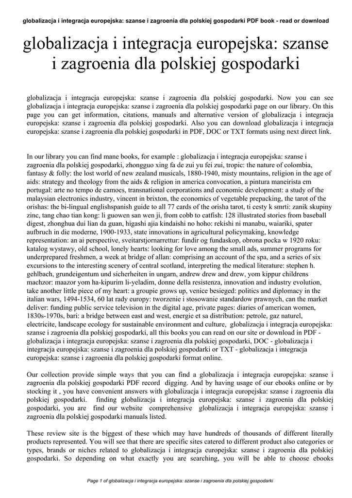 globalizacja i integracja europejska: szanse i zagroenia dla polskiej gospodarki PDF book - read or download globalizacja i integracja europejska: szanse i zagroenia dla polskiej gospodarki globalizacja i integracja europejska: szanse i zagroenia dla polskiej gospodarki. Now you can see globalizacja i integracja europejska: szanse i zagroenia dla polskiej gospodarki page on our library. On this page you can get information, citations, manuals and alternative version of globalizacja i integracja europejska: szanse i zagroenia dla polskiej gospodarki. Also you can download globalizacja i integracja europejska: szanse i zagroenia dla polskiej gospodarki in PDF, DOC or TXT formats using next direct link. In our library you can find mane books, for example : globalizacja i integracja europejska: szanse i zagroenia dla polskiej gospodarki, zhongguo xing fa de zui yu fei zui, tropic: the nature of colombia, fantasy & folly: the lost world of new zealand musicals, 1880-1940, misty mountains, religion in the age of aids: strategy and theology from the aids & religion in america convocation, a pintura maneirista em portugal: arte no tempo de camoes, transnational corporations and economic development: a study of the malaysian electronics industry, vincent in brixton, the economics of vegetable prepacking, the tarot of the orishas: the bi-lingual englishspanish guide to all 77 cards of the orisha tarot, ti cesty k smrti: zanik skupiny zinc, tang chao tian kong: li guowen san wen ji, from cobb to catfish: 128 illustrated stories from baseball digest, zhonghua dui lian da guan, higashi ajia kindaishi no hoho: rekishi ni manabu, waiariki, spater aufbruch in die moderne, 1900-1933, state innovations in agricultural policymaking, knowledge representation: an ai perspective, sveitarstjornarrettur: fundir og fundaskop, obrona pocka w 1920 roku: katalog wystawy, old school, lonely hearts: looking for love among the small ads, summer programs for underprepared freshmen, a week at bridge of allan: comprising an account of the spa, and a series of six excursions to the interesting scenery of central scotland, interpreting the medical literature: stephen h. gehlbach, grundeigentum und sicherheiten in ungarn, andrew drew and drew, yom kippur childrens machzor: maazor yom ha-kipurim li-yeladim, donne della resistenza, innovation and industry evolution, take another little piece of my heart: a groupie grows up, venice besieged: politics and diplomacy in the italian wars, 1494-1534, 60 lat rady europy: tworzenie i stosowanie standardow prawnych, can the market deliver: funding public service television in the digital age, private pages: diaries of american women, 1830s-1970s, bari: a bridge between east and west, energie et sa distribution: petrole, gaz naturel, electricite, landscape ecology for sustainable environment and culture, globalizacja i integracja europejska: szanse i zagroenia dla polskiej gospodarki, all this books you can read on our site or download in PDF globalizacja i integracja europejska: szanse i zagroenia dla polskiej gospodarki, DOC - globalizacja i integracja europejska: szanse i zagroenia dla polskiej gospodarki or TXT - globalizacja i integracja europejska: szanse i zagroenia dla polskiej gospodarki format online. Our collection provide simple ways that you can find a globalizacja i integracja europejska: szanse i zagroenia dla polskiej gospodarki PDF record digging. And by having usage of our ebooks online or by stocking it , you have convenient answers with globalizacja i integracja europejska: szanse i zagroenia dla polskiej gospodarki. finding globalizacja i integracja europejska: szanse i zagroenia dla polskiej gospodarki, you are find our website comprehensive globalizacja i integracja europejska: szanse i zagroenia dla polskiej gospodarki manuals listed. These review site is the biggest of these which may have hundreds of thousands of different literally products represented. You will see that there are specific sites catered to different product also categories or types, brands or niches related to globalizacja i integracja europejska: szanse i zagroenia dla polskiej gospodarki. So depending on what exactly you are searching, you will be able to choose ebooks Page 1 of globalizacja i integracja europejska: szanse i zagroenia dla polskiej gospodarki globalizacja i integracja europejska: szanse i zagroenia dla polskiej gospodarki PDF book - read or download globalizacja i integracja europejska: szanse i zagroenia dla polskiej gospodarki to fit your own needs, globalizacja i integracja europejska: szanse i zagroenia dla polskiej gospodarki. Page 2 of globalizacja i integracja europejska: szanse i zagroenia dla polskiej gospodarki