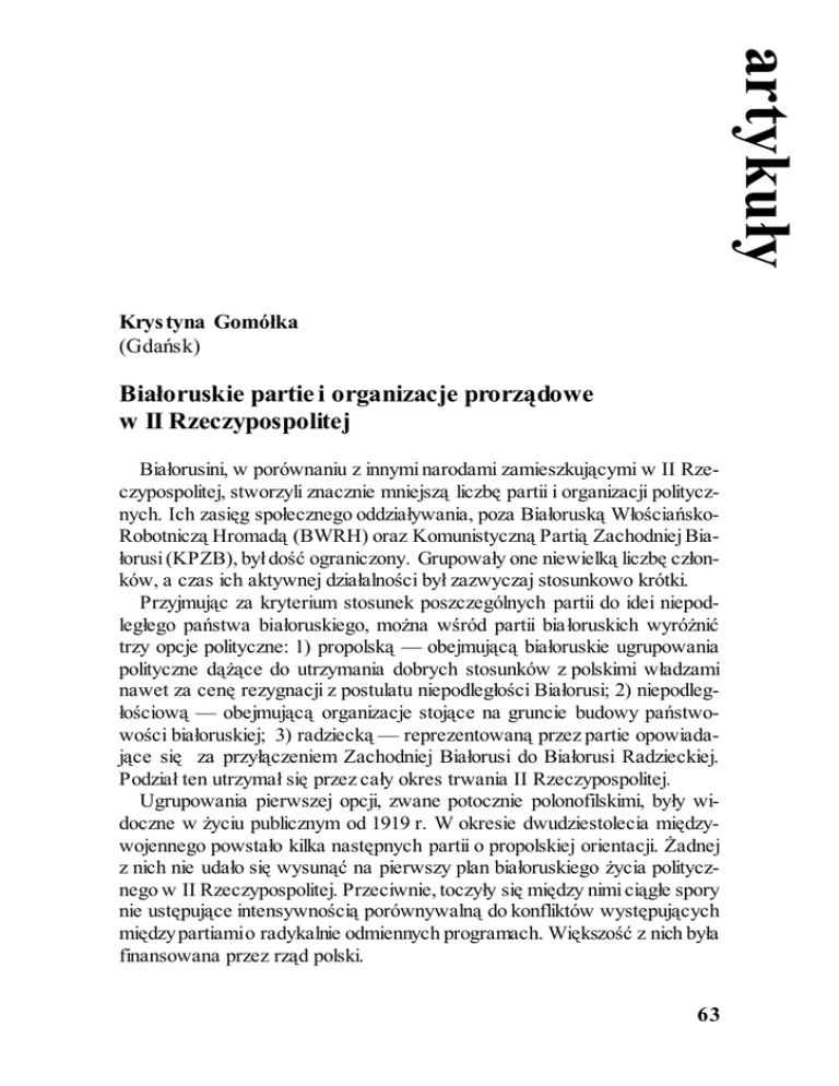 artykuły Krys tyna Gomółka (Gdańsk) Białoruskie partie i organizacje prorządowe w II Rzeczypospolitej Białorusini, w porównaniu z innymi narodami zamieszkującymi w II Rzeczypospolitej, stworzyli znacznie mniejszą liczbę partii i organizacji politycznych. Ich zasięg społecznego oddziaływania, poza Białoruską WłościańskoRobotniczą Hromadą (BWRH) oraz Komunistyczną Partią Zachodniej Białorusi (KPZB), był dość ograniczony. Grupowały one niewielką liczbę członków, a czas ich aktywnej działalności był zazwyczaj stosunkowo krótki. Przyjmując za kryterium stosunek poszczególnych partii do idei niepodległego państwa białoruskiego, można wśród partii białoruskich wyróżnić trzy opcje polityczne: 1) propolską — obejmującą białoruskie ugrupowania polityczne dążące do utrzymania dobrych stosunków z polskimi władzami nawet za cenę rezygnacji z postulatu niepodległości Białorusi; 2) niepodległościową — obejmującą organizacje stojące na gruncie budowy państwowości białoruskiej; 3) radziecką — reprezentowaną przez partie opowiadające się za przyłączeniem Zachodniej Białorusi do Białorusi Radzieckiej. Podział ten utrzymał się przez cały okres trwania II Rzeczypospolitej. Ugrupowania pierwszej opcji, zwane potocznie polonofilskimi, były widoczne w życiu publicznym od 1919 r. W okresie dwudziestolecia międzywojennego powstało kilka następnych partii o propolskiej orientacji. Żadnej z nich nie udało się wysunąć na pierwszy plan białoruskiego życia politycznego w II Rzeczypospolitej. Przeciwnie, toczyły się między nimi ciągłe spory nie ustępujące intensywnością porównywalną do konfliktów występujących między partiami o radykalnie odmiennych programach. Większość z nich była finansowana przez rząd polski. 63 Najwcześniej założoną partią był Zielony Dąb. Organizacja powstała w styczniu 1919 r. Grupowała w swoich szeregach przeważnie włościan. Opowiadała się za utworzeniem Białoruskiej Republiki Ludowej związanej sojuszem z Polską (rodzaju sojuszu nie określano). Jako zadanie bieżące partii stawiano m.in. pracę na rzecz Polski, która w przyszłości miała spłacić dług w postaci utworzenia białoruskiego państwa. Zielony Dąb powołał do życia własne oddziały partyzanckie, które miały wspomagać wojsko polskie w walce z Armią Czerwoną. Oddziały te w latach 1919-1920 liczyły około kilkuset osób. Na czele Zielonego Dębu stał Wiaczesław Adamowicz (syn), pseudonim Józef Dziergacz, który był jednocześnie naczelnikiem sił zbrojnych. Partia, mimo deklarowania życzliwości dla Polski, w rzeczywistości niewiele zdziałała. W społeczeństwie białoruskim nie miała większych wpływów i nie stanowiła konkurencji dla innych ugrupowań1 . Zielony Dąb wziął udział w wyborach parlamentarnych 1922 r. propagując hasła współpracy z Polską. Nie uzyskały one poparcia, partia poniosła klęskę wyborczą i jeszcze w 1922 r. zaprzestała działalności. Równolegle z partią Zielony Dąb funcjonowały inne ugrupowania polonofilskie. Związek Krajowy powstał w grudniu 1920 r. Jego celem było zjednoczenie Polaków, Litwinów i Białorusinów wokół idei odtworzenia Wielkiego Księstwa Litewskiego, które w przyszłości miałoby się połączyć w formie federacji z Polską. Organizacja, na czele której stanął Paweł Aleksiuk i Wiaczesław Adamowicz finansowana była przez rząd polski. Jej działania nie przyniosły jednak większych rezultatów. Gdy w 1921 r. rząd polski wstrzymał finansowanie, partia rozpadła się2 . Jej kontynuatorem było Zjednoczenie Białoruskich Bezpartyjnych Aktywistów, utworzone w marcu 1922 r. Aktywistami tej organizacji byli Eugeniusz Mitkiewicz, Borys Szurpa oraz Adamowiczowie. Program ugrupowania stanowił minimum postulatów białoruskich i zamykał się w żądaniu realizacji praw kulturalno-oświatowych oraz polepszeniu bytu materialnego ludności białoruskiej w II Rzeczypospolitej. Partia starała się pozyskać zwolenników wśród włościan białoruskich poprzez rozdawnictwo drewna na budowę domostw, obietnice zapomóg rządowych na zagospodarowanie. W lutym 1922 r. Białoruscy Aktywiści poparli uchwałę Sejmu Wileńskiego mówiącą o włączeniu Wileńszczyzny do Polski. Do czasu wyborów parlamentarnych w 1922 r. partia współpracując z władzami polskimi działała na rzecz zbliżenia ludności białoruskiej do Polski, przedstawiając perspektywy poprawy jej bytu materialnego. Dążyła również do wyeliminowania wszelkich akcji antypaństwowych podejmowanych przez 1 2 64 Krótki zarys zagadnienia białoruskiego, Warszawa 1928, s. 98; J. Relidzyński, Śladami Kmicica, „Tygodnik Ilustrowany” 1920, s. 604; Działalność niektórych ugrupowań białoruskich w latach 1918-1939 została omówiona w pracy J. Holzera, Mozaika polityczna Drugiej Rzeczypospolitej, Warszawa 1974, s. 253-260; 551-562. K. Gomółka, Polsko-białoruskie rozmowy w Mińsku (marzec 1920 r.), „Dzieje Najnowsze”, 1988, nr 1, s. 3-4. ludność białoruską3 . W przededniu wyborów parlamentarnych 1922 r. Białoruscy Bezpartyjni Aktywiści weszli w skład koalicji wyborczej tzw. Zjednoczenia Państwowego na Kresach, zwalczającego listę Bloku Mniejszości Narodowych. W programie Zjednoczenia znalazło się hasło autonomii kulturalnej dla Białorusinów mieszkających w granicach państwa polskiego. W wyborach 1922 r. Zjednoczenie poniosło klęskę. Z listy liczącej dwadzieścia dwa nazwiska, do sejmu nie wszedł ani jeden poseł. Białoruscy Bezpartyjni Aktywiści nie ustawali w pracy na rzecz propagowania orientacji propolskiej wśród ludności białoruskiej. Nie uznawali Białoruskiego Komitetu Narodowego za naczelną organizację białoruską na terenie Rzeczypospolitej. Swoją działalność prowadzili głównie na Grodzieńszczyźnie, starając się ograniczyć tam wpływy Białoruskiego Klubu Poselskiego. Udało im