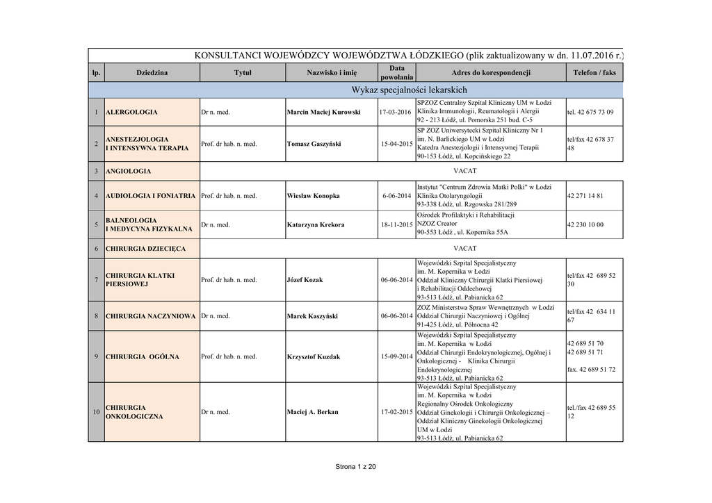 KONSULTANCI WOJEWÓDZCY WOJEWÓDZTWA ŁÓDZKIEGO (plik zaktualizowany w dn. 11.07.2016 r.) lp. Tytuł Dziedzina Nazwisko i imię Data powołania Adres do korespondencji Telefon / faks Wykaz specjalności lekarskich Dr n. med. Marcin Maciej Kurowski SPZOZ Centralny Szpital Kliniczny UM w Łodzi 17-03-2016 Klinika Immunologii, Reumatologii i Alergii 92 - 213 Łódź, ul. Pomorska 251 bud. C-5 tel. 42 675 73 09 Tomasz Gaszyński SP ZOZ Uniwersytecki Szpital Kliniczny Nr 1 im. N. Barlickiego UM w Łodzi 15-04-2015 Katedra Anestezjologii i Intensywnej Terapii 90-153 Łódź, ul. Kopcińskiego 22 tel/fax 42 678 37 48 1 ALERGOLOGIA 2 ANESTEZJOLOGIA I INTENSYWNA TERAPIA 3 ANGIOLOGIA 4 AUDIOLOGIA I FONIATRIA Prof. dr hab. n. med. Wiesław Konopka Instytut "Centrum Zdrowia Matki Polki" w Łodzi 6-06-2014 Klinika Otolaryngologii 93-338 Łódź, ul. Rzgowska 281/289 42 271 14 81 5 BALNEOLOGIA I MEDYCYNA FIZYKALNA Katarzyna Krekora Ośrodek Profilaktyki i Rehabilitacji 18-11-2015 NZOZ Creator 90-553 Łódź , ul. Kopernika 55A 42 230 10 00 6 CHIRURGIA DZIECIĘCA Prof. dr hab. n. med. VACAT Dr n. med. VACAT 7 CHIRURGIA KLATKI PIERSIOWEJ 8 CHIRURGIA NACZYNIOWA Dr n. med. 9 10 CHIRURGIA OGÓLNA CHIRURGIA ONKOLOGICZNA Prof. dr hab. n. med. Prof. dr hab. n. med. Dr n. med. Józef Kozak Marek Kaszyński Krzysztof Kuzdak Maciej A. Berkan Strona 1 z 20 Wojewódzki Szpital Specjalistyczny im. M. Kopernika w Łodzi 06-06-2014 Oddział Kliniczny Chirurgii Klatki Piersiowej i Rehabilitacji Oddechowej 93-513 Łódź, ul. Pabianicka 62 ZOZ Ministerstwa Spraw Wewnętrznych w Łodzi 06-06-2014 Oddział Chirurgii Naczyniowej i Ogólnej 91-425 Łódź, ul. Północna 42 Wojewódzki Szpital Specjalistyczny im. M. Kopernika w Łodzi Oddział Chirurgii Endokrynologicznej, Ogólnej i 15-09-2014 Onkologicznej - Klinika Chirurgii Endokrynologicznej 93-513 Łódź, ul. Pabianicka 62 Wojewódzki Szpital Specjalistyczny im. M. Kopernika w Łodzi Regionalny Ośrodek Onkologiczny 17-02-2015 Oddział Ginekologii i Chirurgii Onkologicznej – Oddział Kliniczny Ginekologii Onkologicznej UM w Łodzi 93-513 Łódź, ul. Pabianicka 62 tel/fax 42 689 52 30 tel/fax 42 634 11 67 42 689 51 70 42 689 51 71 fax. 42 689 51 72 tel./fax 42 689 55 12 lp. Tytuł Dziedzina 11 CHIRURGIA PLASTYCZNA Dr hab. n. med. prof. nadzw 12 CHOROBY PŁUC Dr n. med. Nazwisko i imię Bogusław Antoszewski Data powołania 01-03-2013 10-08-2015 Jerzy Marczak 13 CHOROBY PŁUC DZIECI Dr n. med. Anna Barbara Pankowska 01-11-2014 14 CHOROBY WEWNĘTRZNE Prof. dr hab. n. med. Dariusz Moczulski 16-08-2011 15 CHOROBY ZAKAŹNE 16 DERMATOLOGIA I WENEROLOGIA 17 DIABETOLOGIA Lek. Prof. dr hab. n. med. Prof. dr hab. n. med. Adres do korespondencji SP ZOZ Uniwersytecki Szpital Kliniczny Nr 1 im. N. Barlickiego UM w Łodzi Oddział Kliniczny Chirurgii Plastycznej Rekonstrukcyjnej i Estetycznej 90-153 Łódź, ul. Kopcińskiego 22 SP ZOZ Uniwersytecki Szpital Kliniczny Nr 1 im. N. Barlickiego UM w Łodzi Oddział Kliniczny Pulmonologii i Alergologii 90-153 Łódź, ul. Kopcińskiego 22 Wojewódzki Zespół Zakładów Opieki Zdrowotnej Centrum Leczenia Chorób Płuc i Rehabilitacji w Łodzi Szpital im. Błogosławionego Ojca Rafała Chylińskiego, Oddział Chorób Układu Oddechowego dla Dzieci 91-520 Łódź, ul. Okólna 181 SPZOZ Uniwersytecki Szpital Kliniczny im. WAM UM w Łodzi - Centralny Szpital Weteranów Klinika Chorób Wewnętrznych i Nefrodiabetologii 90-549 Łódź, ul. Żeromskiego 113 Anetta Bartczak Wojewódzki Specjalistyczny Szpital im. dr Wł. Biegańskiego w Łodzi 20-04-2015 Oddział Obserwacyjno-Zakaźny i Chorób Wątroby 91-347 Łódź, ul. Kniaziewicza 1/5 Anna Woźniacka SPZOZ Uniwersytecki Szpital Kliniczny im. WAM UM w Łodzi - Centralny Szpital Weteranów 6-06-2014 Klinika Dermatologii i Wenerologii 90-647 Łódź, Pl. Hallera 1 Jerzy Loba SPZOZ Centralny Szpital Kliniczny Uniwersytetu Medycznego w Łodzi 6-06-2014 Centrum Kliniczno-Dydaktyczne Klinika Chorób Wewnętrznych i Diabetologii 92-213 Łódź, ul. Pomorska 251 DIAGNOSTYKA 18 LABORATORYJNA Dr hab. n. med. prof. nadzw. Mirosława Pietruczuk SPZOZ Uniwersytecki Szpital Kliniczny Nr 1 im. N. Barlickiego UM w Łodzi 1-09-2014 Zakład Diagnostyki Laboratoryjnej 90-153 Łódź, ul. Kopcińskiego 22 ENDOKRYNOLOGIA 19 GINEKOLOGICZNA I ROZRODCZOŚCI Prof. dr hab. n. med. Jerzy Radwan 1-01-2015 Strona 2 z 20 Centrum Leczenia Niepłodności Gameta 95-030 Rzgów, ul. Rudzka34/36 Telefon / faks 42 677 67 41 42 677 67 39 fax. 42 677 67 49 42 678 75 05 fax. 42 678 21 29 42 617 72 64 42 617 73 63 42 639 35 71 fax 42 639 37 30 42 251 60 77 42 251 62 30 42 639 30 92 42 686 79 81 42 686 25 70 fax 42 688 45 65 42 201 43 40 42 678 28 33 42 611 69 83 42 677 69 81 42 645 77 77 fax 42 645 76 00 lp. 20 ENDOKRYNOLOGIA ENDOKRYNOLOGIA 21 I DIABETOLOGIA DZIECIĘCA 22 EPIDEMIOLOGIA 23 FARMAKOLOGIA KLINICZNA 24 GASTROENTEROLOGIA 25 Tytuł Dziedzina GASTROENTEROLOGIA DZIECIĘCA 26 GERIATRIA 27 GENETYKA KLINICZNA GINEKOLOGIA 28 ONKOLOGICZNA 29 HEMATOLOGIA Prof. dr hab. n.med. Dr n. med. Nazwisko i imię Krzysztof Lewandowski Renata Stawerska Data powołania Adres do korespondencji Instytut "Centrum Zdrowia Matki Polki" w Łodzi 01-11-2014 Klinika Endokrynologii i Chorób Metabolicznych 93-338 Łódź, ul. Rzgowska 281/289 42 271 11 41 Instytut "Centrum Zdrowia Matki Polki" w Łodzi 15-04-2015 Klinika Endokrynologii i Chorób Metabolicznych 93-338 Łódź, ul. Rzgowska 281/290 42 271 11 41 Lek. Jolanta Piaskowska Powiatowa Stacja Sanitarno-Epidemiologiczna w Łodzi 06-06-2014 Oddział Nadzoru Epidemiologicznego 93-189 Łódź, ul. Przybyszewskiego 10 Dr n. med. Wojciech Matusewicz 20-06-2014 Dr hab. n. med. Anita Gąsiorowska Dr hab. n. med. prof. nadzw. Ewa Toporowska Kowalska Dr n. med. Dr n. med. Prof. dr hab. n. med. Prof. dr hab. n. med. Maria Kołomecka Agencja Oceny Technologii Medycznych 02-611 Warszawa, ul. I. Krasickiego 26 SP ZOZ Uniwersytecki Szpital Kliniczny Nr 1 im. N. Barlickiego w Łodzi 17-02-2015 Klinika Ch