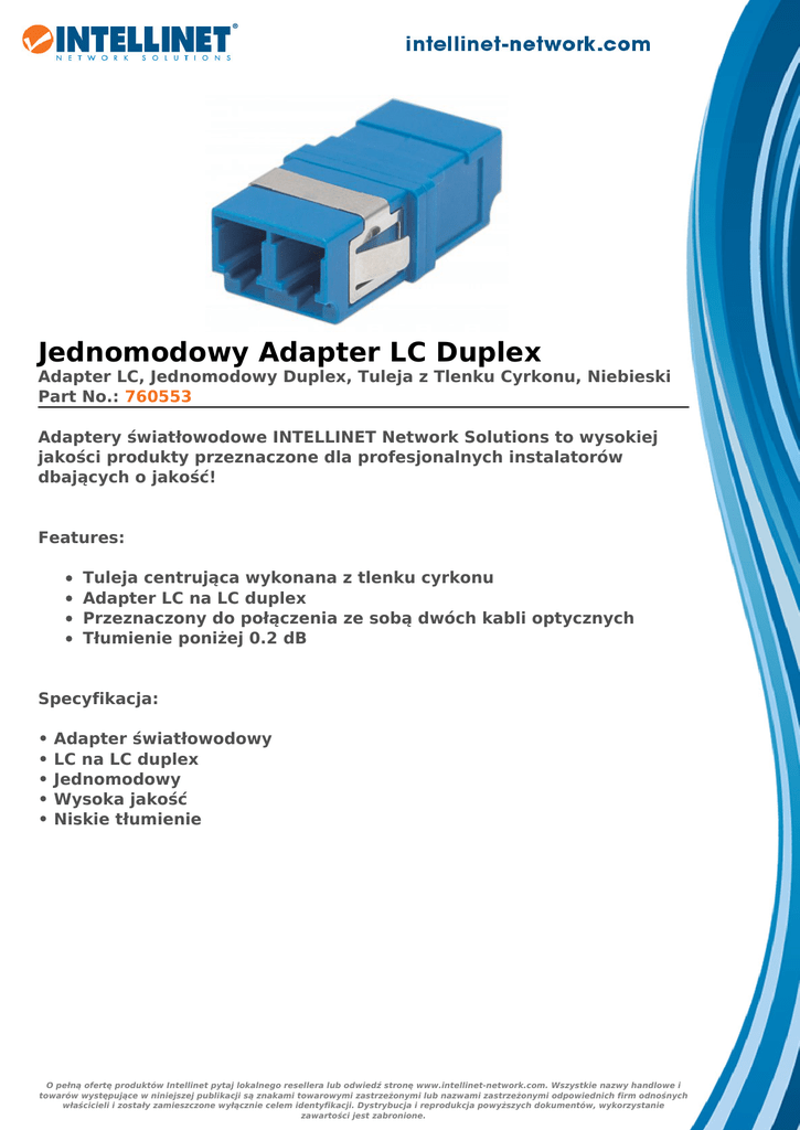 Jednomodowy Adapter LC Duplex Adapter LC, Jednomodowy Duplex, Tuleja z Tlenku Cyrkonu, Niebieski Part No.: 760553 Adaptery światłowodowe INTELLINET Network Solutions to wysokiej jakości produkty przeznaczone dla profesjonalnych instalatorów dbających o jakość! Features: Tuleja centrująca wykonana z tlenku cyrkonu Adapter LC na LC duplex Przeznaczony do połączenia ze sobą dwóch kabli optycznych Tłumienie poniżej 0.2 dB Specyfikacja: • • • • • Adapter światłowodowy LC na LC duplex Jednomodowy Wysoka jakość Niskie tłumienie O pełną ofertę produktów Intellinet pytaj lokalnego resellera lub odwiedź stronę www.intellinet-network.com. Wszystkie nazwy handlowe i towarów występujące w niniejszej publikacji są znakami towarowymi zastrzeżonymi lub nazwami zastrzeżonymi odpowiednich firm odnośnych właścicieli i zostały zamieszczone wyłącznie celem identyfikacji. Dystrybucja i reprodukcja powyższych dokumentów, wykorzystanie zawartości jest zabronione. O pełną ofertę produktów Intellinet pytaj lokalnego resellera lub odwiedź stronę www.intellinet-network.com. Wszystkie nazwy handlowe i towarów występujące w niniejszej publikacji są znakami towarowymi zastrzeżonymi lub nazwami zastrzeżonymi odpowiednich firm odnośnych właścicieli i zostały zamieszczone wyłącznie celem identyfikacji. Dystrybucja i reprodukcja powyższych dokumentów, wykorzystanie zawartości jest zabronione.