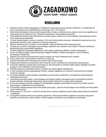 REGULAMIN 1. Regulamin określa zasady obowiązujące w Zagadkowie mieszczącym się pod adresem Radomsko, ul. Przedborska 10 lok.6, prowadzonym przez DAROOM Daria Leszczyńska, NIP: 772 240 80 91. 2. Każda osoba dokonująca rezerwacji bądź kupująca bilet na miejscu, telefonicznie oraz poprzez stronę www.zagadkowo.eu, zobowiązana jest do zapoznania się z niniejszym regulaminem i przestrzegania jego zasad. 3. Uniemożliwienie telefonicznego potwierdzenia rezerwacji poprzez podanie przez rezerwującego nieprawidłowego numeru, może skutkować jej odwołaniem. 4. W celach organizacyjnych, prosimy o przybycie 10-15 minut przed godziną rezerwacji. Niespełnienie tego warunku może spowodować skrócenie czasu rozgrywki w ramach tej samej ceny. 5. Płatność regulowana jest na miejscu w formie gotówki i należy jej dokonać przed rozpoczęciem gry. 6. Podczas gry uczestnicy zobowiązani są przestrzegać regulaminu oraz stosować się do zaleceń i instrukcji udzielonych bezpośrednio przez pracowników Zagadkowa. 7. W lokalu Zagadkowo obowiązuje kategoryczny zakaz palenia, spożywania alkoholu i środków odurzających. 8. Do gry nie mogą przystąpić osoby pod wyraźnym wpływem alkoholu, środków odurzających i innych substancji zmieniających świadomość. 9. Zabrania się wnoszenia do pomieszczeń ostrych narzędzi oraz innych niebezpiecznych urządzeń. 10. Graczy uprasza się o niekorzystanie z telefonów w trakcie gry. 11. Zabrania się rejestrowania video/audio oraz robienia zdjęć wnętrza pokoju. 12. Kategorycznie zabrania się przesuwania mebli, stawania na nich, wieszania się na elementach podwieszanych. 13. Pracownik Zagadkowa posiada prawo przerwania gry, jeśli zachowanie uczestników będzie dalece odbiegało od ogólnie przyjętych norm (subiektywna ocena pracownika). 14. Wszystkie pokoje są monitorowane (obraz ani dźwięk nie zostaną nigdzie udostępnione). 15. W razie niebezpieczeństwa zagrażającego Klientom, obsługa Zagadkowa ma możliwość otworzenia drzwi w każdym momencie rozgrywki. 16. Za szkody powstałe w wyniku działania uczestników gry (zniszczenie przedmiotów, scenografii itp) odpowiedzialność materialną ponosi Klient. 17. Uszkodzenie elementów pokoju, uniemożliwiające grę kolejnym grupom zobowiązuje graczy do poniesienia zarówno kosztów szkód jak i finansowej rekompensaty równej wartości utraconych w wyniku usterki rozgrywek. 18. Gra nie jest wskazana dla osób cierpiących na klaustrofobię, epilepsję, arachnofobię oraz którzy są w trakcie leczenia psychicznego, z problemami serca lub krążenia. 19. W przypadku przedwczesnego opuszczenia pokoju przez grupę – graczom nie przysługuje zwrot pieniędzy ani skorzystanie z gry w innym terminie. 20. Osoby poniżej 12. roku życia, w czasie Gry Escape Room, powinny znajdować się pod opieką osoby dorosłej lub animatora z Zagadkowa. 21. W przypadku niezastosowania się do punktów regulaminu i zaleceń pracowników Zagadkowo pracownicy mają prawo wyprosić uczestników gry z terenu obiektu. W takim wypadku uczestnikom nie przysługuje zwrot pieniędzy. .......…………………………………….