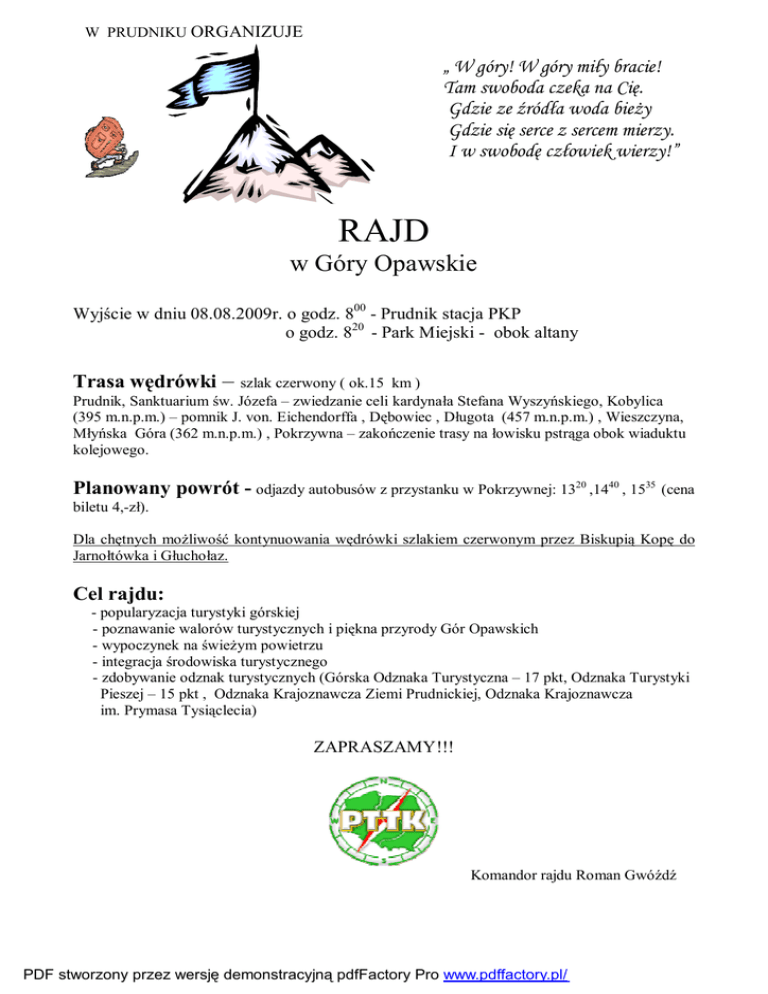 KOMISJA TURYSTYKI GÓRSKIEJ PRZY PTTK ODDZIAŁ SUDETÓW WSCHODNICH W PRUDNIKU ORGANIZUJE „ W góry! W góry miły bracie! Tam swoboda czeka na Cię. Gdzie ze źródła woda bieży Gdzie się serce z sercem mierzy. I w swobodę człowiek wierzy!” RAJD w Góry Opawskie Wyjście w dniu 08.08.2009r. o godz. 800 - Prudnik stacja PKP o godz. 820 - Park Miejski - obok altany Trasa wędrówki – szlak czerwony ( ok.15 km ) Prudnik, Sanktuarium św. Józefa – zwiedzanie celi kardynała Stefana Wyszyńskiego, Kobylica (395 m.n.p.m.) – pomnik J. von. Eichendorffa , Dębowiec , Długota (457 m.n.p.m.) , Wieszczyna, Młyńska Góra (362 m.n.p.m.) , Pokrzywna – zakończenie trasy na łowisku pstrąga obok wiaduktu kolejowego. Planowany powrót - odjazdy autobusów z przystanku w Pokrzywnej: 1320 ,1440 , 1535 (cena biletu 4,-zł). Dla chętnych możliwość kontynuowania wędrówki szlakiem czerwonym przez Biskupią Kopę do Jarnołtówka i Głuchołaz. Cel rajdu: - popularyzacja turystyki górskiej - poznawanie walorów turystycznych i piękna przyrody Gór Opawskich - wypoczynek na świeżym powietrzu - integracja środowiska turystycznego - zdobywanie odznak turystycznych (Górska Odznaka Turystyczna – 17 pkt, Odznaka Turystyki Pieszej – 15 pkt , Odznaka Krajoznawcza Ziemi Prudnickiej, Odznaka Krajoznawcza im. Prymasa Tysiąclecia) ZAPRASZAMY!!! Komandor rajdu Roman Gwóźdź PDF stworzony przez wersję demonstracyjną pdfFactory Pro www.pdffactory.pl/