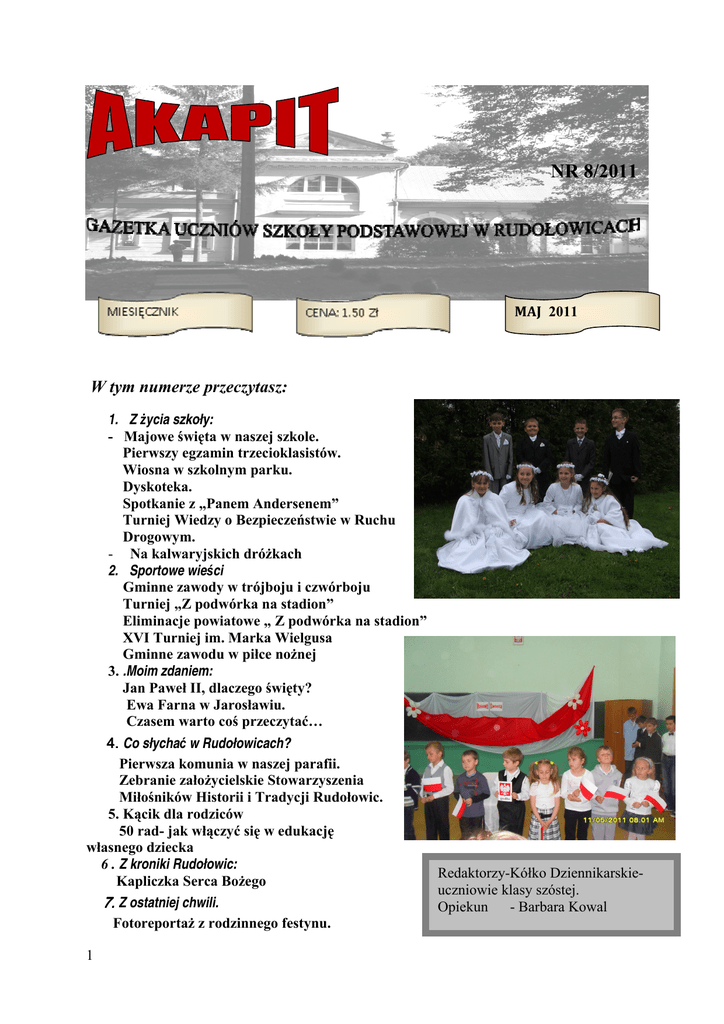 NR 8/2011 MAJ 2011 W tym numerze przeczytasz: 1. Z życia szkoły: - Majowe święta w naszej szkole. Pierwszy egzamin trzecioklasistów. Wiosna w szkolnym parku. Dyskoteka. Spotkanie z „Panem Andersenem” Turniej Wiedzy o Bezpieczeństwie w Ruchu Drogowym. - Na kalwaryjskich dróżkach 2. Sportowe wieści Gminne zawody w trójboju i czwórboju Turniej „Z podwórka na stadion” Eliminacje powiatowe „ Z podwórka na stadion” XVI Turniej im. Marka Wielgusa Gminne zawodu w piłce nożnej 3. .Moim zdaniem: Jan Paweł II, dlaczego święty? Ewa Farna w Jarosławiu. Czasem warto coś przeczytać… 4. Co słychać w Rudołowicach? Pierwsza komunia w naszej parafii. Zebranie założycielskie Stowarzyszenia Miłośników Historii i Tradycji Rudołowic. 5. Kącik dla rodziców 50 rad- jak włączyć się w edukację własnego dziecka 6 . Z kroniki Rudołowic: Redaktorzy-Kółko DziennikarskieKapliczka Serca Bożego uczniowie klasy szóstej. 7. Z ostatniej chwili. Opiekun - Barbara Kowal Fotoreportaż z rodzinnego festynu. 1 Majowe Święta-uroczysty apel. 11 maja 2011 roku odbyła się uroczysta akademia z okazji rocznicy majowych świąt. Jak wiadomo, maj obfituje w wielkie historyczne wydarzenia. Przypomnijmy niektóre z nich: 1 maja Święto Pracy, 2 maja Dzień Flagi, dzień później rocznica uchwalenia Konstytucji 3 Maja 8 maja Dzień Zwycięstwa. Warto pamiętać datę 18 maja 1944 roku, kiedy to po ciężkich bojach stoczonych o Monte Cassinoprzemyślanin p.por. Kazimierz Gurbiel zatknął biało- czerwoną flagę na szczycie okupionej polską krwią góry. Wszystkie te wydarzenia zostały upamiętnione w części artystycznej przygotowanej przez uczniów oddziału przedszkolnego pod kierunkiem pani Doroty Mazur oraz piątoklasistów. Najmłodsi koledzy dali nam niezapomnianą lekcję patriotyzmu. Ze wzruszającą prostotą właściwą tylko dzieciom opowiedzieli historię godła i naszych barw narodowych oraz zaśpiewali piosenki o ojczyźnie. Natomiast piątoklasiści pod kierunkiem swojej wychowawczyni Barbary Kowal przygotowali montaż poetycko- muzyczny, w którym wykorzystali poezję Konstantego Ildefonsa Gałczyńskiego oraz polskie pieśni patriotyczne z różnych okresów historycznych. Podczas akademii panowała cisza, świadcząca o zainteresowaniu widzów, a wysiłki małych aktorów wynagrodzono gromkimi brawami. /Red.Paulina Zagrobelna i Paulina Kurpiel/ / . Uczniowie klasy piątej : Karolina Wajda, Damian Biegus, Barbara Biegus, Adam Grzeszczak, Piotr Guziak, niewidoczni na zdjęciu: Paulina Kisiel, Piotr Gilarski. 2 Uczniowie oddziału przedszkolnego : Natalia Kędzior, Patryk Trzak, Klaudia Potoczna, Wiktoria Sas, Kamil Czyż, Łukasz Kozdrój, Piotr Biegus. Pierwszy egzamin trzecioklasistów. 17 maja uczniowie klasy III naszej szkoły, wzięli udział w Ogólnopolskim Badaniu Umiejętności Trzecioklasisty, który weryfikował kompetencje uczniów z języka polskiego oraz matematyki.Na twarzach małych uczniów podczas rozwiązywania zadań widać było skupienie i determinację wskazującą na chęć osiągnięcia dobrego wyniku.Na teście trzecioklasisty z tego pierwszego przedmiotu zostało sprawdzone czytanie ze zrozumieniem na podstawie bajki "Zając i żółw". Uczniowie musieli też podzielić wyrazy na części mowy: rzeczowniki, czasowniki, przymiotniki, napisać ogłoszenie, wyjaśnić znaczenie przysłów, znaleźć wyrazy o podobnym znaczeniu.W części matematycznej pojawiło się dodawanie, mnożenie, zadania z treścią. Uczniowie musieli m.in. określić czas, obliczyć obwód prostokąta i ilość zużywanej wody w czasie kąpieli.Wyniki wtorkowego testu za trzy lata porównane zostaną z wynikami, jakie ci sami uczniowie osiągną podczas sprawdzianu szóstoklasistów.Egzamin organizowany był przez Centralną Komisję Egzaminacyjną. Szczegółowe wyniki egzaminów dotrą do szkół dopiero z końcem czerwca. Wraz z nimi CKE przygotuje także wskazówki dla nauczycieli, jak interpretować osiągnięcia dziesięciolatków /Pani Anna Korneluk/ Spacerkiem po szkolnym parku Jeszcze niedawno było tu szaro i smutno, aż w końcu maj zawitał do parku. Tuż przed wejściem do szkoły wznoszą ku słońcu swoje małe i wdzięczne główki begonie. Chodnik prowadzący od przystanku PKS zdobią tuje, które dzielnie przetrwały zimowe mrozy. Alejka kończy się w ogrodzie. Rosnące w nim różane krzewy obsypane już pąkami czekają, aby ukazać swe kwiaty w pełnej krasie. Po drugiej stronie budynku powstał zupełnie nowy ogródek. Zdobią go różaneczniki i małe iglaczki. Spod czarnej ziemi nieśmiało kiełkuje niedawno posiana trawka. Tak piękne otoczenie zawdzięczamy ciężkiej pracy naszych pracowników obsługi, zaangażowaniu rodziców i pana dyrektora. Dzięki nim spacer parkowymi alejami jest prawdziwą przyjemnością. / Paulina Kurpiel/ Widok z okna na ogródek przed szkołą i alejkę od strony sklepu 3 Dyskoteka w szkole. 19 maja 2011 r. samorząd uczniowski zorganizował szkolną dyskotekę-pożegnanie klasy szóstej. Bawiliśmy się w uszczuplonym składzie, ponieważ wielu uczniów nie przyszło. Zabawa trwała do 19.00. Skończyliśmy ją wcześniej. Na parkiecie królowały dziewczyny w pięknych, dyskotekowych kreacjach.Chłopcy woleli wygodnie siedzieć przy sprzęcie i przyglądać się układom tanecznym swoich koleżanek. Tylko nieliczni zdecydowali się na wspólną zabawę, a szkoda!/ wzdychają dziewczyny/. Opiekę podczas zabawy sprawowały panie: Alina Jandła, Maria Sęk i Barbara Kowal. / Wiktoria Małysa i Paulina Leszczak/ Spotkanie z „Panem Andersenem” 11 maja dzieci z oddziału przedszkolnego i uczniowie klas I-III wzięli udział w spektaklu pt.”Pan Andersen” .W jarosławskim MOK-u Narodowy Teatr Edukacji wystawił dla najmłodszych widzów trzy baśnie: „Calineczkę”, „Brzydkie kaczątko”, „Nowe szaty cesarza”. Teksty tych baśni przełożone na język sceny stworzyły tętniące życiem, 