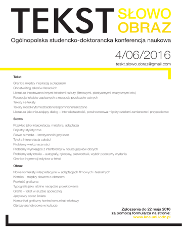 4/06/2016 [email protected] Tekst Granica między inspiracją a plagiatem Ghostwriting tekstów literackich Literatura inspirowana innymi tekstami kultury (filmowymi, plastycznymi, muzycznymi etc.) Recepcja tekstów zapisanych a recepcja przekazów ustnych Teksty i e-teksty Teksty nieodkryte/niezbadane/zapomniane/zakazane Literatura jako nieustający dialog – intertekstualność, powinowactwa między dziełami zamierzone i przypadkowe Słowo Przekład jako interpretacja, metafora, adaptacja Rejestry stylistyczne Słowo a media – kreatywność językowa Tytuł a interpretacja całości Problemy wieloznaczności Problemy wynikające z interferencji w nauce języków obcych Problemy edytorskie – autografy, rękopisy, pierwodruki, wybór podstawy wydania Granice ingerencji edytora w tekst Obraz Nowe konteksty interpretacyjne w adaptacjach filmowych i teatralnych Komiks – między słowem a obrazem Powieść graficzna Typografia jako istotne narzędzie projektowania Graffiti – tekst w służbie społecznej Językowy obraz świata Komunikat graficzny kontra komunikat tekstowy Obrazy archetypowe w kulturze Zgłoszenia do 22 maja 2016 za pomocą formularza na stronie: www.kne.uni.lodz.pl