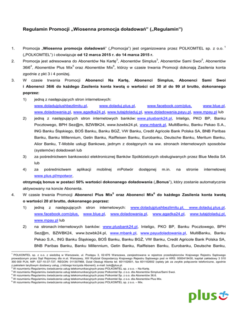 Regulamin Promocji „Wiosenna promocja doładowań” („Regulamin”) 1. Promocja „Wiosenna promocja doładowań” („Promocja”) jest organizowana przez POLKOMTEL sp. z o.o. 1 („POLKOMTEL”) i obowiązuje od 12 marca 2015 r. do 14 marca 2015 r. 2. 2 3 3 Promocja jest adresowana do Abonentów Na Kartę , Abonentów Simplus , Abonentów Sami Swoi , Abonentów 4 5 6 36i6 , Abonentów Plus Mix oraz Abonentów Mix , którzy w czasie trwania Promocji dokonają Zasilenia konta zgodnie z pkt 3 i 4 poniżej. 3. W czasie trwania Promocji Abonenci Na Kartę, Abonenci Simplus, Abonenci Sami Swoi i Abonenci 36i6 do każdego Zasilenia konta kwotą o wartości od 30 zł do 99 zł brutto, dokonanego poprzez: 1) jedną z następujących stron internetowych: www.doladujplushbezlimitu.pl, www.doladuj.plus.pl, www.facebook.com/plus, www.blue.pl, www.doladowania.pl, www.agadka24.pl, www.tutajdoladuj.pl, www.doladowania.payu.pl, www.mpay.pl lub 2) jedną z następujących stron internetowych banków: www.plusbank24.pl, Inteligo, PKO BP, Banku Pocztowego, BPH Sez@m, BZWBK24, www.bzwbk24.pl, www.mbank.pl, MultiBanku, Banku Pekao S.A., ING Banku Śląskiego, BOŚ Banku, Banku BGŻ, VW Banku, Credit Agricole Bank Polska SA, BNB Paribas Banku, Banku Millennium, Getin Banku, Raiffeisen Banku, Eurobanku, Deutsche Banku, Meritum Banku, Alior Banku, T-Mobile usługi Bankowe, jednym z dostępnych na ww. stronach internetowych sposobów (systemów) doładowań lub 3) za pośrednictwem bankowości elektronicznej Banków Spółdzielczych obsługiwanych przez Blue Media SA lub 4) za pośrednictwem aplikacji mobilnej mPotwór dostępnej m.in. na stronie internetowej www.plus.pl/mpotwor, otrzymają bonus w postaci 50% wartości dokonanego doładowania („Bonus”), który zostanie automatycznie aktywowany na koncie Abonenta. 4. 5 6 W czasie trwania Promocji Abonenci Plus Mix oraz Abonenci Mix do każdego Zasilenia konta kwotą o wartości 20 zł brutto, dokonanego poprzez: 1) jedną z następujących www.facebook.com/plus, stron internetowych: www.blue.pl, www.doladujplushbezlimitu.pl, www.doladowania.pl, www.agadka24.pl, www.doladuj.plus.pl, www.tutajdoladuj.pl, www.mpay.pl lub 2) na stronach internetowych banków: www.plusbank24.pl, Inteligo, PKO BP, Banku Pocztowego, BPH Sez@m, BZWBK24, www.bzwbk24.pl, www.mbank.pl, www.payudoladowania.pl, MultiBanku, Banku Pekao S.A., ING Banku Śląskiego, BOŚ Banku, Banku BGŻ, VW Banku, Credit Agricole Bank Polska SA, BNB Paribas Banku, Banku Millennium, Getin Banku, Raiffeisen Banku, Eurobanku, Deutsche Banku, 1 POLKOMTEL sp. z o.o. z siedzibą w Warszawie, ul. Postępu 3, 02-676 Warszawa, zarejestrowana w rejestrze przedsiębiorców Krajowego Rejestru Sądowego prowadzonym przez Sąd Rejonowy dla m.st. Warszawy, XIII Wydział Gospodarczy Krajowego Rejestru Sądowego pod nr KRS: 0000419430, kapitał zakładowy 3 510 300 000 PLN, NIP: 527-10-37-727, REGON: 011307968, Dział Obsługi Klienta tel. 601102601, fax 601102602 (opłaty jak za zwykłe połączenie telefoniczne, zgodnie z pakietem taryfowym dostawcy usług, z którego korzysta Abonent), e-mail: [email protected]. 2 W rozumieniu Regulaminu świadczenia usług telekomunikacyjnych przez POLKOMTEL sp. z o.o. – Na Kartę. 3 W rozumieniu Regulaminu świadczenia usług telekomunikacyjnych przez Polkomtel Sp. z o.o. dla Abonentów Simplus/Sami Swoi. 4 W rozumieniu Regulaminu świadczenia usług telekomunikacyjnych przez Polkomtel Sp. z o.o. dla Abonentów 36.6. 5 W rozumieniu Regulaminu świadczenia usług telekomunikacyjnych przez Polkomtel Sp. z o.o. dla Abonentów Plus Mix. 6 W rozumieniu Regulaminu świadczenia usług telekomunikacyjnych przez POLKOMTEL sp. z o.o. – Mix. Meritum Banku, Alior Banku, T-Mobile usługi Bankowe; jednym z dostępnych na ww. stronach internetowych sposobów (systemów) doładowań lub 3) za pośrednictwem bankowości elektronicznej Banków Spółdzielczych obsługiwanych przez Blue Media SA lub 4) za pośrednictwem aplikacji mobilnej mPotwór dostępnej na stronie internetowej www.plus.pl/mpotwor, otrzymają bonus w postaci 50% wartości dokonanego doładowania („Bonus”), który zostanie automatycznie aktywowany na koncie Abonenta. 5. Bonus nie przedłuża Okresu ważności dla Usług wychodzących. 6. Bonus może być wykorzystany na wszystkie usługi telekomunikacyjne dostępne dla danego Abonenta określonego w pkt 2 Regulaminu zgodnie z taryfą, z której korzysta. 7. W kwestiach nieuregulowanych Regulaminem zastosowanie mają odpowiednio postanowienia Regulaminu świadczenia usług telekomunikacyjnych przez POLKOMTEL Sp. z o.o. dla Abonentów Simplus/Sami Swoi (dla umów zawartych przed 25.12.2014r.), Regulaminu świadczenia usług telekomunikacyjnych przez POLKOMTEL Sp. z o.o. dla Abonentów 36.6 (dla umów zawartych przed 25.12.2014r.), Regulaminu świadczenia usług telekomunikacyjnych przez POLKOMTEL sp. z o.o. – Na Kartę (dla umów zawartych od 25.12.2014 r.), Regulaminu świadczenia usług telekomunikacyjnych przez POLKOMTEL Sp. z o.o. dla Abonentów Plus Mix (dla umów zawartych przed 25.12.2014 r.) lub Regulaminu świadczenia usług telekomunikacyjnych przez POLKOMTEL sp. z o.o. – Mix (dla umów zawartych przed 25.12.2014 r.), o ile Regulamin nie stanowi inaczej. 8. POLKOMTEL może zakończyć świadczenie usług w ramach aktywowanej Promocji lub dokonać zmiany warunków Promocji na podstawie wypowiedzenia dokonanego na 30 dni przed zakończeniem Promocji lub wejściem w życie nowych warunków Promocji. Wypowiedzenie nastąpi SMS-em wysłanym na numer telefonu Abonenta, który skorzystał z Promocji. 9. Informacja o odwołaniu Promocji zostanie podana przez Polkomtel do wiadomości publicznej na stronie internetowej www.plus.pl oraz na stronach internetowych www.doladuj.plus.pl, www.facebook.com/plus. 10. Regulamin jest dostępny na stronach internetowych: www.plus.pl i www.facebook.com/plus, w siedzibie POLKOMTEL oraz w Punktach Sprzedaży i Salonach Firmowych s