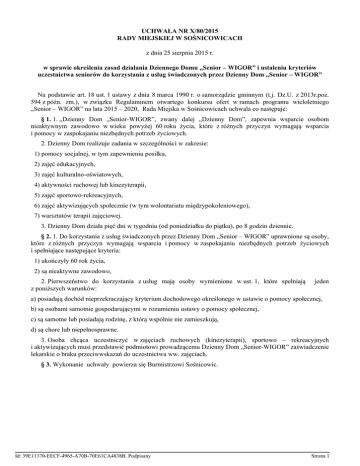 UCHWAŁA NR X/80/2015 RADY MIEJSKIEJ W SOŚNICOWICACH z dnia 25 sierpnia 2015 r. w sprawie określenia zasad działania Dziennego Domu „Senior – WIGOR” i ustaleniu kryteriów uczestnictwa seniorów do korzystania z usług świadczonych przez Dzienny Dom „Senior – WIGOR” Na podstawie art. 18 ust. 1 ustawy z dnia 8 marca 1990 r. o samorządzie gminnym (t.j. Dz.U. z 2013r.poz. 594 z późn. zm.), w związku Regulaminem otwartego konkursu ofert w ramach programu wieloletniego „Senior – WIGOR” na lata 2015 – 2020, Rada Miejska w Sośnicowicach uchwala co następuje: § 1. 1. „Dzienny Dom „Senior-WIGOR”, zwany dalej „Dzienny Dom”, zapewnia wsparcie osobom nieaktywnym zawodowo w wieku powyżej 60 roku życia, które z różnych przyczyn wymagają wsparcia i pomocy w zaspokajaniu niezbędnych potrzeb życiowych. 2. Dzienny Dom realizuje zadania w szczególności w zakresie: 1) pomocy socjalnej, w tym zapewnieniu posiłku, 2) zajęć edukacyjnych, 3) zajęć kulturalno-oświatowych, 4) aktywności ruchowej lub kinezyterapii, 5) zajęć sportowo-rekreacyjnych, 6) zajęć aktywizujących społecznie (w tym wolontariatu międzypokoleniowego), 7) warsztatów terapii zajęciowej. 3. Dzienny Dom działa pięć dni w tygodniu (od poniedziałku do piątku), po 8 godzin dziennie. § 2. 1. Do korzystania z usług świadczonych przez Dzienny Dom „Senior – WIGOR” uprawnione są osoby, które z różnych przyczyn wymagają wsparcia i pomocy w zaspokajaniu niezbędnych potrzeb życiowych i spełniające następujące kryteria: 1) ukończyły 60 rok życia, 2) są nieaktywne zawodowo, 2. Pierwszeństwo do korzystania z usług mają osoby wymienione w ust. 1, które spełniają z poniższych warunków: jeden a) posiadają dochód nieprzekraczający kryterium dochodowego określonego w ustawie o pomocy społecznej, b) są osobami samotnie gospodarującymi w rozumieniu ustawy o pomocy społecznej, c) są samotne lub posiadają rodzinę, z którą wspólnie nie zamieszkują, d) są chore lub niepełnosprawne. 3. Osoba chcąca uczestniczyć w zajęciach ruchowych (kinezyterapii), sportowo – rekreacyjnych i aktywizujących musi przedstawić podmiotowi prowadzącemu Dzienny Dom „Senior-WIGOR” zaświadczenie lekarskie o braku przeciwwskazań do uczestnictwa ww. zajęciach. § 3. Wykonanie uchwały powierza się Burmistrzowi Sośnicowic. Id: 39E11370-EECF-4965-A70B-70E61CA4838B. Podpisany Strona 1 § 4. Uchwała wchodzi w życie z dniem podjęcia i podlega publikacji w Biuletynie Informacji Publicznej. Przewodnicząca Rady Miejskiej w Sośnicowicach Regina Bargiel Id: 39E11370-EECF-4965-A70B-70E61CA4838B. Podpisany Strona 2