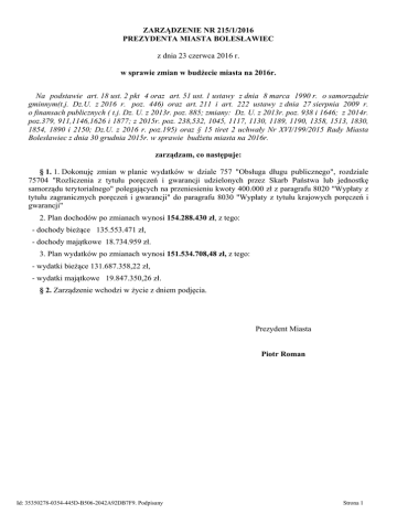 ZARZĄDZENIE NR 215/1/2016 PREZYDENTA MIASTA BOLESŁAWIEC z dnia 23 czerwca 2016 r. w sprawie zmian w budżecie miasta na 2016r. Na podstawie art. 18 ust. 2 pkt 4 oraz art. 51 ust. 1 ustawy z dnia 8 marca 1990 r. o samorządzie gminnym(t.j. Dz.U. z 2016 r. poz. 446) oraz art. 211 i art. 222 ustawy z dnia 27 sierpnia 2009 r. o finansach publicznych ( t.j. Dz. U. z 2013r. poz. 885; zmiany: Dz. U. z 2013r. poz. 938 i 1646; z 2014r. poz.379, 911,1146,1626 i 1877; z 2015r. poz. 238,532, 1045, 1117, 1130, 1189, 1190, 1358, 1513, 1830, 1854, 1890 i 2150; Dz.U. z 2016 r. poz.195) oraz § 15 tiret 2 uchwały Nr XVI/199/2015 Rady Miasta Bolesławiec z dnia 30 grudnia 2015r. w sprawie budżetu miasta na 2016r. zarządzam, co następuje: § 1. 1. Dokonuję zmian w planie wydatków w dziale 757 "Obsługa długu publicznego", rozdziale 75704 "Rozliczenia z tytułu poręczeń i gwarancji udzielonych przez Skarb Państwa lub jednostkę samorządu terytorialnego" polegających na przeniesieniu kwoty 400.000 zł z paragrafu 8020 "Wypłaty z tytułu zagranicznych poręczeń i gwarancji" do paragrafu 8030 "Wypłaty z tytułu krajowych poręczeń i gwarancji" 2. Plan dochodów po zmianach wynosi 154.288.430 zł, z tego: - dochody bieżące 135.553.471 zł, - dochody majątkowe 18.734.959 zł. 3. Plan wydatków po zmianach wynosi 151.534.708,48 zł, z tego: - wydatki bieżące 131.687.358,22 zł, - wydatki majątkowe 19.847.350,26 zł. § 2. Zarządzenie wchodzi w życie z dniem podjęcia. Prezydent Miasta Piotr Roman Id: 35350278-0354-445D-B506-2042A92DB7F9. Podpisany Strona 1 UZASADNIENIE do zarządzenia Prezydenta Miasta Nr 215/1/2016 z dnia 23 czerwca 2016 r. w sprawie zmian w budżecie miasta na 2016 r. Dokonuje się zmian w budżecie miasta na 2016 rok polegających na: przeniesieniu planu wydatków wynikającego ze zmiany klasyfikacji budżetowej. Prezydent Miasta Piotr Roman Id: 35350278-0354-445D-B506-2042A92DB7F9. Podpisany Strona 1