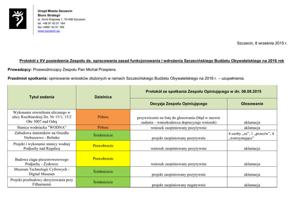 Urząd Miasta Szczecin Biuro Strategii pl. Armii Krajowej 1, 70-456 Szczecin tel. +48 91 43 51 164 fax +4891 43 51 165 www.szczecin.eu Szczecin, 8 września 2015 r. Protokół z XV posiedzenia Zespołu ds. opracowania zasad funkcjonowania i wdrożenia Szczecińskiego Budżetu Obywatelskiego na 2016 rok Prowadzący: Przewodniczący Zespołu Pan Michał Przepiera. Przedmiot spotkania: opiniowanie wniosków złożonych w ramach Szczecińskiego Budżetu Obywatelskiego na 2016 r. – uzupełnienia. Protokół ze spotkania Zespołu Opiniującego w dn. 08.09.2015 Tytuł zadania Dzielnica Decyzja Zespołu Opiniującego Wykonanie oświetlenia ulicznego w ulicy Rzeźbiarskiej Dz. Nr 15/1; 15/2 Obr 3007 nad Odrą Stanica wodniacka "WODNA" Zabudowa śmietników na Osiedlu Niebuszewo - Bolinko Północ Północ Śródmieście Projekt i wykonanie stanicy wodnej Podjuchy nad Regalicą Prawobrzeże Budowa ciągu pieszorowerowego Podjuchy - Żydowce Muzeum Technologii Cyfrowych Digital Museum Projekt przebudowy skrzyżowania przy Filharmonii Prawobrzeże Śródmieście Śródmieście przywrócenie na listę do głosowania (błąd w nazwie zadania – wnioskodawca doprecyzuje wniosek) wniosek zaopiniowany pozytywnie Głosowanie projekt zaopiniowany pozytywnie aklamacja aklamacja 4 osoby „za”, 1 „przeciw”, 4 „wstrzymujące” wniosek zaopiniowany pozytywnie aklamacja wniosek zaopiniowany pozytywnie aklamacja projekt zaopiniowany pozytywnie aklamacja projekt zaopiniowany negatywnie aklamacja Likwidacja torowiska znajdującego się na terenie między ulicą Santocką i Kordeckiego. Wyrównanie terenu i przygotowanie gruntu pod park rekreacji i wypoczynku Zachód Utworzenie strefy 30 w obrębie ulic Reymonta, Przybyszewskiego i Grzegorza z Sanoka na Pogodnie Zachód Piesza rewolucja - poprawa warunków ruchu pieszych w dzielnicy Zachód na ulicach Taczaka, Derdowskiego, 26 Kwietnia, Santockiej, Ku Słońcu, Kupczyka Zachód Polepszenie infrastruktury obiektu sportowego - boisko z syntetyczną nawierzchnią ul. Witkiewicza Śródmieście Piesza rewolucja - Wilcza, Przyjaciół Ronda, Sczanieckiej, Wszystkich Świętych, Obotrycka Północ Przebudowa ulicy Wiosny Ludów Zachód „Nowoczesna szkoła” – czyli meblujemy i wyposażamy w pomoce szkołę podstawową nr 59 w Szczecinie przy ul. Dąbskiej 105 Prawobrzeże odwołanie wnioskodawców po odrzuceniu projektu przez Zespół, sprawa nierozstrzygnięta, indywidualne spotkanie Przewodniczącego Zespołu z wnioskodawcami projekt zaopiniowany pozytywnie aklamacja projekt zaopiniowany pozytywnie aklamacja we wskazanej lokalizacji przez wnioskodawcę projekt niemożliwy do realizacji; sprawa nierozstrzygnięta projekt zaopiniowany pozytywnie odwołanie wnioskodawców po odrzuceniu projektu przez Zespół; po doprecyzowaniu zakresu projektu przez wnioskodawców do ponownej weryfikacji przez wydział merytoryczny projekt wycofany Mini Zoo nad Jeziorem Szmaragdowym Prawobrzeże sprawa nierozstrzygnięta, Zespół nie podjął decyzji ze względu na lokalizację wykonania projektu aklamacja Adaptacja obiektu przy ul. Miłej na potrzeby niekomercyjnej miejskiej strzelnicy sportowej Prawobrzeże przywrócenie projektu przez Zespół na listę do głosowania Ustalenia organizacyjne: Termin kolejnego posiedzenia Zespołu wyznaczono na dzień 14 września 2015 r. (poniedziałek). 10 osób „za”, 0 „przeciw”, 0 „wstrzymujących”