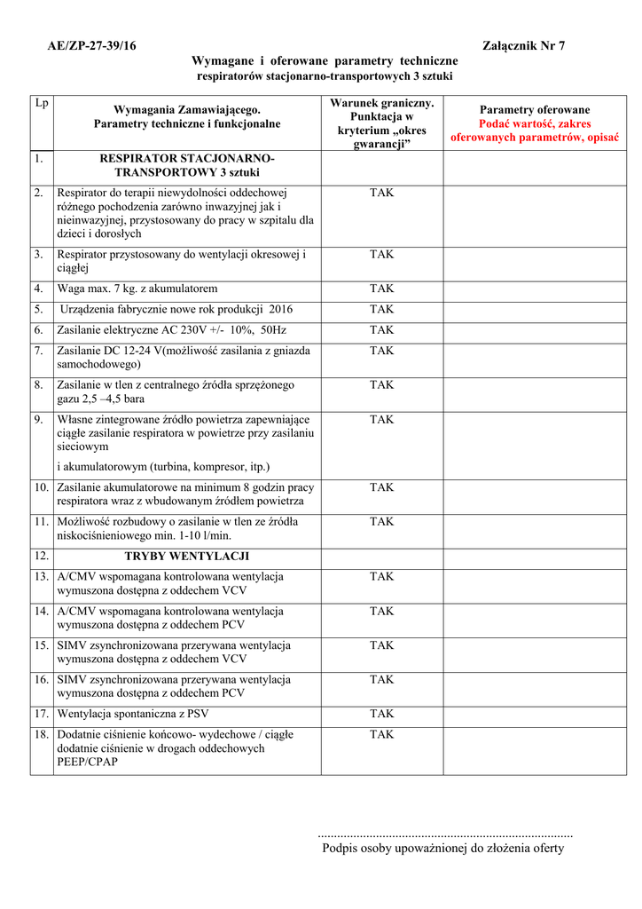 AE/ZP-27-39/16 Załącznik Nr 7 Wymagane i oferowane parametry techniczne respiratorów stacjonarno-transportowych 3 sztuki Lp Wymagania Zamawiającego. Parametry techniczne i funkcjonalne Warunek graniczny. Punktacja w kryterium „okres gwarancji” 1. RESPIRATOR STACJONARNOTRANSPORTOWY 3 sztuki 2. Respirator do terapii niewydolności oddechowej różnego pochodzenia zarówno inwazyjnej jak i nieinwazyjnej, przystosowany do pracy w szpitalu dla dzieci i dorosłych TAK 3. Respirator przystosowany do wentylacji okresowej i ciągłej TAK 4. Waga max. 7 kg. z akumulatorem TAK 5. Urządzenia fabrycznie nowe rok produkcji 2016 TAK 6. Zasilanie elektryczne AC 230V +/- 10%, 50Hz TAK 7. Zasilanie DC 12-24 V(możliwość zasilania z gniazda samochodowego) TAK 8. Zasilanie w tlen z centralnego źródła sprzężonego gazu 2,5 –4,5 bara TAK 9. Własne zintegrowane źródło powietrza zapewniające ciągłe zasilanie respiratora w powietrze przy zasilaniu sieciowym TAK Parametry oferowane Podać wartość, zakres oferowanych parametrów, opisać i akumulatorowym (turbina, kompresor, itp.) 10. Zasilanie akumulatorowe na minimum 8 godzin pracy respiratora wraz z wbudowanym źródłem powietrza TAK 11. Możliwość rozbudowy o zasilanie w tlen ze źródła niskociśnieniowego min. 1-10 l/min. TAK 12. TRYBY WENTYLACJI 13. A/CMV wspomagana kontrolowana wentylacja wymuszona dostępna z oddechem VCV TAK 14. A/CMV wspomagana kontrolowana wentylacja wymuszona dostępna z oddechem PCV TAK 15. SIMV zsynchronizowana przerywana wentylacja wymuszona dostępna z oddechem VCV TAK 16. SIMV zsynchronizowana przerywana wentylacja wymuszona dostępna z oddechem PCV TAK 17. Wentylacja spontaniczna z PSV TAK 18. Dodatnie ciśnienie końcowo- wydechowe / ciągłe dodatnie ciśnienie w drogach oddechowych PEEP/CPAP TAK ............................................................................... Podpis osoby upoważnionej do złożenia oferty 19. Wentylacja przy bezdechu TAK 20. Wentylacja nieinwazyjna NIV TAK 21. RODZAJE ODDECH WYMUSZONEGO 22. Oddech spontaniczny wspomagany ciśnieniem PSV TAK 23. CPAP ciągłe dodatnie ciśnienie w drogach oddechowych TAK 24. PARAMETRY REGULOWANE 25. Częstość oddechów w trybach kontrolowanych min. 1-90 oddechów/min. TAK 26. Objętość pojedynczego oddechu w zakresie min. 502000 mi. TAK 27. Czas trwania wdechu TI min. 0.1 – 3 .0 sek. TAK 28. Przepływ fazy wdechowej min. 6-100 litrów/ min. TAK 29. Szczytowe ciśnienie wdechowe min.5-60 cm H2O TAK 30. Ciśnienie wspomagane PSV min. 0-60 cm H2O TAK 31. PEEP/CPAP min. 0-30 cm H2O TAK 32. Trigger wdechowy ciśnieniowy min. 0.1–9.9 cm H2O TAK 33. Trigger wdechowy przepływowy min. 0.1–10 litrów / min. 34. Regulacja czasu narastania ciśnienia min.10 poziomów TAK 35. Regulacja czułości wydechowej min. 10% do 70% TAK 36. Możliwość wyboru krzywej przepływu dla oddechów obowiązkowych objętościowo kontrolowanych min. prostokątna i opadająca TAK 37. Oddech ręczny TAK 38. TAK MONITOR 39. Kolorowy dotykowy ekran LCD o przekątnej min. 6 cali TAK 40. Graficzna prezentacja ciśnienia, przepływu i objętości w funkcji czasu TAK 41. Możliwość jednoczesnego wyświetlania 3 krzywych na ekranie monitora TAK 42. Prezentacja na ekranie trendów monitorowanych parametrów min. 24 godzinnych TAK 43. POMIARY PARAMETRÓW WENTYLACJI 44. Pomiar ciśnienia szczytowego Ppeek TAK 45. Pomiar ciśnienia średniego Pmean TAK ............................................................................... Podpis osoby upoważnionej do złożenia oferty 46. Pomiar ciśnienia końcowo-wydechowego PEEP TAK 47. Pomiar całkowitej częstości oddychania TAK 48. Pomiar rzeczywistej wydechowej objętości pojedynczego oddechu TAK 49. Pomiar rzeczywistej wydechowej objętości minutowej TAK 50. Pomiar wdechowego przepływu szczytowego TAK 51. Pomiar I:E TAK 52. Pomiar stężenia wdechowego tlenu TAK 53. Wyświetlanie kalkulowanej wartości pozostałego czasu pracy na akumulatorze, oraz czasu do opróżnienia butli z tlenem TAK 54. ALARMY 55. Hierarchia alarmów w zależności od ważności TAK 56. Alarm zaniku zasilania sieciowego TAK 57. Alarm zaniku zasilania akumulatorowego TAK 58. Alarm wysokiego lub niskiego poziomu stężenia tlenu w ramieniu wdechowym TAK 59. Alarm wysokiej minutowej objętości oddechowej TAK 60. Alarm niskiej minutowej objętości oddechowej TAK 61. Alarm wysokiego ciśnienia wdechowego TAK 62. Alarm niskiego ciśnienia wdechowego TAK 63. Alarm bezdechu TAK 64. Alarm wysokiej częstości oddechowej TAK 65. Alarm wysokiej objętości pojedynczego oddechu TAK 66. Możliwość przeglądania zapamiętanych zaistniałych alarmów 67. POŻĄDANE FUNKCJE I WYMAGANE WYPOSARZENIE DODATKOWE 68. Zabezpieczenie przed przypadkową zmianą parametrów wentylacji 69. Możliwość zapamiętania min. 3 konfiguracji nastaw dla różnych pacjentów 70. Zestaw jednorazowych obwodów oddechowych dostosowanych do respiratora – 10 sztuk 71. Stojak na kółkach min. 2 koła blokowane TAK 72. Ramię do podtrzymywania układu pacjenta TAK 73. Statyw jezdny z uchwytem na butlę, aluminiową butlą tlenową i reduktorem na szybkozłącze TAK TAK TAK TAK TAK ............................................................................... Podpis osoby upoważnionej do złożenia oferty Pozostałe wymagania 74. Dostawa urządzeń w terminie do 28 dni od daty podpisania umowy. 75. Instrukcje obsługi w języku polskim wraz z dostawą urządzeń. 76. Szkolenie pracowników w siedzibie Zamawiającego w zakresie obsługi dostarczonych urządzeń w dniu protokolarnego odbioru uruchomionych urządzeń lub w terminie poprzedzającym odbiór wyznaczonym przez Zamawiającego w porozumieniu z Wykonawcą. 77. Do oferty należy dołączyć materiały informacyjne w języku polskim dotyczące oferowanego przedmiotu zamówienia oraz jego zdjęcie (fotografię). 78. Pełna gwarancja minimum 24 miesiące na dostarczone urządzenia od dnia protokolarnego odbioru ur