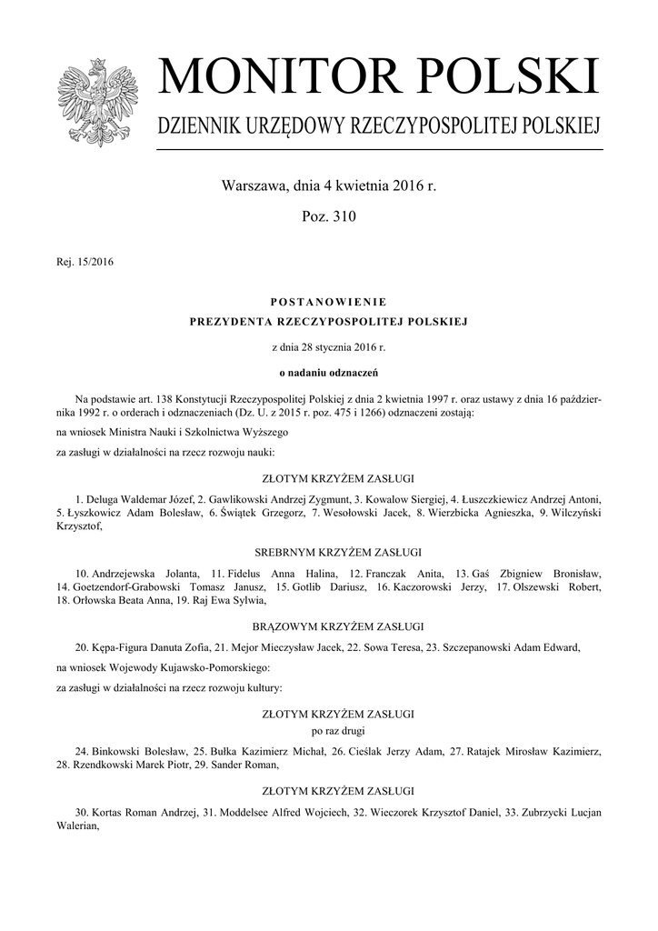 MONITOR POLSKI DZIENNIK URZĘDOWY RZECZYPOSPOLITEJ POLSKIEJ Warszawa, dnia 4 kwietnia 2016 r. Poz. 310 Rej. 15/2016 POSTANOWIENIE PREZYDENTA RZECZYPOSPOLITEJ POLSKIEJ z dnia 28 stycznia 2016 r. o nadaniu odznaczeń Na podstawie art. 138 Konstytucji Rzeczypospolitej Polskiej z dnia 2 kwietnia 1997 r. oraz ustawy z dnia 16 października 1992 r. o orderach i odznaczeniach (Dz. U. z 2015 r. poz. 475 i 1266) odznaczeni zostają: na wniosek Ministra Nauki i Szkolnictwa Wyższego za zasługi w działalności na rzecz rozwoju nauki: ZŁOTYM KRZYŻEM ZASŁUGI 1. Deluga Waldemar Józef, 2. Gawlikowski Andrzej Zygmunt, 3. Kowalow Siergiej, 4. Łuszczkiewicz Andrzej Antoni, 5. Łyszkowicz Adam Bolesław, 6. Świątek Grzegorz, 7. Wesołowski Jacek, 8. Wierzbicka Agnieszka, 9. Wilczyński Krzysztof, SREBRNYM KRZYŻEM ZASŁUGI 10. Andrzejewska Jolanta, 11. Fidelus Anna Halina, 12. Franczak Anita, 13. Gaś Zbigniew Bronisław, 14. Goetzendorf-Grabowski Tomasz Janusz, 15. Gotlib Dariusz, 16. Kaczorowski Jerzy, 17. Olszewski Robert, 18. Orłowska Beata Anna, 19. Raj Ewa Sylwia, BRĄZOWYM KRZYŻEM ZASŁUGI 20. Kępa-Figura Danuta Zofia, 21. Mejor Mieczysław Jacek, 22. Sowa Teresa, 23. Szczepanowski Adam Edward, na wniosek Wojewody Kujawsko-Pomorskiego: za zasługi w działalności na rzecz rozwoju kultury: ZŁOTYM KRZYŻEM ZASŁUGI po raz drugi 24. Binkowski Bolesław, 25. Bułka Kazimierz Michał, 26. Cieślak Jerzy Adam, 27. Ratajek Mirosław Kazimierz, 28. Rzendkowski Marek Piotr, 29. Sander Roman, ZŁOTYM KRZYŻEM ZASŁUGI 30. Kortas Roman Andrzej, 31. Moddelsee Alfred Wojciech, 32. Wieczorek Krzysztof Daniel, 33. Zubrzycki Lucjan Walerian, Monitor Polski –2– Poz. 310 SREBRNYM KRZYŻEM ZASŁUGI 34. Kubicki Ludwik, 35. Mazur Elżbieta, 36. Podciborski Jarosław Eugeniusz, 37. Sidłowski Paweł Piotr, 38. Szopa Arkadiusz, BRĄZOWYM KRZYŻEM ZASŁUGI 39. Czechowski Krzysztof, 40. Felczak Maciej, 41. Jargiło Wiktor, 42. Kosik Karol, 43. Napierski Wiesław Tomasz, 44. Rezmer Krystian Antoni, 45. Rybacki Władysław, 46. Wieczorek Józef, za zasługi w działalności na rzecz kształtowania postaw obywatelskich i pogłębiania świadomości historycznej młodego pokolenia ZŁOTYM KRZYŻEM ZASŁUGI 47. Małachowski Edward, za zasługi w działalności na rzecz rozwoju amatorskiego ruchu muzycznego: ZŁOTYM KRZYŻEM ZASŁUGI 48. Nogacki Zbigniew Wojciech, 49. Szczepański Edmund, SREBRNYM KRZYŻEM ZASŁUGI 50. Filasiński Krzysztof Mariusz, na wniosek Wojewody Podkarpackiego za zasługi w upowszechnianiu i kultywowaniu tradycji ludowych BRĄZOWYM KRZYŻEM ZASŁUGI 51. Bura Kazimiera, 52. Szajner Józefa, 53. Szałankiewicz Krystyna, 54. Szul Kazimiera, 55. Szyndlar Lidwina. Prezydent Rzeczypospolitej Polskiej: A. Duda