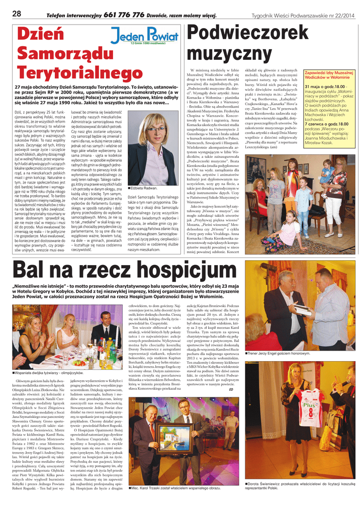 28 Telefon interwencyjny 661 776 776 Dzwońcie, razem możemy więcej. Dzień Samorządu Terytorialnego 27 maja obchodzimy Dzień Samorządu Terytorialnego. To święto, ustanowione przez Sejm RP w 2000 roku, upamiętnia pierwsze demokratyczne (a w zasadzie pierwsze w powojennej Polsce) wybory samorządowe, które odbyły się właśnie 27 maja 1990 roku. Jakież to wszystko było dla nas nowe... Dziś, z perspektywy 25 lat funkcjonowania wolnej Polski, można stwierdzić, że ze wszystkich reform okresu transformacji to właśnie reaktywacja samorządu terytorialnego była jednym z ważniejszych sukcesów Polski. To nasz wspólny sukces. Zaczynając od tych, którzy poświęcili swoje życie i szczęście swoich bliskich, abyśmy dzisiaj mogli żyć w wolnej Polsce, przez wspaniałych ludzi aktywizujących i uczących lokalne społeczności co to jest samorząd, a na mieszkańcach polskich miast i gmin kończąc. Naturalnie o tym, że nasze społeczeństwo jest dziś bardziej świadome i wymagające niż w 1990 roku chyba nikogo nie trzeba przekonywać. To bardzo dobry symptom i miejmy nadzieję, że ta świadomość mieszkańców z roku na rok będzie się tylko zwiększać. Samorząd terytorialny rozumiany w sensie dosłownym sprawdził się, ale nie może stać w miejscu i musi iść do przodu. Musi ewaluować bo zmieniają się realia – i te polityczne i te gospodarcze. Musi ewaluować, bo konieczne jest dostosowanie do wymogów prawnych, czy przepisów unijnych, wreszcie musi ewa- luować bo zmienia się świadomość i potrzeby naszych mieszkańców. Administracja samorządowa musi się dostosowywać do takich potrzeb. Czy nasz głos zostanie usłyszany, czy samorząd będzie się zmieniał z nami i dla nas, w dużej mierze zależy jednak od nas samych i właśnie od tego jakie władze wybierzemy. Już sama zmiana - ujęta w kodeksie wyborczym - w sposobie wybierania radnych do gmin w okręgach jednomandatowych to pierwszy krok do wyłonienia odpowiedzialnego za swój teren radnego. Takiego radnego, który zna prawie wszystkich ludzi i ich potrzeby w danym okręgu, zna każdą ulicę i ścieżkę. Tym samym, choć nie przebrzmiały jeszcze echa wyborów do Parlamentu Europejskiego, w sposób naturalny i dość płynny przechodzimy do wyborów samorządowych. Mimo, że nie są to tak „medialne” w skali kraju wybory jak chociażby prezydenckie czy parlamentarne, to są one dla nas wyjątkowo ważne, bowiem tutaj, na dole – w gminach, powiatach – kształtuje się nasza codzienna rzeczywistość. Elżbieta Radwan. Dzień Samorządu Terytorialnego także o tym nam przypomina. Dlatego też z okazji dnia Samorządu Terytorialnego życzę wszystkim Państwu świadomych wyborów i poczucia, że władze gmin czy powiatu szanują Państwa zdanie i liczą się z Państwa głosem. Samorządowcom zaś życzę pokory, cierpliwości i roztropności w codziennej służbie naszym mieszkańcom. Tygodnik Wieści Podwarszawskie nr 22/2014 Podwieczorek muzyczny W minioną niedzielę w Izbie Muzealnej Wodiczków odbył się drugi w tym roku koncert muzyki poważnej dla najmłodszych, pn. „Podwieczorki muzyczne dla dzieci”. Wystąpiły dwie artystki: Anna Kornacka z Wołomina - pianistka i Beata Kierzkowska z Warszawy - flecistka. Obie są absolwentkami Akademii Muzycznej im. Fryderyka Chopina w Warszawie. Koncertowały w kraju i zagranicą. Anna Kornacka ukończyła również studia uzupełniające na Uniwersytecie J. Gutenberga w Mainz i brała udział w kursach mistrzowskich w Polsce, Niemczech, Szwajcarii i Hiszpanii. Wielokrotnie akompaniowała artystom występującym w Izbie Wodiczków, a także zainaugurowała „Podwieczorki muzyczne”. Beata Kierzkowska (studia podyplomowe na UW na wydz. zarządzania dla twórców, artystów i animatorów kultury) jest dyplomowanym nauczycielem, uczy gry na flecie, a także jest doradcą metodycznym w sekcji instrumentów dętych. Uczy w Państwowej Szkole Muzycznej w Warszawie. Jako że majowy koncert był zatytułowany „Wiosna w muzyce”, nie mogło zabraknąć takich utworów jak „Przybywaj piękna wiosno” Mozarta, „Pieśni wiosennej” Mendelssohna czy „Wiosny” z cyklu Cztery pory roku Vivaldiego. Anna Kornacka i Beata Kierzkowska zaprezentowały największych kompozytorów muzyki poważnej w nieco mniej poważnej odsłonie. Koncert składał się głównie z radosnych melodii, będących muzycznymi opisami natury, np. słońca lub burzy. Wśród nich pojawiło się wiele dźwięków naśladujących ptaki i zwierzęta m.in.: „Świstaka” wg Beethovena, „Łabędzia” Czajkowskiego, „Kanarka” Hove’a czy „Taniec lisa” Leo. W przerwach Beata Kierzkowska zadawała najmłodszym wierszyki-zagadki, dotyczące poszczególnych utworów. Na zakończenie muzycznego podwieczorka artystki z okazji Dnia Mamy wspólnie z dziećmi odśpiewały „Piosenkę dla mamy” z repertuaru Leszczyńskiego. (am) Zapowiedzi Izby Muzealnej Wodiczków w Wołominie 31 maja o godz.18.00 inauguracja cyklu „Wołominiacy w podróżach” - pokaz slajdów podróżniczych. O swoich podróżach po Indiach opowiedzą Anna Machowska i Wojciech Łochowski. 7 czerwca o godz.18.00 podczas „Wieczoru poezji śpiewanej” wystąpią: Joanna Mioduchowska i Mirosław Kozak. Bal na rzecz hospicjum „Niemożliwe nie istnieje” - to motto przewodnie charytatywnego balu sportowców, który odbył się 23 maja w Hotelu Gregory w Kobyłce. Dochód z tej niezwykłej imprezy, której organizatorem było stowarzyszenie Jeden Powiat, w całości przeznaczony został na rzecz Hospicjum Opatrzności Bożej w Wołominie. Wspaniała dwójka łyżwiarzy - olimpijczyków. Głównym gościem balu była dwukrotna medalistka zimowych Igrzysk Olimpijskich Luiza Złotkowska. Nie zabrakło również: jej koleżanki z drużyny panczenistek Natalii Czerwonki, złotego medalisty Igrzysk Olimpijskich w Soczi Zbigniewa Bródki, brązowego medalisty z Soczi Jana Szymańskiego oraz pa
