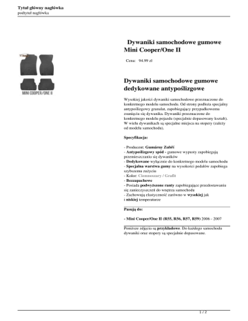 Tytuł główny nagłówka podtytuł nagłówka Dywaniki samochodowe gumowe Mini Cooper/One II Cena: 94.99 zł Dywaniki samochodowe gumowe dedykowane antypoślizgowe Wysokiej jakości dywaniki samochodowe przeznaczone do konkretnego modelu samochodu. Od strony podłoża specjalny antypoślizgowy granulat, zapobiegający przypadkowemu zsunięciu się dywanika. Dywaniki przeznaczone do konkretnego modelu pojazdu (specjalnie dopasowany kształt). W wielu dywanikach są specjalne miejsca na stopery (zależy od modelu samochodu). Specyfikacja: - Producent: Gumárny Zubří - Antypoślizgowy spód - gumowe wypusty zapobiegają przemieszczaniu się dywaników - Dedykowane wyłącznie do konkretnego modelu samochodu - Specjalna warstwa gumy na wysokości pedałów zapobiega szybszemu zużyciu - Kolor: Ciemnoszary / Grafit - Bezzapachowe - Posiada podwyższone ranty zapobiegające przedostawaniu się zanieczyszczeń do wnętrza samochodu - Zachowują elastyczność zarówno w wysokiej jak i niskiej temperaturze Pasują do: - Mini Cooper/One II (R55, R56, R57, R59) 2006 - 2007 Poniższe zdjęcia są przykładowe. Do każdego samochodu dywaniki oraz stopery są specjalnie dopasowane. 1/2 Tytuł główny nagłówka podtytuł nagłówka 2/2 Powered by TCPDF (www.tcpdf.org)