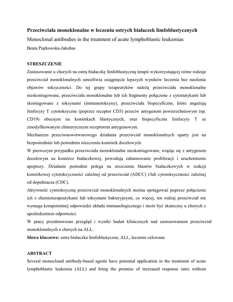 Przeciwciała monoklonalne w leczeniu ostrych białaczek limfoblastycznych Monoclonal antibodies in the treatment of acute lymphoblastic leukemias Beata Piątkowska-Jakubas STRESZCZENIE Zastosowanie u chorych na ostrą białaczkę limfoblastyczną terapii wykorzystującej różne rodzaje przeciwciał monoklonalnych umożliwia osiągnięcie lepszych wyników leczenia bez nasilenia objawów toksyczności. Do tej grupy terapeutyków należą przeciwciała monoklonalne nieskoniugowane, przeciwciała monoklonalne lub ich fragmenty połączone z cytostatykami lub skoniugowane z toksynami (immunotoksyny), przeciwciała bispecyficzne, które angażują limfocyty T cytotoksyczne (poprzez receptor CD3) przeciw antygenom powierzchniowym (np. CD19) obecnym na komórkach blastycznych, oraz bispecyficzne limfocyty T ze zmodyfikowanym chimerycznym receptorem antygenowym. Mechanizm przeciwnowotworowego działania przeciwciał monoklonalnych oparty jest na bezpośrednim lub pośrednim niszczeniu komórek docelowych. W pierwszym przypadku przeciwciała monoklonalne nieskoniugowane, wiążąc się z antygenem docelowym na komórce białaczkowej, powodują zahamowanie proliferacji i uruchomienie apoptozy. Działanie pośrednie polega na niszczeniu blastów białaczkowych w reakcji komórkowej cytotoksyczności zależnej od przeciwciał (ADCC) i/lub cytotoksyczności zależnej od dopełniacza (CDC). Aktywność cytotoksyczną przeciwciał monoklonalnych można spotęgować poprzez połączenie ich z chemioterapeutykami lub toksynami bakteryjnymi, co więcej, ten rodzaj przeciwciał nie wymaga kompetentnej odpowiedzi układu immunologicznego i może być skuteczny u chorych z upośledzeniem odporności. W pracy przedstawiono przegląd i wyniki badań klinicznych nad zastosowaniem przeciwciał monoklonalnych u chorych na ALL. Słowa kluczowe: ostra białaczka limfoblastyczna, ALL, leczenie celowane ABSTRACT Several monoclonal antibody-based agents have potential application in the treatment of acute lymphoblastic leukemia (ALL) and bring the promise of increased response rates without excessive toxicity. These include unconjugated monoclonal antibodies, monoclonal antibodies or fragments linked to cytotoxic agents or conjugated to toxins (immunotoxins), bispecific singlechain antibodies that redirect cytotoxic T lymphocytes (via CD3 expression) to surface ALL antigens (eg. CD19) and bispecific T-cell engagers. Monoclonal antibody-based reagents react with blasts by direct and/or indirect mechanisms. Binding by unconjugated monoclonal antibodies directly induce cytotoxicity through inhibition of proliferation or triggering of cell death pathways. Indirect killing may occur via antibodydependent cell-mediated cytotoxicity and/or complement-dependent cytotoxicity. The cytotoxicity of monoclonal antibodies can increase by linkage to chemotherapy agents and bacterial toxins therefore they do not require active immune response mechanisms for activity and can be effective even in profoundly immunocompromised patients. Herein, we will review the results and status of investigational monoclonal antibody-based therapies in ALL. Keywords: Acute Lymphoblastic Leukaemia, ALL, targeted treatment