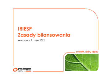 IRIESP Zasady bilansowania Warszawa, 7 maja 2012 system, który łączy Bilansowanie systemu przesyłowego Bilansowanie fizyczne - działania OSP w celu zapewnienia bezpieczeństwa systemu przesyłowego w tym: Rynek y usług g bilansujących ją y p prowadzony yp przez OSP Bilansowanie handlowe – rozliczenie niezbilansowania ZUP wynikające z różnic pomiędzy ilościami przekazanymi i odebranymi do/z systemu przesyłowego; Bilansowanie handlowe obejmuje system przesyłowy i systemy dystrybucyjne; Mechanizm stref dystrybucyjnych system, który łączy Strefa Dystrybucyjna OSP P 1 WPWY OSD WPWE OSD OSD WS WR P WS 2 P WR 3 P 4 P 5 WR P 6 system, który łączy Bilansowanie Zasady ogólne Bilans ZUP Wszystkie k punkty k wejścia: ś 1. Importowe 2. Magazyny 3 Źródła 3. Ź ódł 4. Punkt Wirtualny Wszystkie punkty wyjścia: 1. Odbiorcy (w tym końcowi) przyłączeni do systemu OSP 2. Odbiorcy (w tym końcowi) przyłączeni do systemu OSD przyłączeni do systemu OSD 3. Magazyny 4. Punkt Wirtualny 1 Bilansowane 1. Bil są wszystkie tki punkty kt wejścia jś i i punkty kt wyjścia jś i danego d ZUP (PZ). (PZ) 2. Bilans jest ustalany dla każdej doby. 3. Rozliczenie ilości niezbilansowania p po każdejj dobie. 4. Dobowy Limit Niezbilansowania 5% ilości w punktach wejścia. 4 system, który łączy Bilansowanie Model rynku Wirtualne wyjścia Wirtualne wejścia WPWY WPWY WPWY OTC GG OSP WPWE WPWE WPWE OTC GG OSP WS WR PWE WS WPWY OSD ZUP 1 WR PWE WPWE OSD ZUP 2 WR PWY PWE OSM PWY OSM system, który łączy Alokacje Podmioty dokonujące alokacji Wirtualne wyjścia Wirtualne wejścia WPWY WPWY WPWY OTC GG OSP WPWE WPWE WPWE OTC GG OSP WS OSP WR WS WPWY OSD PWE OSP OSD PWE WR WPWE OSD Odbiorca PWY OSM PWE OSM WR PWY OSM system, który łączy Alokacje Metody alokacji Wirtualne wyjścia Wirtualne wejścia WPWY WPWY WPWY OTC GG OSP WPWE WPWE WPWE OTC GG OSP Pom miar R N R=N Pomiar K.O. PWE R=N ZUP 1 PWE ZUP 2 R N R=N PWY R=N R=N R=N PWE OSM PWY OSM R=N R=N system, który łączy Alokacje Pomiar dla strefy dystrybucyjnej WPWY OSD OSP OSD WPWE OSD P WS WR 1 P WS 2 P WR 3 P 4 P WR 5 P 6 k l P = β=1 Σ Pwy – δ=0 Σ Pwe OSD β δ system, który łączy Alokacje Proces alokacji dla strefy dystrybucyjnej WPWY OSD O SP WPWE OSD P 1 OS D W S W R P W S 2 P 3 W R P 4 P 5 W R P 6 WS WS’ Pom miar OSSD WS WS’ WR WR WR NZB n NZB Σ A i 1 i=1 m WPWY OSD Alokacja wg Alokacja wg pomiaru – i=0 Σ A i 0 WPWE OSD WR Proporcjonalna alokacja dla l k j dl Odbiorców wg profili odbioru k = β=1 Σ P β 1 NZB l MFPWY OSD –δ=0 Σ P δ 0 MFPWE OSD system, który łączy Alokacje Harmonogram wymiany informacji OSP OSW, Odbiorca Alokacje szacunkowych ilości paliwa gazowego 10:00 Alokacja operatywna za poprzednią dobę gazową Przekazanie danych pomiarowych 5. Dzień roboczy miesiąca (M+1) Dane pomiarowe za poprzedni miesiąc gazowy (M) Alokacje rozliczeniowych ilości paliwa gazowego 7. dzień roboczy miesiąca (M+1) Alokacja rozliczeniowa za poprzedni miesiąc gazowy (M) system, który łączy Rynek usług bilansujących Zasady ogólne Rynek usług bilansujących prowadzony przez OSP Uczestnikiem rynku może być tylko ZUP Odrębna umowa o świadczenie usług bilansujących Umowa ramowa Oferty składane na każdy dzień Standardowe usługi systemowe Ilości i ceny dla poszczególnych godzin w dobie której oferta dotyczy Składane droga elektroniczną Podlega regulacjom Prawa o Zamówieniach Publicznych Oferty przyjmowane wg kryteriów: Rodzaj usługi w zależności od potrzeb systemu Dla danego rodzaju usługi wg kryterium ceny dla równoważnych wykorzystywane proporcjonalnie j do ilości w ofercie Realizacja poprzez złożenie odpowiednich (re)nominacji podlegających normalnej procedurze zatwierdzania system, który łączy Rynek usług bilansujących Standardowe usługi systemowe WPWE WPWE OTC GG WPWY WPWY OTC GG 5 FPWE 4 FPWY 3 2 1 WPWY OSP 1. 2 2. 3. 4. 5. WPWE OSP Zakup przez OSP w punkcie wirtualnym S Sprzedaż d ż przez OSP w punkcie k i wirtualnym it l Zakup przez OSP w fizycznym punkcie wejścia Sprzedaż przez OSP w fizycznym punkcie wyjścia Z Zmniejszenie i j i d dostawy t w fi fizycznym punkcie k i wejścia jś i + zakup k od d OSP w WPWEOSP system, który łączy Nominacje Zasady ogólne Nominacje składane na dzień następny Nominacje zawierają informacje: Składający nominację (ZUP) ID punktu którego dotyczy Il ś i godzinowe Ilości d i Kontrahent w punkcie (odbierający lub dostarczający) Dla WPWEGG i WPWYGG nominacje w imieniu ZUP składa Giełda Gazu Ilości godzinowe powinny uwzględniać: wartości przydzielonej zdolności w danym punkcie ograniczenia wynikające z IRiESP lub przepisów prawa Nie wymagane zbilansowanie nominacji poszczególnych ZUP Nominacje podlegają sprawdzeniu z operatorami współpracującymi Zasada mniejszego strumienia system, który łączy Nominacje Przebieg procesu (D-1) ZUP OSP 14:00 OSD, OSM Nominacja (NOMINT) 14:30 15:15 18:00 Nominacja (DELORD) Informacja o wynikach sprawdzenia zgodności nominacji (DELRES) Zatwierdzenie/odrzucenie nominacji (NOMRES) system, który łączy Renominacje Przebieg procesu (D) ZUP OSP H0 OSD, OSM Renominacja (NOMINT) H0 + 45min Renominacja (DELORD) H1 + 45 min Informacja o wynikach sprawdzenia zgodności renominacji (DELRES) H0 + 120 min Zatwierdzenie/ odrzucenie renominacji (NOMRES) H0 – każda pełna godzina H1 – godzina otrzymania przez OSD, OSM renominacji (DELORD) od OSP system, który łączy Prognozy transportowe Składane przez OSD dla MFPWYOSD i MFPWEOSD dla każdej następnej doby d b gazowejj, OSD OSP Codziennie do 14:00 D - 1, Ilości godzinowe, 14:00 D-1 Prognoza transportowa Uwzględniają ograniczenia, 10% tolerancji trafności prognoz. system, który łączy D i k j za uwagę Dziękuję system, który łączy