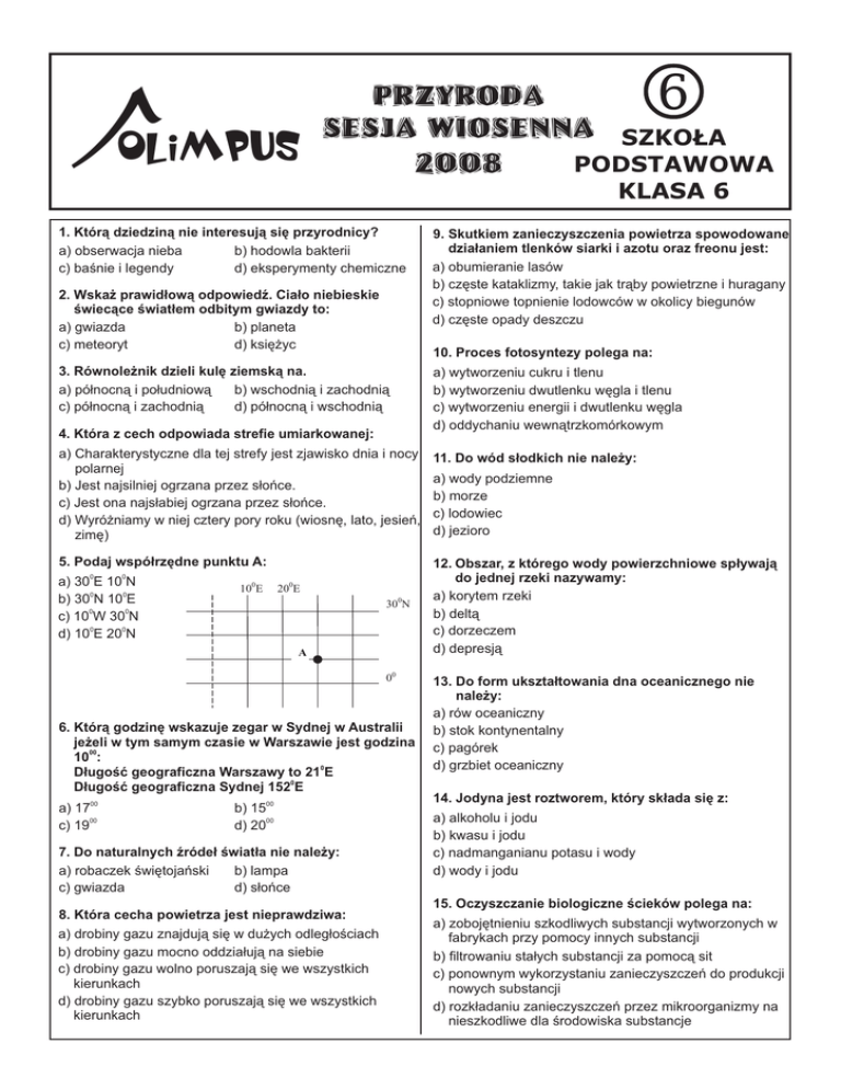 P OLIMPUS PRZYRODA SESJA WIOSENNA SZKOLA PODSTAWOWA 2008 KLASA 6 1. Któr¹ dziedzin¹ nie interesuj¹ siê przyrodnicy? a) obserwacja nieba b) hodowla bakterii c) baœnie i legendy d) eksperymenty chemiczne 2. Wska¿ prawid³ow¹ odpowiedŸ. Cia³o niebieskie œwiec¹ce œwiat³em odbitym gwiazdy to: a) gwiazda b) planeta c) meteoryt d) ksiê¿yc 9. Skutkiem zanieczyszczenia powietrza spowodowane dzia³aniem tlenków siarki i azotu oraz freonu jest: a) obumieranie lasów b) czêste kataklizmy, takie jak tr¹by powietrzne i huragany c) stopniowe topnienie lodowców w okolicy biegunów d) czêste opady deszczu 10. Proces fotosyntezy polega na: 3. Równole¿nik dzieli kulê ziemsk¹ na. a) pó³nocn¹ i po³udniow¹ b) wschodni¹ i zachodni¹ c) pó³nocn¹ i zachodni¹ d) pó³nocn¹ i wschodni¹ 4. Która z cech odpowiada strefie umiarkowanej: a) wytworzeniu cukru i tlenu b) wytworzeniu dwutlenku wêgla i tlenu c) wytworzeniu energii i dwutlenku wêgla d) oddychaniu wewn¹trzkomórkowym a) Charakterystyczne dla tej strefy jest zjawisko dnia i nocy polarnej b) Jest najsilniej ogrzana przez s³oñce. c) Jest ona najs³abiej ogrzana przez s³oñce. d) Wyró¿niamy w niej cztery pory roku (wiosnê, lato, jesieñ, zimê) 11. Do wód s³odkich nie nale¿y: 5. Podaj wspó³rzêdne punktu A: 12. Obszar, z którego wody powierzchniowe sp³ywaj¹ do jednej rzeki nazywamy: a) korytem rzeki b) delt¹ c) dorzeczem d) depresj¹ 0 0 a) 30 E 10 N b) 300N 100E c) 100W 300N d) 100E 200N 100E 200E 300N A 00 6. Któr¹ godzinê wskazuje zegar w Sydnej w Australii je¿eli w tym samym czasie w Warszawie jest godzina 1000: D³ugoœæ geograficzna Warszawy to 210E D³ugoœæ geograficzna Sydnej 1520E a) 1700 c) 1900 b) 1500 d) 2000 7. Do naturalnych Ÿróde³ œwiat³a nie nale¿y: a) robaczek œwiêtojañski b) lampa c) gwiazda d) s³oñce 8. Która cecha powietrza jest nieprawdziwa: a) drobiny gazu znajduj¹ siê w du¿ych odleg³oœciach b) drobiny gazu mocno oddzia³uj¹ na siebie c) drobiny gazu wolno poruszaj¹ siê we wszystkich kierunkach d) drobiny gazu szybko poruszaj¹ siê we wszystkich kierunkach a) wody podziemne b) morze c) lodowiec d) jezioro 13. Do form ukszta³towania dna oceanicznego nie nale¿y: a) rów oceaniczny b) stok kontynentalny c) pagórek d) grzbiet oceaniczny 14. Jodyna jest roztworem, który sk³ada siê z: a) alkoholu i jodu b) kwasu i jodu c) nadmanganianu potasu i wody d) wody i jodu 15. Oczyszczanie biologiczne œcieków polega na: a) zobojêtnieniu szkodliwych substancji wytworzonych w fabrykach przy pomocy innych substancji b) filtrowaniu sta³ych substancji za pomoc¹ sit c) ponownym wykorzystaniu zanieczyszczeñ do produkcji nowych substancji d) rozk³adaniu zanieczyszczeñ przez mikroorganizmy na nieszkodliwe dla œrodowiska substancje 16. Przyczyn¹ erozji gleby nie jest: a) stosowanie nawozów sztucznych b) wycinanie lasów pod pola uprawne c) mechaniczna uprawa gleby d) usuwanie zaroœli œródpolnych 23. Zaznacz zestaw zwierz¹t, który zawiera tylko gady: a) ¿ó³w, padalec, krokodyl b) jaszczurka, ropucha, traszka c) krokodyl, ¿aba, sum d) wieloryb, je¿, kobra 17. Porosty s¹ organizmami symbiotycznymi poniewa¿: 24. Zaznacz zestaw w którym prawid³owo podano jednostki systematyczne roœlin od najmniejszej do najwiêkszej. a) przygotowuj¹ pod³o¿e dla roœlin b) komórki glonów wspó³¿yj¹ z komórkami grzybów c) pobieraj¹ z atmosfery ró¿ne substancje szkodliwe d) s¹ zjadane przez ludzi i zwierzêta 18. Któr¹ w³aœciwoœæ wykazuj¹ latem zwisaj¹ce linie energetyczne: a) sprê¿ystoœæ b) topnienie c) rozszerzalnoœæ temperaturow¹ d) plastycznoœæ a) gatunek, rodzaj, rodzina, rz¹d, klasa, gromada, królestwo b) królestwo, gromada, klasa, rz¹d, rodzina, rodzaj, gatunek c) królestwo, gromada, rz¹d, klasa, rodzaj, rodzina, gatunek d) gatunek, rodzina, rz¹d, rodzaj, klasa, gromada, królestwo 25. W œwiecie organizmów wyró¿niono królestwa: a) roœlin, zwierz¹t, grzybów i organizmów nie posiadaj¹cych j¹dra b) roœlin, zwierz¹t i grzybów c) roœlin, zwierz¹t i organizmów nie posiadaj¹cych j¹dra d) roœlin i zwierz¹t 19. Do izolatorów nie nale¿y: a) linijka b) papier c) guma d) miedŸ 26. Do roœlin nagonasiennych nale¿y: a) mi³orz¹b dwuklapowy b) daglezja c) storczyk d) krokus 20. Paleontolog zajmuje siê: 27. Zale¿noœæ ³¹cz¹ca motyla i kwitn¹c¹ roœlinê to: a) paso¿ytnictwo b) komensalizm c) symbioza d) drapie¿nictwo a) badaniem ¿ycia na Ziemi przed milionami lat na podstawie skamienia³oœci b) badanie mórz i oceanów c) badaniem procesów zachodz¹cych na powierzchni Ziemi oraz jej przesz³oœci geologicznej d) badaniem ruchów Ziemi 21. Do najbardziej ¿yznych gleb na Ziemi nale¿¹: a) tundrowe w strefie oko³obiegunowej b) inicjalne w strefie zwrotnikowej c) brunatne i bielicowe w strefie umiarkowanej d) kasztanowe i czarnoziemy w strefie umiarkowanej 22. Do zwierz¹t sta³ocieplnych nale¿¹: a) ¿ó³w b) kobra c) tygrys d) szczupak 28. Têtnice to naczynia, które: a) doprowadzaj¹ krew do serca b) wyprowadzaj¹ krew z serca c) p³ynie w nich krew pozbawiona tlenu d) krew p³ynie wolno i pod ma³ym ciœnieniem 29. Zaznacz numer alarmowy do pogotowia ratunkowego: a) 996 b) 997 c) 998 d) 999 30. Ekologia jest nauk¹ o: a) ochronie rzadkich gatunków roœlin i zwierz¹t b) zachowaniem dzikich zwierz¹t w warunkach niewoli c) oddzia³ywaniem na siebie ró¿nych organizmów oraz ich powi¹zaniem ze œrodowiskiem d) oddzia³ywaniem wzajemnym ludzi, którzy maj¹ bliski kontakt z przyrod¹