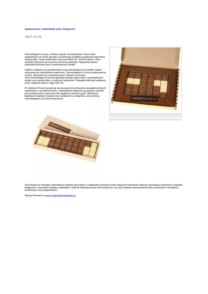 Opakowanie czekoladek jako telegram? 2007-10-30 Chocotelegram to nowy, unikalny sposób na przekazanie Twoich słów opakowanych na róŜne sposoby: od barwnego pudełka po gustowną drewnianą skrzyneczkę. Twoja wiadomość moŜe pomieścić od 7 do 60 znaków. Litery i symbole wykonane są z pysznej mlecznej czekolady. NajwyŜszej jakości czekolada pochodzi tylko z renomowanych źródeł! Całkiem niedawno za pośrednictwem www.chocotelegram.pl została nadana stutytysięczna czekoladowa wiadomość. Chocotelegram to forma przekazywania Ŝyczeń, zaproszeń czy wyraŜania uczuć. Zawarta na stronie www.chocotelegram.pl prosta aplikacja pomaga ułoŜyć tekst z czekoladowych kostek oraz wybrać jedno z moŜliwych opakowań. Przesyłka trafia pod wskazany przez nadawcę adres w ciągu kilku dni. W niektórych firmach przyjmuje się zwyczaj komunikowania szczególnie dobrych wiadomości w tej właśnie formie. Czekoladowe telegramy są uŜywane równieŜ przy przekazywaniu zaproszeń dla wyjątkowo waŜnych gości. MoŜliwości łagodzenia napiętych sytuacji oraz wyraŜania np. przeprosin, przy pomocy chocotelegramu są równieŜ popularne. Chocolissimo.pl oferujący czekoladowy telegram jest jednym z najbardziej cenionych przez krajowych koneserów słodyczy sprzedawcą markowych czekolad. Eleganckie i wyszukane zestawy czekoladek i pralinek oferowane przez chocolissimo.pl, są coraz chętniej wykorzystywane jako podarunek w kontaktach biznesowych czy przyjacielskich. Więcej informacji na www.czekoladowytelegram.pl