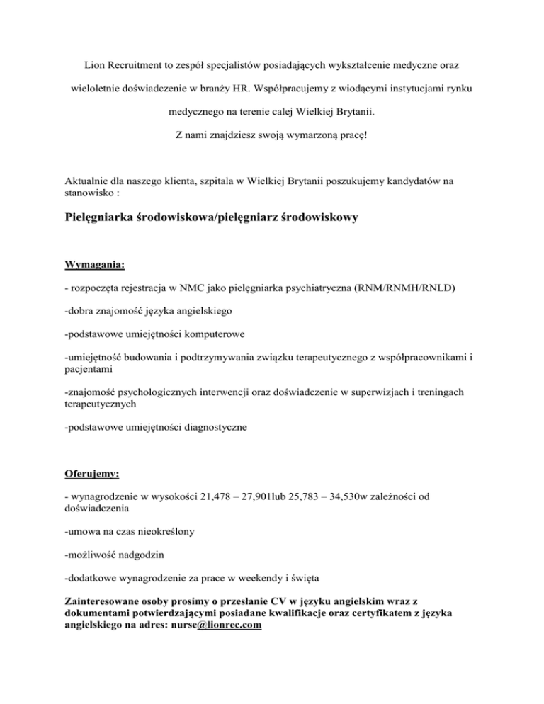 Lion Recruitment to zespół specjalistów posiadających wykształcenie medyczne oraz wieloletnie doświadczenie w branży HR. Współpracujemy z wiodącymi instytucjami rynku medycznego na terenie calej Wielkiej Brytanii. Z nami znajdziesz swoją wymarzoną pracę! Aktualnie dla naszego klienta, szpitala w Wielkiej Brytanii poszukujemy kandydatów na stanowisko : Pielęgniarka środowiskowa/pielęgniarz środowiskowy Wymagania: - rozpoczęta rejestracja w NMC jako pielęgniarka psychiatryczna (RNM/RNMH/RNLD) -dobra znajomość języka angielskiego -podstawowe umiejętności komputerowe -umiejętność budowania i podtrzymywania związku terapeutycznego z współpracownikami i pacjentami -znajomość psychologicznych interwencji oraz doświadczenie w superwizjach i treningach terapeutycznych -podstawowe umiejętności diagnostyczne Oferujemy: - wynagrodzenie w wysokości 21,478 – 27,901lub 25,783 – 34,530w zależności od doświadczenia -umowa na czas nieokreślony -możliwość nadgodzin -dodatkowe wynagrodzenie za prace w weekendy i święta Zainteresowane osoby prosimy o przesłanie CV w języku angielskim wraz z dokumentami potwierdzającymi posiadane kwalifikacje oraz certyfikatem z języka angielskiego na adres: [email protected]