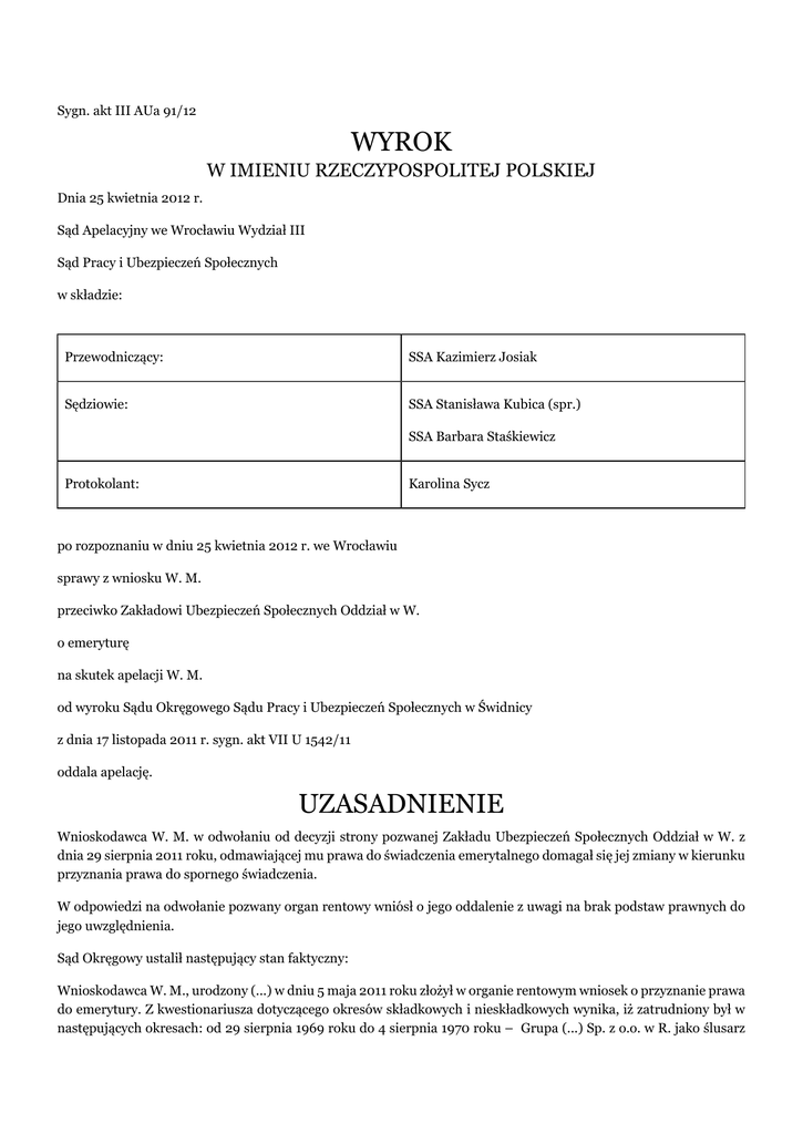 Sygn. akt III AUa 91/12 WYROK W IMIENIU RZECZYPOSPOLITEJ POLSKIEJ Dnia 25 kwietnia 2012 r. Sąd Apelacyjny we Wrocławiu Wydział III Sąd Pracy i Ubezpieczeń Społecznych w składzie: Przewodniczący: SSA Kazimierz Josiak Sędziowie: SSA Stanisława Kubica (spr.) SSA Barbara Staśkiewicz Protokolant: Karolina Sycz po rozpoznaniu w dniu 25 kwietnia 2012 r. we Wrocławiu sprawy z wniosku W. M. przeciwko Zakładowi Ubezpieczeń Społecznych Oddział w W. o emeryturę na skutek apelacji W. M. od wyroku Sądu Okręgowego Sądu Pracy i Ubezpieczeń Społecznych w Świdnicy z dnia 17 listopada 2011 r. sygn. akt VII U 1542/11 oddala apelację. UZASADNIENIE Wnioskodawca W. M. w odwołaniu od decyzji strony pozwanej Zakładu Ubezpieczeń Społecznych Oddział w W. z dnia 29 sierpnia 2011 roku, odmawiającej mu prawa do świadczenia emerytalnego domagał się jej zmiany w kierunku przyznania prawa do spornego świadczenia. W odpowiedzi na odwołanie pozwany organ rentowy wniósł o jego oddalenie z uwagi na brak podstaw prawnych do jego uwzględnienia. Sąd Okręgowy ustalił następujący stan faktyczny: Wnioskodawca W. M., urodzony (...) w dniu 5 maja 2011 roku złożył w organie rentowym wniosek o przyznanie prawa do emerytury. Z kwestionariusza dotyczącego okresów składkowych i nieskładkowych wynika, iż zatrudniony był w następujących okresach: od 29 sierpnia 1969 roku do 4 sierpnia 1970 roku – Grupa (...) Sp. z o.o. w R. jako ślusarz remontowy; od 9 października 1970 roku do 12 lipca 1971 roku (...)w K. jako pracownik fizyczny; od 31 lipca 1971 roku do 24 listopada 1973 roku Grupa (...) Sp. z o.o. w R. jako ślusarz spawacz; od 5 grudnia 1973 roku do 16 lutego 1974 roku Zakład (...) we W. jako elektromonter, spawacz; od 21 lutego 1974 roku do 30 kwietnia 1978 roku Gminne Zakłady (...)w R. jako monter instalacji elektrycznej, spawacz; od 1 czerwca 1978 roku do 31 grudnia 2006 roku prowadził działalność gospodarczą w zakresie Instalatorstwo Elektryczne, c.o. Sanitarne i Gazowe w R.. Początkowo było to działalność rzemieślnicza (instalatorstwo elektryczne i spawalnictwo) a następnie działalność gospodarcza na podstawie wpisu do ewidencji działalności gospodarczej – instalatorstwo elektryczne, gazowe, sanitarne i ogrzewanie. Od 15 czerwca 1991 roku działalność gastronomiczna i od 15 sierpnia 1992 roku działalność ogólnobudowlana. Organ rentowy zaskarżoną decyzją z dnia 29 sierpnia 2011 roku odmówił wnioskodawcy prawa do renty, ponieważ do dnia 1 stycznia 1999 roku nie został udowodniony wymagany 15- letni okres pracy w szczególnych warunkach lub w szczególnym charakterze, wykonywanej stale i w pełnym wymiarze czasu pracy (brak takich okresów). Przy tak ustalonym stanie faktycznym Sąd Okręgowy Sąd Pracy i Ubezpieczeń Społecznych w Świdnicy wyrokiem z dnia 17 listopada 2011 roku oddalił odwołanie wnioskodawcy. W uzasadnieniu do wyroku Sąd Okręgowy wskazał, iż wnioskodawca nie jest osobą spełniającą warunki do uzyskania świadczenia emerytalnego z tytułu wykonywania pracy w warunkach szczególnych. Sąd Okręgowy podkreślił, iż przepisy odnoszące się do przedmiotowego świadczenia jednoznacznie określają przesłanki, jakie należy spełnić aby można było ubiegać się o skorzystanie z wcześniejszego świadczenia emerytalnego. Sąd Okręgowy zauważył, że wnioskodawca pomimo uzyskanego odpowiedniego wieku emerytalnego, nie spełnił jednego z podstawowych warunków uprawniających do nabycia uprawnień emerytalnych tzn. nie udokumentował na dzień 1 stycznia 1999 roku – 15 letniego okresu pracy w warunkach szczególnych. Praca jaka wykonywana była przez wnioskodawcę w okresie jego zatrudnienia w GRUPA (...) Sp. z o.o. w R. (ślusarz – spawacz) w Zakładach (...) we W. (jako elektromonter spawacz) oraz w Gminnych Zakładach (...)w R. (jako monter – spawacz) nawet w przypadku przeprowadzenia postępowania dowodowego w zakresie wskazania czy była ta praca w warunkach szczególnych, wykonywana stale i w pełnym wymiarze czasu pracy, nie uprawniałaby go do otrzymania wcześniejszego świadczenia emerytalnego. Po dokonaniu bowiem kumulacji tych okresów wnioskodawca nie legitymuje się 15-letnim okresem pracy w warunkach szczególnych. Ponadto nie sposób zgodzić się ze stanowiskiem wnioskodawcy, że praca w ramach działalności gospodarczej mogłaby być zaliczona do pracy w warunkach szczególnych. Rozporządzenie bowiem RM z dnia 7 lutego 1983 roku, na które powołuje się sam wnioskodawca w swoim odwołaniu w § 1 wyraźnie określa, iż rozporządzenie to stosuje się do pracowników wykonujących prace w szczególnych warunkach lub w szczególnym charakterze, wymienione w § 4 – 15 rozporządzenia oraz w wykazach stanowiących załącznik do rozporządzenia, zwanych dalej „wykazami”. Zgodnie z art. 22 § 1 ustawy Kodeks Pracy przez nawiązanie stosunku pracy pracownik zobowiązuje się do wykonywania pracy określonego rodzaju na rzecz pracodawcy i pod jego kierownictwem oraz w miejscu i czasie wyznaczonym przez pracodawcę, a pracodawca do zatrudniania pracownika za wynagrodzeniem. Wnioskodawca natomiast jak sam przyznaje, nie był pracownikiem, prowadził działalność gospodarczą i nie kwestionuje tego faktu. Sam zatem ustalał sobie zakres pracy jak i godziny pracy. Wnioskodawca nie pozostawał w stosunku pracy w rozumieniu Kodeksu pracy, brak jest więc podstaw, aby zaliczyć do okresu uprawniającego nabycie prawa do emerytury okresu od 1 czerwca 1978 roku do 31 grudnia 2006 roku bowiem przepisy nie przyznają prawa do wcześniejszej emerytury, grupie ubezpieczonych innej niż pracownicy. Przepisy normujące świadczenia dla pracowników zatrudnionych w szczególnych warunkach lub w szczególnym charakterze odnoszą się tylko do pracowników zatrudnionych na podstawie umowy o pracę. Świadczy o tym chociażby brzmienie § 1 rozporządzenia w którym użyto określenia rozporządzenie to s