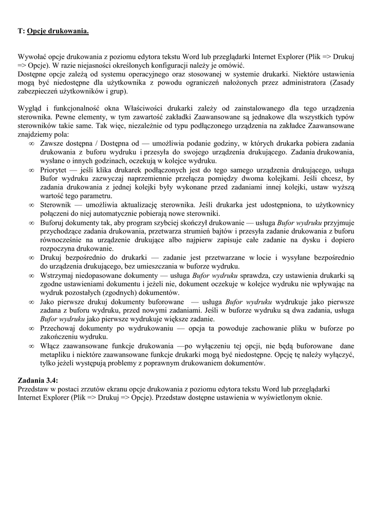T: Opcje drukowania. Wywołać opcje drukowania z poziomu edytora tekstu Word lub przeglądarki Internet Explorer (Plik => Drukuj => Opcje). W razie niejasności określonych konfiguracji należy je omówić. Dostępne opcje zależą od systemu operacyjnego oraz stosowanej w systemie drukarki. Niektóre ustawienia mogą być niedostępne dla użytkownika z powodu ograniczeń nałożonych przez administratora (Zasady zabezpieczeń użytkowników i grup). Wygląd i funkcjonalność okna Właściwości drukarki zależy od zainstalowanego dla tego urządzenia sterownika. Pewne elementy, w tym zawartość zakładki Zaawansowane są jednakowe dla wszystkich typów sterowników takie same. Tak więc, niezależnie od typu podłączonego urządzenia na zakładce Zaawansowane znajdziemy pola: • Zawsze dostępna / Dostępna od — umożliwia podanie godziny, w których drukarka pobiera zadania drukowania z buforu wydruku i przesyła do swojego urządzenia drukującego. Zadania drukowania, wysłane o innych godzinach, oczekują w kolejce wydruku. • Priorytet — jeśli klika drukarek podłączonych jest do tego samego urządzenia drukującego, usługa Bufor wydruku zazwyczaj naprzemiennie przełącza pomiędzy dwoma kolejkami. Jeśli chcesz, by zadania drukowania z jednej kolejki były wykonane przed zadaniami innej kolejki, ustaw wyższą wartość tego parametru. • Sterownik — umożliwia aktualizację sterownika. Jeśli drukarka jest udostępniona, to użytkownicy połączeni do niej automatycznie pobierają nowe sterowniki. • Buforuj dokumenty tak, aby program szybciej skończył drukowanie — usługa Bufor wydruku przyjmuje przychodzące zadania drukowania, przetwarza strumień bajtów i przesyła zadanie drukowania z buforu równocześnie na urządzenie drukujące albo najpierw zapisuje całe zadanie na dysku i dopiero rozpoczyna drukowanie. • Drukuj bezpośrednio do drukarki — zadanie jest przetwarzane w locie i wysyłane bezpośrednio do urządzenia drukującego, bez umieszczania w buforze wydruku. • Wstrzymaj niedopasowane dokumenty — usługa Bufor wydruku sprawdza, czy ustawienia drukarki są zgodne ustawieniami dokumentu i jeżeli nie, dokument oczekuje w kolejce wydruku nie wpływając na wydruk pozostałych (zgodnych) dokumentów. • Jako pierwsze drukuj dokumenty buforowane — usługa Bufor wydruku wydrukuje jako pierwsze zadana z buforu wydruku, przed nowymi zadaniami. Jeśli w buforze wydruku są dwa zadania, usługa Bufor wydruku jako pierwsze wydrukuje większe zadanie. • Przechowaj dokumenty po wydrukowaniu — opcja ta powoduje zachowanie pliku w buforze po zakończeniu wydruku. • Włącz zaawansowane funkcje drukowania —po wyłączeniu tej opcji, nie będą buforowane dane metapliku i niektóre zaawansowane funkcje drukarki mogą być niedostępne. Opcję tę należy wyłączyć, tylko jeżeli występują problemy z poprawnym drukowaniem dokumentów. Zadania 3.4: Przedstaw w postaci zrzutów ekranu opcje drukowania z poziomu edytora tekstu Word lub przeglądarki Internet Explorer (Plik => Drukuj => Opcje). Przedstaw dostępne ustawienia w wyświetlonym oknie.