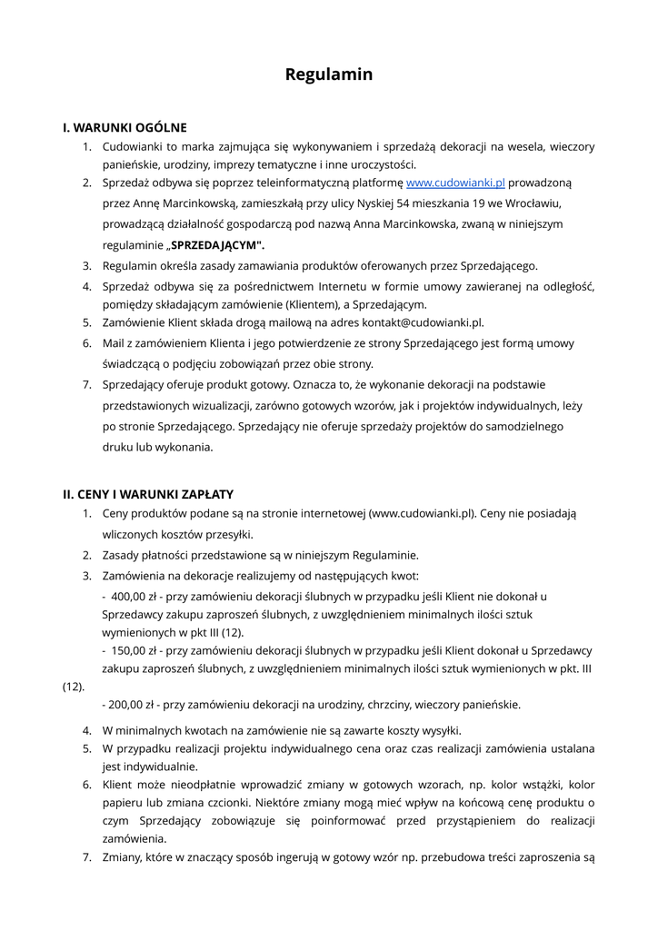 Regulamin I. WARUNKI OGÓLNE 1. Cudowianki to marka zajmująca się wykonywaniem i sprzedażą dekoracji na wesela, wieczory panieńskie, urodziny, imprezy tematyczne i inne uroczystości. 2. Sprzedaż odbywa się poprzez teleinformatyczną platformę www.cudowianki.pl prowadzoną przez Annę Marcinkowską, zamieszkałą przy ulicy Nyskiej 54 mieszkania 19 we Wrocławiu, prowadzącą działalność gospodarczą pod nazwą Anna Marcinkowska, zwaną w niniejszym regulaminie „SPRZEDA JĄCYM". 3. Regulamin określa zasady zamawiania produktów oferowanych przez Sprzedającego. 4. Sprzedaż odbywa się za pośrednictwem Internetu w formie umowy zawieranej na odległość, pomiędzy składającym zamówienie (Klientem), a Sprzedającym. 5. Zamówienie Klient składa drogą mailową na adres [email protected]. 6. Mail z zamówieniem Klienta i jego potwierdzenie ze strony Sprzedającego jest formą umowy świadczącą o podjęciu zobowiązań przez obie strony. 7. Sprzedający oferuje produkt gotowy. Oznacza to, że wykonanie dekoracji na podstawie przedstawionych wizualizacji, zarówno gotowych wzorów, jak i projektów indywidualnych, leży po stronie Sprzedającego. Sprzedający nie oferuje sprzedaży projektów do samodzielnego druku lub wykonania. II. CENY I WARUNKI ZAPŁATY 1. Ceny produktów podane są na stronie internetowej (www.cudowianki.pl). Ceny nie posiadają wliczonych kosztów przesyłki. 2. Zasady płatności przedstawione są w niniejszym Regulaminie. 3. Zamówienia na dekoracje realizujemy od następujących kwot: - 400,00 zł - przy zamówieniu dekoracji ślubnych w przypadku jeśli Klient nie dokonał u Sprzedawcy zakupu zaproszeń ślubnych, z uwzględnieniem minimalnych ilości sztuk wymienionych w pkt III (12). - 150,00 zł - przy zamówieniu dekoracji ślubnych w przypadku jeśli Klient dokonał u Sprzedawcy zakupu zaproszeń ślubnych, z uwzględnieniem minimalnych ilości sztuk wymienionych w pkt. III (12). - 200,00 zł - przy zamówieniu dekoracji na urodziny, chrzciny, wieczory panieńskie. 4. W minimalnych kwotach na zamówienie nie są zawarte koszty wysyłki. 5. W przypadku realizacji projektu indywidualnego cena oraz czas realizacji zamówienia ustalana jest indywidualnie. 6. Klient może nieodpłatnie wprowadzić zmiany w gotowych wzorach, np. kolor wstążki, kolor papieru lub zmiana czcionki. Niektóre zmiany mogą mieć wpływ na końcową cenę produktu o czym Sprzedający zobowiązuje się poinformować przed przystąpieniem do realizacji zamówienia. 7. Zmiany, które w znaczący sposób ingerują w gotowy wzór np. przebudowa treści zaproszenia są odpłatne i wyceniane indywidualnie. 8. Minimalna opłata za zmiany graficzne wynosi 50 zł. 9. W przypadku zmian cen produktów zamówienia złożone przed datą wprowadzenia zmian do cennika będą realizowane na podstawie zasad obowiązujących przed wprowadzeniem zmian. 10. Zamówienia można składać 24h na dobę, od poniedziałku do niedzieli, a potwierdzenie zamówienia Klient otrzymuje od poniedziałku do piątku. 11. Zapłaty należy dokonać przelewem bankowym na wskazane przez Sprzedającego konto. 12. Sprzedający pobiera zadatek w wysokości 30% całego zamówienia lub od razu z góry pełną kwotę za złożone zamówienie. Zadatek nie podlega zwrotowi. 13. W przypadku nieotrzymania zadatku do 3 dni roboczych od złożenia zamówienia, realizacja zostaje wstrzymana. 14. W przypadku gdy Sprzedający pobrał od Klienta zadatek w wysokości 30% zamówienia, pozostałe70% kwoty Klient wpłaca po akceptacji ostatecznej wizualizacji projektu. 15. W przypadku nieotrzymania pozostałej kwoty płatności do 5 dni roboczych od akceptacji projektu, realizacja zostaje wstrzymana. 16. W tytule przelewu należy podać numer zamówienia, który Klient otrzymuje w mailu od Sprzedającego. III. DANE DO PROJEKTÓW I REALIZACJA ZAMÓWIENIA 1. Zaproszenia nie są personalizowane. Uzupełnienie nazwisk zapraszanych gości jest dodatkowo płatne – 1,00 zł/szt. 2. Klient zobowiązany jest do sprawdzenia poprawności wszystkich danych (tekstów, treści zaproszeń, imion i nazwisk, dat, adresów itd.) oraz potwierdzenia drogą mailową realizacji sprawdzonego projektu. Weryfikacja błędów leży po stronie Klienta. 3. Sprzedający nie bierze odpowiedzialności za wszelkie błędy, które zostały zaakceptowane przez Klienta. 4. Wszystkie zmiany wprowadzane po akceptacji Klienta są dodatkowo płatne (wysokość opłaty wynosi minimum 50 zł, kwota ustalana jest indywidualnie). 5. Sprzedający nie ingeruje w treści przesłane przez Klienta. Podczas personalizacji zaproszeń i innych elementów Sprzedający nie zmienia przesłanych przez Klienta tekstów, nie poprawia błędów ortograficznych, stylistycznych, literówek itp. Poprawne zapisanie i sprawdzenie danych leży po stronie Klienta. 6. Istnieje możliwość wykonania dodatkowej wersji językowej zaproszeń czy dodatków. Projekty w wersji obcojęzycznej wykonywane będą jedynie na podstawie przesłanego przez Klienta tekstu. Sprzedający nie tłumaczy tekstów na język obcy. 7. Terminy realizacji zamówień: - w ciągu 10 dni roboczych od zaksięgowania zadatku Klient otrzymuje wizualizację dekoracji, - po akceptacji wizualizacji Sprzedający w ciągu 14 dni roboczych od zaksięgowania pozostałej kwoty realizuje zamówienie. 8. W terminy realizacji zamówienia nie jest wliczony czas dostawy. 9. W przypadku realizacji projektu indywidualnego termin realizacji zamówienia ustalany jest indywidualnie. 10. W przypadku zamówień z krótkim terminem realizacji (poniżej 14 dni roboczych) wymagana jest płatność za ekspresową realizację. Płatność ustalana jest indywidualnie w zależności od skomplikowania projektu. Minimalna kwota to 50% całego zamówienia. 11. W przypadku wystąpienia okoliczności niezależnych od Sprzedającego, które mają wpływ na opóźnienie realizacji zamówienia, Sprzedający zastrzega sobie prawo do wstrzymania realizacj