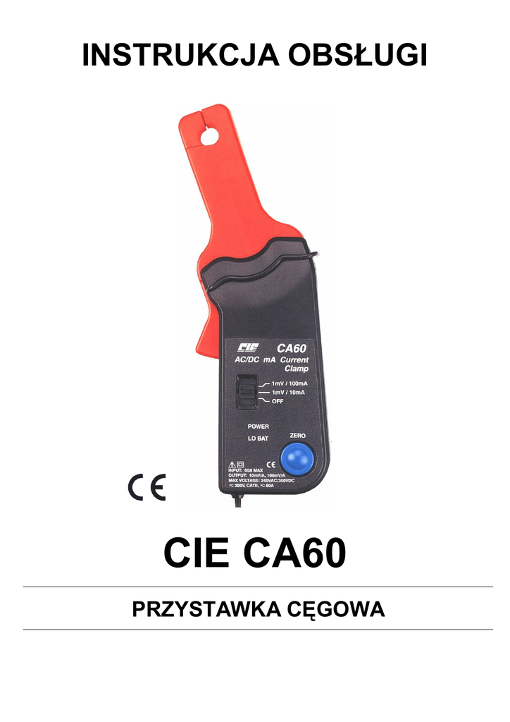INSTRUKCJA OBSŁUGI CIE CA60 PRZYSTAWKA CĘGOWA 1. ZASADY BEZPIECZEŃSTWA Niniejsza instrukcja obsługi zawiera ostrzeżenia oraz zasady bezpieczeństwa, które muszą być przestrzegane przez użytkownika, w celu zachowania bezpieczeństwa oraz uniknięcia ryzyka wystąpienia wypadku lub ciężkich obrażeń. Producent i dystrybutor nie odpowiadają za uszkodzenia lub obrażenia spowodowane nieprawidłowym użytkowaniem urządzenia, niezgodnym z instrukcją obsługi. Nie wolno zakładać przetwornika na przewody, w których napięcie jest równe lub wyższe niż 300V DV lub 240V AC rms. By uniknąć obrażeń fizycznych nie należy dokonywać pomiarów na przewodach nieizolowanych lub których izolacja jest popękana lub uszkodzona. Nie wolno otwierać pokrywy przetwornika ani dokonywać napraw, gdy przystawka jest w czasie pomiarów. Przystawka cęgowa CIE CA60 spełnia wymogi bezpieczeństwa odnośnie przepięć KAT II dla norm: EN61010-1 i EN61010-2 oraz spełnia wymogi środowiskowe zgodnie z normą IEC664. W przypadku nie stosowania się do wskazówek zawartych w niniejszej instrukcji powyższe warunki bezpieczeństwa mogą nie być zachowane. Produkt spełnia wymogi norm europejskich: 89/336/EEC Kompatybilność elektromagnetyczne EMC 73/23/EEC Niskie napięcia jak ujęto w 93/68/EEC 2. WPROWADZENIE Przystawka cęgowa CIE CA60 jest przetwornikiem, który umożliwia pomiar wartości prądu elektrycznego przemiennego lub stałego do 60A w zakresie częstotliwości do 20kHz, przy użyciu multimetru. Podczas pomiaru prądu tymi cęgami nie ma potrzeby przerywania obwodu albo naruszania izolacji. Rozchylane cęgi pomiarowe służą do pomiaru prądu stałego naciskając przycisk ZERO w łatwy sposób można dokładnie ustalić wartość zerową. Przystawka jest urządzeniem przystosowanym do wykrywania upływów prądu lub monitorowania obwodów elektrycznych lub elektronicznych. 3. POMIARY 1. Włóż czarny wtyk bananowy do gniazda COM a czerwony wtyk bananowy do gniazda V dowolnego multimetru o minimalnej impedancji wejściowej 10M. 2. Ustawić przełącznik włączania zasilania z pozycji OFF na żądany zakres: 1mV/10mA lub 1mV/100mA. Świecenie zielonej diody sygnalizuje włączenie zasilania. -2- 3. Dla pomiarów poniżej 2A należy ustawić zakres multimetru na 1mV/10mA. Zakres pomiarowy multimetru na 200mV (AC/DC w zależności od rodzaju mierzonego prądu). Dla prądów powyżej 2A przełącznik przystawki ustawić na czułość 1mV/100mA. 4. Przy pomiarze prądu stałego należy zawsze wcisnąć przycisk ZERO na przystawce zanim miernik wskaże wartość zerową. 5. Zaciśnij szczęki pomiarowe wokół przewodnika. Pomiar nie będzie możliwy w wypadku, gdy więcej niż jeden przewodnik będzie objęty cęgami. Szczęki powinny być dokładnie zamknięte przed dokonaniem pomiaru. Aby uzyskać największą dokładność pomiaru należy umieścić przewodnik dokładnie pośrodku cęgów pomiarowych. 6. Gdy ustawiony jest zakres 1mV/10mA na przystawce, wskazanie miernika należy pomnożyć przez 10, aby uzyskać wartość prądu wyrażoną w mA, np: wskazanie miernika wynosi 10mV – wartość płynącego prądu wynosi 10 x 10 =100mA. W przypadku zakresu 1mV/100mA postępowanie jest analogiczne, jednakże wskazanie należy pomnożyć przez 100. UWAGA Przy pomiarze prądu stałego wyjście ma polaryzację dodatnią, gdy prąd płynie „z góry na dół” przystawki. Czerwony wtyk bananowy ma polaryzację „+”. Przy pomiarze prądu stałego efekt histerezy magnetycznej może uniemożliwić całkowite i dokładne wyzerowanie przystawki. By wyeliminować ten problem, należy kilkakrotnie otworzyć i zamknąć cęgi i nacisnąć przycisk ZERO. 4. SPECYFIKACJA TECHNICZNA 4.1. Specyfikacja ogólna Max średnica mierzonego przewodu: Wskaźnik wyczerpania baterii: Temperatura pracy: Temperatura przechowywania: Współczynnik temperaturowy: Masa: Wymiary: Wyjście: 9mm czerwona dioda LED 0C 50C przy RH<70% -20C 70C przy RH<80% 0,1 x (określona dokładność) / 1C (<18C lub >28C) 250g 195 x 70 x 33 mm 2 przewody z wtykami bananowymi prostymi 4.2. Specyfikacja elektryczna Podana specyfikacja dotyczy warunków 23C±5C i 70% RH max. Prąd stały DCA (1mV/10mA) Zakresy: 10mA-20A Dokładność: ±(1,5%+5mA) Prąd stały DCA (1mV/100mA) Zakresy: 100mA-60A Dokładność: 100mA-40A: ±(2,0%+20mA) 40-60A: ±(4,0%+0,3A) -3- Prąd przemienny ACA (1mV/10mA) Zakresy: 10mA-15A Dokładność: 10mA-10A: 40Hz÷2kHz: ±(2%+5mA) 2÷10kHz: ±(4%+30mA) 10÷20kHz: ±(6%+30mA) 10-15A: 40÷20kHz: ±(8%+30mA) Prąd przemienny ACA (1mV/100mA) Zakresy: 100mA-60A Dokładność: 100mA-40A: 40Hz÷1kHz: ±(2%+30mA) 1÷2kHz: ±(4%+30mA) 3÷5kHz: ±(6%+30mA) 40-60A: 40Hz÷5kHz: ±(8%+0,3A) 5. OCHRONA ŚRODOWISKA Urządzenie podlega dyrektywie WEEE 2002/96/EC. Symbol obok oznacza, że produkt musi być utylizowany oddzielnie i powinien być dostarczany do odpowiedniego punktu zbierającego odpady. Nie należy go wyrzucać razem z odpadami gospodarstwa domowego. Aby uzyskać więcej informacji, należy skontaktować się z przedstawicielem przedsiębiorstwa lub lokalnymi władzami odpowiedzialnymi za zarządzanie odpadami. WER. 2009-01-22 WF CIE CA60 nr ind.103017 PRZYSTAWKA CĘGOWA Wyprodukowano na Tajwanie Importer: BIALL Sp. z o.o. Otomin, ul. Słoneczna 43 80-174 GDAŃSK www.biall.com.pl -4-