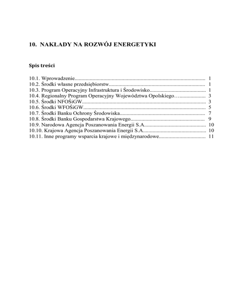 10. NAKŁADY NA ROZWÓJ ENERGETYKI Spis treści 10.1. Wprowadzenie............................................................................................... 10.2. Środki własne przedsiębiorstw...................................................................... 10.3. Program Operacyjny Infrastruktura i Środowisko......................................... 10.4. Regionalny Program Operacyjny Województwa Opolskiego…................... 10.5. Środki NFOŚiGW.......................................................................................... 10.6. Środki WFOŚiGW......................................................................................... 10.7. Środki Banku Ochrony Środowiska.............................................................. 10.8. Środki Banku Gospodarstwa Krajowego...................................................... 10.9. Narodowa Agencja Poszanowania Energii S.A............................................. 10.10. Krajowa Agencja Poszanowania Energii S.A.............................................. 10.11. Inne programy wsparcia krajowe i międzynarodowe.................................. 1 1 1 3 3 5 7 9 10 10 11 AKTUALIZACJA ZAŁOŻEŃ DO PLANU ZAOPATRZENIA W CIEPŁO, ENERGIĘ ELEKTRYCZNĄ I PALIWA GAZOWE GMINY MIASTO BRZEG NA LATA 2015-2030 10.1. Wprowadzenie Źródłem finansowania inwestycji z zakresu energetyki, gazownictwa oraz ciepłownictwa są środki własne przedsiębiorstw energetycznych a także środki samorządów lokalnych oraz potencjalnych inwestorów. Czynnikiem określającym możliwość pozyskania finansowania na określony projekt jest wartość tego projektu. Im większy jest projekt inwestycyjny tym większe jest ryzyko, że niepowodzenie tego projektu będzie miało istotne negatywne skutki dla inwestora zarówno osoby prawnej jak i fizycznej. Z kolei im większy jest inwestor w stosunku do planowanego projektu, tym mniejsza jest skala ryzyka związana z tym projektem. Unia Europejska wspiera proekologiczną politykę, dlatego w większości krajów członkowskich można ubiegać się o dofinansowanie do tego typu projektów. Szereg obiektywnych czynników zewnętrznych pozwala stwierdzić, że pełna realizacja „Aktualizacji założeń do planu zaopatrzenia w ciepło, energię elektryczną i paliwa gazowe Gminy Miasto Brzeg’’ będzie trudna bez wsparcia finansowego i doradczego planowanych zadań inwestycyjnych. Z tego tytułu, główne źródła wsparcia finansowego i doradczego zadań odnośnie rozwoju gminnej infrastruktury energetycznej, można pozyskać za pomocą.: – Środków własnych przedsiębiorstw, – Programu Operacyjny Infrastruktura i Gospodarka 2014 – 2020, – Regionalnego Programu Operacyjnego Województwa Opolskiego 2014 – 2020, – Środków Narodowego Funduszu Ochrony Środowiska i Gospodarki Wodnej, – Środków Wojewódzkiego Funduszu Ochrony Środowiska i Gospodarki Wodnej, – Środków Banku Ochrony Środowiska, – Środków Banku Gospodarstwa Krajowego, – Narodowej Agencji Poszanowania Energii, – Krajowej Agencji Poszanowania Energii, – Inne programy wsparcia krajowe i międzynarodowe. 10.2. Środki własne przedsiębiorstw Podstawowym źródłem finansowania inwestycji z zakresu energetyki, gazownictwa oraz ciepłownictwa są środki własne oraz kredyty zaciągane przez przedsiębiorstwa energetyczne. O zachowanie równowagi pomiędzy potrzebami przedsiębiorstw energetycznych a możliwościami finansowymi konsumentów dba Urząd Regulacji Energetyki (URE) zatwierdzając taryfy dla przedsiębiorstw energetycznych. Przedsiębiorstwa energetyczne opracowują plany inwestycyjne, które po konsultacjach z gminami i urzędami marszałkowskimi weryfikuje i zatwierdza URE. Pod uwagę brane są potrzeby określone w gminnych „Założeniach do planów zaopatrzenia w energię elektryczną, ciepło i paliwa gazowe”, „Studiach uwarunkowań…”, „Miejscowych planach zagospodarowania przestrzennego” oraz strategicznych dokumentach samorządowych. W ten sposób powstaje podstawowy fundusz inwestycyjny przedsiębiorstw energetycznych. Kontrolę nad ich wydawaniem sprawuje URE. 10.3. Program Operacyjny Infrastruktura i Środowisko na lata 2014 – 2020 Program Operacyjny Infrastruktura i Środowisko 2014 – 2020 (POIiŚ 2014 –2020) to narodowy program mający na celu wspieranie gospodarki niskoemisyjnej, ochronę środowiska, powstrzymywanie lub dostosowanie się do zmian klimatu, komunikację oraz bezpieczeństwo 1 AKTUALIZACJA ZAŁOŻEŃ DO PLANU ZAOPATRZENIA W CIEPŁO, ENERGIĘ ELEKTRYCZNĄ I PALIWA GAZOWE GMINY MIASTO BRZEG NA LATA 2015-2030 energetyczne. POIiŚ 2014–2020 jest przedłużeniem i kontynuacją najważniejszych kierunków inwestycji wyznaczone w edycji wcześniejszej (POIiŚ 2007–2013). Odnoszą się one w szczególności do postępu technicznego państwa w priorytetowych sektorach gospodarki. Program POIiŚ 2014–2020 skierowany jest do podmiotów publicznych (włączając w to jednostki samorządu terytorialnego) orz do podmiotów prywatnych (głównie do dużych przedsiębiorstw). Podstawowym źródłem finansowania POIiŚ 2014–2020 będzie Fundusz Spójności, którego głównym zadaniem jest wspieranie rozwoju europejskich sieci komunikacyjnych oraz ochrony środowiska w krajach Unii Europejskiej. Ponadto planuje się dofinansowania z Europejskiego Funduszu Rozwoju Regionalnego (EFRR). Program skierowany jest na inwestycje, takie jak: Priorytet I (FS) – promowanie odnawialnych źródeł energii i efektywności energetycznej: – Wytwarzanie, rozprowadzanie i wykorzystywanie OZE (poprzez budowę lub modernizację farm wiatrowych, instalacji na biomasę lub biogaz; – Udoskonalenie efektywności energetycznej w obszarze publicznym i mieszkaniowym; – Rozwinięcie inteligentnych systemów dystrybucji i wdrażanie ich (np. tworzenie sieci dystrybucyjnych średniego i niskiego napięcia). Planowany wkład unijny: 1 5218,4 mln euro. Priorytet II