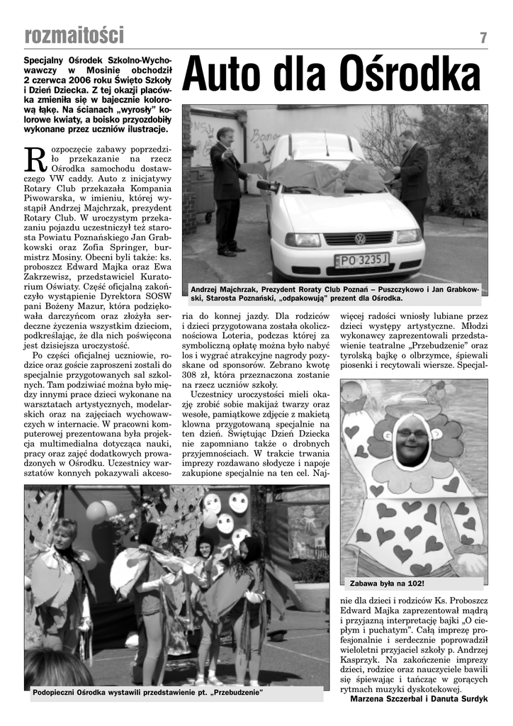 rozmaitoci Specjalny Orodek Szkolno-Wychowawczy w Mosinie obchodzi³ 2 czerwca 2006 roku wiêto Szko³y i Dzieñ Dziecka. Z tej okazji placówka zmieni³a siê w bajecznie kolorow¹ ³¹kê. Na cianach wyros³y kolorowe kwiaty, a boisko przyozdobi³y wykonane przez uczniów ilustracje. 7 Auto dla Orodka R ozpoczêcie zabawy poprzedzi³o przekazanie na rzecz Orodka samochodu dostawczego VW caddy. Auto z inicjatywy Rotary Club przekaza³a Kompania Piwowarska, w imieniu, której wyst¹pi³ Andrzej Majchrzak, prezydent Rotary Club. W uroczystym przekazaniu pojazdu uczestniczy³ te¿ starosta Powiatu Poznañskiego Jan Grabkowski oraz Zofia Springer, burmistrz Mosiny. Obecni byli tak¿e: ks. proboszcz Edward Majka oraz Ewa Zakrzewisz, przedstawiciel Kuratorium Owiaty. Czêæ oficjaln¹ zakoñczy³o wyst¹pienie Dyrektora SOSW pani Bo¿eny Mazur, która podziêkowa³a darczyñcom oraz z³o¿y³a serdeczne ¿yczenia wszystkim dzieciom, podkrelaj¹c, ¿e dla nich powiêcona jest dzisiejsza uroczystoæ. Po czêci oficjalnej uczniowie, rodzice oraz gocie zaproszeni zostali do specjalnie przygotowanych sal szkolnych. Tam podziwiaæ mo¿na by³o miêdzy innymi prace dzieci wykonane na warsztatach artystycznych, modelarskich oraz na zajêciach wychowawczych w internacie. W pracowni komputerowej prezentowana by³a projekcja multimedialna dotycz¹ca nauki, pracy oraz zajêæ dodatkowych prowadzonych w Orodku. Uczestnicy warsztatów konnych pokazywali akceso- Andrzej Majchrzak, Prezydent Roraty Club Poznañ Puszczykowo i Jan Grabkowski, Starosta Poznañski, odpakowuj¹ prezent dla Orodka. ria do konnej jazdy. Dla rodziców i dzieci przygotowana zosta³a okolicznociowa Loteria, podczas której za symboliczn¹ op³atê mo¿na by³o nabyæ los i wygraæ atrakcyjne nagrody pozyskane od sponsorów. Zebrano kwotê 308 z³, która przeznaczona zostanie na rzecz uczniów szko³y. Uczestnicy uroczystoci mieli okazjê zrobiæ sobie makija¿ twarzy oraz weso³e, pami¹tkowe zdjêcie z makiet¹ klowna przygotowan¹ specjalnie na ten dzieñ. wiêtuj¹c Dzieñ Dziecka nie zapomniano tak¿e o drobnych przyjemnociach. W trakcie trwania imprezy rozdawano s³odycze i napoje zakupione specjalnie na ten cel. Naj- wiêcej radoci wnios³y lubiane przez dzieci wystêpy artystyczne. M³odzi wykonawcy zaprezentowali przedstawienie teatralne Przebudzenie oraz tyrolsk¹ bajkê o olbrzymce, piewali piosenki i recytowali wiersze. Specjal- Zabawa by³a na 102! Podopieczni Orodka wystawili przedstawienie pt. Przebudzenie nie dla dzieci i rodziców Ks. Proboszcz Edward Majka zaprezentowa³ m¹dr¹ i przyjazn¹ interpretacjê bajki O ciep³ym i puchatym. Ca³¹ imprezê profesjonalnie i serdecznie poprowadzi³ wieloletni przyjaciel szko³y p. Andrzej Kasprzyk. Na zakoñczenie imprezy dzieci, rodzice oraz nauczyciele bawili siê piewaj¹c i tañcz¹c w gor¹cych rytmach muzyki dyskotekowej. Marzena Szczerbal i Danuta Surdyk