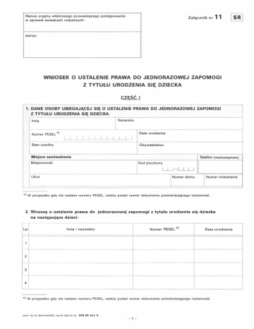 Nazwa organu właściwego prowadzącego postępowanie Załącznik nr w sprawie świadczeń rodzinnych: 11 Adres: WNIOSEK O USTALENIE PRAWA DO JEDNORAZOWEJ ZAPOMOGI Z TYTUŁU URODZENIA SIĘ DZIECKA CZĘŚĆ I 1. DANE OSOBY UBIEGAJĄCEJ SIĘ O USTALENIE PRAWA DO JEDNORAZOWEJ ZAPOMOGI Z TYTUŁU URODZENIA SIĘ DZIECKA. [ Imię Numer N,,,,;,ko Data urodzenia PE S E L *) I I- I I I I I I I I I I I Stan cywilny Obywatelstwo Telefon (nieobowiązkowo) Miejsce zamieszkania Miejscowość Kod pocztowy LU-I I Ulica Numer domu Numer mieszkania I � *) I I I W przypadku gdy nie nadano numeru PESEL, należy podać numer dokumentu potwierdzającego tożsamość. 2. Wnoszę o ustalenie prawa do jednorazowej zapomogi z tytułu urodzenia się dziecka na następujące dzieci: .--- Imię i nazwisko Lp. I I 1 I Numer PESEL *) _.- Data urodzenia - 2 3 4 *) • W przypadku gdy nie nadano numeru PESEL, należy podać numer dokumentu potwierdzającego tożsamość . DruX· tel. 61 819-44-64(651. fax 61 622 24 44 OPS SR 311 K -1- ---- -- 3. Dane członków rodziny Iw tym dziecka do ukończenia 25. roku życia, a także dziecka, które ukończyło 25. rok życia, legitymującego się orzeczeniem o znacznym stopniu niepełnosprawności, jeżeli w związku z tą niepełnosprawnością rodzinie przysługuje świadczenie pielęgnacyjne lub specjalny zasiłek opiekuńczy albo zasiłek dla opiekuna, o którym mowa w ustawie z dnia 4 kwietnia 2014 r. o ustaleniu i wypłacie zasiłków dla opiekunów IDz. U. poz. 567, z późno zm.)). Do członków rodziny nie zalicza się dziecka pozostającego pod opieką opiekuna prawnego, dziecka pozostającego w związku małżeńskim, a także pełnoletniego dziecka posiadającego własne dziecko. W skład rodziny wchodzą: Lp. Stopień pokrewieństwa Imię i nazwisko PESEL*) Urząd Skarbowy - 1 �I 2 3 - 4 - � * --- - - - ) W przypadku gdy nie nadano numeru PESEL, należy podać numer dokumentu potwierdzającego tożsamość. 4. Organ, do którego są opłacane składki na ubezpieczenie zdrowotne, o których mowa w art. 3 pkt 1 lit. a ustawy z dnia 28 listopada 2003 r. o świadczeniach rodzinnych (Dz. U. z 2015 r. poz. 114, z późno zm.), zwanej dalej " "ustawą : (zakreślić odpowiedni kwadrat) -------4 o Zakład Ubezpieczeń Społecznych O O O Kasa Rolniczego Ubezpieczenia Społecznego O O Wojskowe Biuro Emerytalne Zakład Emerytalno-Rentowy Ministerstwa Spraw Wewnętrznych Biuro Emerytalne Służby Więziennej Jednostka organizacyjna wymiaru sprawiedliwości (nazwa i adres właściwej jednostki) O inne ..... . .. (nazwa i adres właściwej jednostki) ------- 5. Inne dane 5.1. Łączna kwota alimentów świadczonych na rzecz innych osób wyniosła w roku, *) zł 5.2. W roku kalendarzowym poprzedzającym okres zasiłkowy lub po tym roku nastąpiła gr. / nie nastąpiła **1 / nie nastąpiło **1 utrata dochodu ***1. 5.3. W roku kalendarzowym poprzedzającym okres zasiłkowy lub po tym roku nastąpiło uzyskanie dochodu ****1. *l Wpisać rok, z którego dochód stanowi podstawę ustalenia dochodu rodziny. **l Niepotrzebne skreślić. ***l Utrata dochodu, zgodnie z art. 3 pkt 23 ustawy, oznacza utratę dochodu spowodowaną: - uzyskaniem prawa do urlopu wychowawczego, - utratą prawa do zasiłku lub stypendium dla bezrobotnych, - utratą zatrudnienia lub innej pracy zarobkowej, - utratą zasiłku przedemerytalnego lub świadczenia przedemerytalnego, nauczycielskiego świadczenia kompensacyjnego, a także emerytury lub renty, renty rodzinnej lub renty socjalnej, - wyrejestrowaniem pozarolniczej działalności gospodarczej lub zawieszeniem jej wykonywania w rozumieniu art. 14a ust. 1d ustawy z dnia 2 lipca 2004 r. o swobodzie działalności gospodarczej (Dz. U. z 2015 r. poz. 584, z późno zm.), -2- - utratą zasiłku chorobowego, świadczenia rehabilitacyjnego lub zasiłku macierzyńskiego, przysługujących po utracie zatrudnienia lub innej pracy zarobkowej. - utratą zasądzonych świadczeń alimentacyjnych w związku ze śmiercią osoby zobowiązanej do tych świadczeń lub utratą świadczeń pieniężnych wypłacanych w przypadku bezskuteczności egzekucji alimentów w związku ze śmiercią osoby zobowiązanej do świadczeń alimentacyjnych, - utratą świadczenia rodzicielskiego, - utratą zasiłku macierzyńskiego, o którym mowa w przepisach o ubezpieczeniu społecznym rolników. ****) Uzyskanie dochodu, zgodnie z art. 3 pkt 24 ustawy, oznacza uzyskanie dochodu spowodowane: - zakończeniem urlopu wychowawczego, - uzyskaniem prawa do zasiłku lub stypendium dla bezrobotnych, - uzyskaniem zatrudnienia lub innej pracy zarobkowej, - uzyskaniem zasiłku przedemerytalnego lub świadczenia przedemerytalnego, nauczycielskiego świadczenia kompensacyjnego, a także emerytury lub renty, renty rodzinnej lub renty socjalnej, - rozpoczęciem pozarolniczej działalności gospodarczej lub wznowieniem jej wykonywania po okresie zawieszenia w rozumieniu art. 14a ust. 1d ustawy z dnia 2 lipca 2004 r. o swobodzie działalności gospodarczej. - uzyskaniem zasiłku chorobowego, świadczenia rehabilitacyjnego lub zasiłku macierzyńskiego, przysługujących po utracie zatrudnienia lub innej pracy zarobkowej, - uzyskaniem świadczenia rodzicielskiego, - uzyskaniem zasiłku macierzyńskiego, o którym mowa w przepisach o ubezpieczeniu społecznym rolników. CZĘŚĆ II (data, podpis osoby ubiegającej się) 1) Oświadczenie dotyczące ustalenia prawa do jednorazowej zapomogi z tytułu urodzenia się dziecka Oświadczam, że: - powyższe dane są prawdziwe, - zapoznałam/zapoznałem się z warunkami uprawniającymi do jednorazowej zapomogi z tytułu urodzenia się dziecka, - członkowi rodziny nie przysługuje na dziecko świadczenie z tytułu urodzenia dziecka za granicą. W przypadku zmian mających wpływ na prawo do jednorazowej zapomogi z tytułu urodzenia się dziecka, w szczególności zaistnienia okoliczności wymienionych powyżej lub uzyskania dochodu, osoba ubiegająca się jest obowi