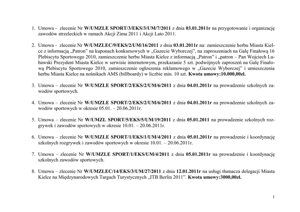 1. Umowa - zlecenie Nr W/UMZLE SPORT/3/EKS/3/UM/7/2011 z dnia 03.01.2011r na przygotowanie i organizację zawodów strzeleckich w ramach Akcji Zima 2011 i Akcji Lato 2011. 2. Umowa - zlecenie Nr W/UMZLEC/9/EKS/2/UM/16/2011 z dnia 03.01.2011r na: zamieszczenie herbu Miasta Kielce z informacją „Patron” na kuponach konkursowych w „Gazecie Wyborczej”, na zaproszeniach na Galę Finałową 16 Plebiscytu Sportowego 2010, zamieszczenie herbu Miasta Kielce z informacją „Patron” i „patron – Pan Wojciech Lubawski Prezydent Miasta Kielce w serwisie internetowym, przekazanie 5 szt. podwójnych zaproszeń na Galę Finałową Plebiscytu Sportowego 2010, zamieszczenie ogłoszenia reklamowego w „Gazecie Wyborczej” i umieszczenia herbu Miasta Kielce na nośnikach AMS (billboardy) w liczbie min. 10 szt. Kwota umowy:10.000,00zł. 3. Umowa – zlecenie Nr W/UMZLE SPORT/2/EKS/2/UM/6/2011 z dnia 04.01.2011r na prowadzenie szkolnych zawodów sportowych. 4. Umowa – zlecenie Nr W/UMZLE SPORT/2/EKS/2/UM/6/2011 z dnia 04.01.2011r na prowadzenie szkolnych zawodów sportowych w okresie 05.01. – 20.06.2011r. 5. Umowa – zlecenie Nr W/UMZL SPORT/5/EKS/5/UM/19/2011 z dnia 05.01.2011 na prowadzenie szkolnych rozgrywek i zawodów sportowych w okresie 10.01. – 20.06.2011r. 6. Umowa – zlecenie Nr W/UMZLE SPORT/1/EKS/1/UM/4/2011 z dnia 05.01.2011r na prowadzenie i koordynację szkolnych rozgrywek i zawodów sportowych w okresie 10.01. – 20.06.2011r. 7. Umowa – zlecenie Nr W/UMZLE SPORT/1/EKS/UM/4/2011 z dnia 05.01.2011r na prowadzenie i koordynację szkolnych zawodów sportowych. 8. Umowa – zlecenie Nr W/UMZLEC/14/EKS/3/UM/27/2011 z dnia 12.01.2011r na usługi tłumacza delegacji Miasta Kielce na Międzynarodowych Targach Turystycznych „ITB Berlin 2011”. Kwota umowy:3000,00zł. 1 9. Umowa – zlecenie Nr W/UMZLEC/EKS/5/UM/35/2011 z dnia 12.01.2011r na: zamieszczenie herbu Miasta Kielce z informacją „Patron” i „Patron – Pan Wojciech Lubawski Prezydent Miasta Kielce w serwisie internetowym, przekazania 5 szt. podwójnych zaproszeń na Galę Finałową Plebiscytu Sportowego 2010 Świętokrzyskie Gwiazdy Sportu i zamieszczenie ogłoszenia reklamowego w dodatku specjalnym do „Echa Dnia”. Kwota umowy:8.000,00zł. 10.Umowa – zlecenie Nr W/UMZLEC/22/EKS/6/UM/37/2011 z dnia 14.01.2011r na realizacje zadania z zakresu promocji Miasta Kielce w związku z udziałem zawodniczek Kieleckiego Stowarzyszenia Sportowego w rozgrywkach PGNiG Superliga Kobiet. Kwota umowy:70.000,00zł. 11.Umowa Nr W/WU/13/EKS/3/UM/432/2011 z dnia 19.01.2011r na umieszczenie logotypu Zamawiającego w kalendarzu sportowym na rok 2011., przedstawiającym zdjęcia piłkarzy Klubu Sportowego KORONA KIELCE. Kwota umowy:15.000,00zł. 12.Umowa Nr W/WU/6/EKS/2/UM/168/2011 z dnia 20.01.2011r na realizacje zadania z zakresu promocji Miasta Kielce w związku z udziałem zawodników UMKS Kielce w rozgrywkach II ligi koszykówki mężczyzn. Kwota umowy:50.000,00zł. 13.Umowa – zlecenie Nr W/UMZLE/29/EKS/11/UM/280/2011 z dnia 26.01.2011r na prowadzenie zajęć sportowych z zakresu badmintona w ramach Akcji Zima 2011. 14.Umowa – zlecenie Nr W/UMZLE SPORT/33/EKS/15/UM/284/2011 z dnia 26.01.2011r na obsługę sędziowską uczestników Turnieju Piłki Nożnej „Ferie z Futbolem” w ramach Akcji Zima 2011. Kwota umowy:1.200,00zł. 15.Umowa – zlecenie Nr W/UMZLE – SPORT/6/EKS/6/UM/329/2011 z dnia 26.01.2011r na obsługę medyczną uczestników imprez sportowo – rekreacyjnych organizowanych w ramach Akcji Zima 2011. 2 16.Umowa – zlecenie Nr W/UMZLE SPORT/36/EKS/18/UM/287/2011 z dnia 26.01.2011r na koordynacje i obsługę Turnieju Piłkarskiego „Ferie z Futbolem” organizowanego w ramach Akcji Zima 2011. Kwota umowy:600,00zł. 17.Umowa – zlecenie Nr W/UMZLE/35/EKS/17/UM/286/2011 z dnia 26.01.2011r na prowadzenie zająć sportowych z zakresu pięściarstwa „Ferie z Boksem” organizowanych w ramach Akcji Zima 2011. 18.Umowa – zlecenie Nr W/UMZLE SPORT/32/EKS/4/UM/283/2011 z dnia 26.01.2011r na prowadzenie zajęć w zakresie łucznictwa organizowanych w ramach Akcji Zima 2011. 19.Umowa – zlecenie Nr W//UMZLE SPORT/30/EKS/12/UM/281/2011 z dnia 26.01.2011r na prowadzenie zajęć i zawodów strzeleckich organizowanych w ramach Akcji Zima 2011. 20.Umowa – zlecenie Nr W/UMZLE SPORT/31/EKS/13/UM/282/2011 z dnia 26.01.2011r na prowadzenie zajęć sportowych z zakresu akrobatyki sportowej organizowanych w ramach Akcji Zima 2011. 21.Umowa – zlecenie Nr W/UMZLE SPORT/34/EKS/16/UM/285/2011 z dnia 26.01.2011r na prowadzenie zajęć lekkoatletycznych organizowanych w ramach Akcji Zima 2011. 22.Umowa – zlecenie Nr W/UMZLE SPORT/7/EKS/7/UM/330/2011 z dnia 26.01.2011r na prowadzenie zajęć sportowych w zakresie piłki siatkowej w ramach Akcji Zima 2011. 23.Umowa – zlecenie Nr W/UMZLE SPORT/8/EKS/8/UM/331/2011 z dnia 26.01.2011r na prowadzenie zajęć z zakresu piłki siatkowej w ramach Akcji Zima 2011. 24.Umowa – zlecenie Nr W/UMZLEC/43/EKS/19/UM/336/2011 z dnia 04.02.2011r na montaż i demontaż modułowego stoiska Kielce na targach turystycznych w Katowicach, Gdańsku, Warszawie i Poznaniu. Kwota umowy:37.852,00zł. 3 25.Umowa – zlecenie Nr W/UMZLEC/48/EKS/24/UM/449/2011 z dnia 16.02.2011r na wykonanie zadania z zakresu promocji Miasta Kielce w związku z prezentacja zawodników Drużyny Korony przed rundą wiosenna sezonu rozgrywkowego 2010/2011. Kwota umowy:2.500,00zł. 26.Umowa – zlecenie Nr W/UMZLEC//53/?EKS/29/UM/519/2011 z dnia 22.02.2011r na realizację zadania z zakresu promocji Miasta Kielce w związku z udziałem zawodników Klubu Sportowego Kick – Boxing Kielce w Mistrzostwach Polski Kobiet w boksie w Grudziądzu i Mistrzostwach Polski w Low – Kick w Kleszczewie. Kwota umowy:10.000,00zł. 27.Umowa – zlecenie Nr W/UMZLE/SPORT/10/EKS/10/UM/716/2011 z dnia 23.02.2011r na organizację i prowadzenie Szkolnych Turniejów Mini Siatkówki Dziewcząt i Chłopców w ramach Mistrzostw Kielc. 28.Umowa