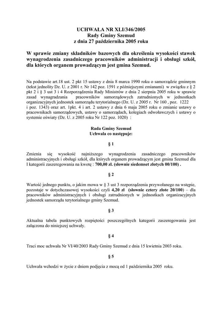 UCHWAŁA NR XLI/346/2005 Rady Gminy Szemud z dnia 27 października 2005 roku W sprawie zmiany składników bazowych dla określenia wysokości stawek wynagrodzenia zasadniczego pracowników administracji i obsługi szkół, dla których organem prowadzącym jest gmina Szemud. Na podstawie art.18 ust. 2 pkt 15 ustawy z dnia 8 marca 1990 roku o samorządzie gminnym (tekst jednolity Dz. U. z 2001 r. Nr 142 poz. 1591 z późniejszymi zmianami) w związku z § 2 pkt 2 i § 3 ust 3 i 4 Rozporządzenia Rady Ministrów z dnia 2 sierpnia 2005 roku w sprawie zasad wynagradzania pracowników samorządowych zatrudnionych w jednostkach organizacyjnych jednostek samorządu terytorialnego (Dz. U. z 2005 r. Nr 160 , poz. 1222 i poz. 1343) oraz art. 1pkt. 4 i art. 2 ustawy z dnia 6 maja 2005 roku o zmianie ustawy o pracownikach samorządowych, ustawy o samorządach, kolegiach odwoławczych i ustawy o systemie oświaty (Dz. U. z 2005 roku Nr 122 poz. 1020) : Rada Gminy Szemud Uchwala co następuje: §1 Zmienia się wysokość najniższego wynagrodzenia zasadniczego pracowników administracyjnych i obsługi szkół, dla których organem prowadzącym jest gmina Szemud dla I kategorii zaszeregowania na kwotę : 700,00 zł. (słownie siedemset złotych 00/100) . §2 Wartość jednego punktu, o jakim mowa w § 3 ust 3 rozporządzenia przywołanego na wstępie, pozostaje w dotychczasowej wysokości czyli 4,20 zł (słownie cztery złote 20/100) – dla pracowników administracyjnych i obsługi zatrudnionych w jednostkach organizacyjnych jednostek samorządu terytorialnego gminy Szemud. §3 Aktualna tabela punktowych rozpiętości poszczególnych kategorii zaszeregowania jest załączona do niniejszej uchwały. §4 Traci moc uchwała Nr VI/40/2003 Rady Gminy Szemud z dnia 15 kwietnia 2003 roku. §5 Uchwała wchodzi w życie z dniem podjęcia z mocą od 1 października 2005 roku.
