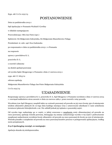 Sygn. akt I A Ca 1051/13 POSTANOWIENIE Dnia 22 października 2013 r. Sąd Apelacyjny w Poznaniu Wydział I Cywilny w składzie następującym: Przewodniczący: SSA Jan Futro (spr.) Sędziowie: SA Małgorzata Gulczyńska, SA Małgorzata Mazurkiewicz-Talaga Protokolant: st. sekr. sąd. Ewa Gadomska po rozpoznaniu w dniu 22 października 2013 r. w Poznaniu na rozprawie sprawy z powództwa K. Ł. przeciwko D. Ł. o rozwód i alimenty na skutek apelacji pozwanej od wyroku Sądu Okręgowego w Poznaniu z dnia 17 czerwca 2013 r. sygn. akt I C 1813/12 odrzuca apelację. Małgorzata Mazurkiewicz-Talaga Jan Futro Małgorzata Gulczyńska I A Ca 1051/13 UZASADNIENIE Rozpoznając sprawę z powództwa K. Ł. przeciwko D. Ł. Sąd Okręgowy w Poznaniu wyrokiem z dnia 17 czerwca 2013 r. rozwiązał małżeństwo stron zawarte w dniu 22 czerwca 1984 r. przez rozwód z winy powoda. Wyrokiem tym Sąd Okręgowy zasądził także na wniosek pozwanej od powoda na jej rzecz kwotę 350 zł miesięcznie tytułem alimentów płatnych do 10-tego dnia każdego miesiąca wraz z ustawowymi odsetkami w razie uchybienia terminowi płatności którejkolwiek z rat. Nie oddalił jednak jej żądania w pozostałej części. Od wyroku tego zaskarżając go w części, w jakiej orzeczono o zasądzeniu renty alimentacyjnej od powoda na rzecz pozwanej, apelację wniosła pozwana, domagając się zmiany zaskarżonego wyroku w tej części i podwyższenie zasądzonej zaskarżonym wyrokiem kwoty alimentów od powoda na rzecz pozwanej do kwoty po 500 zł miesięcznie. Wniosła ponadto o zasądzenie od powoda na rzecz pozwanej kosztów procesu w postępowaniu apelacyjnym, według norm przepisanych. S ą d Apelacyjny zważył, co następuje: Apelacja okazała się niedopuszczalna. Przede wszystkim zauważyć należy, że sprawa o rozwód może być połączona ze sprawą o alimenty na rzecz jednego z małżonków. Wówczas toczy się sprawa o „rozwód i alimenty”. Do tego ostatniego roszczenia nie mają jednak zastosowania regulacje dotyczące wyłącznie postępowania o rozwód w tym i te, które określając integralność wyroku rozwodowego nakazują sądowi działanie z urzędu. Jest to proces - choć czasem stroną dochodzącą alimentów jest strona pozwana - do którego stosuje się zwykłe reguły procesowe. W szczególności po zgłoszeniu żądania zasądzenia alimentów obowiązkiem sądu jest rozstrzygnięcie o tym żądaniu także, co do jego wysokości i oddalenie żądania niezasadnego. Zgodnie z ukształtowanym w orzecznictwie poglądem, jeżeli sąd - wbrew obowiązkowi wynikającemu z art. art. 325 k.p.c. - nie orzekł o zgłoszonym w żądaniu roszczeniu lub przyznał je w rozmiarze mniejszym, niż należało, strona może żądać zasądzenia tych roszczeń bądź w drodze uzupełnienia wyroku (art. 351 § 1 k.p.c.), bądź w drodze osobnego powództwa, nie może zaś do tego celu zmierzać przez wniesienie apelacji. Brak bowiem wyroku, jako niezbędnego substratu zaskarżenia powoduje niedopuszczalność apelacji a w konsekwencji jej odrzucenie. (wyrok Sądu Najwyższego z dnia 27 września 1973 r. III CRN 223/73 - OSNC 1974/7-8/134, postanowienie Sądu Najwyższego z dnia 21 września 2011 r. II PK 34/11 LEX nr 1103014) Także w świetle wyrażanych w literaturze poglądów należy przyjąć, że niedopuszczalność zaskarżenia orzeczenia powoduje m.in. brak, względnie niewłaściwość przedmiotu (substratu) zaskarżenia, polegający na nieistnieniu orzeczenia (zarządzenia) zaskarżalnego danym środkiem, w tym wypadek tzw. sententia non existens (W. D. środków odwoławczych w postępowaniu cywilnym ze względu na przedmiot zaskarżenia, Państwo i Prawo 97/5 s. 19). Z tych względów Sąd Apelacyjny na podstawie art. 373 w zw. z art. 370 k.p.c. apelację pozwanej odrzucił. Orzekanie o kosztach postępowania apelacyjnego było zbędne skoro powód kosztów nie poniósł i nie pozostały nieuiszczone koszty sądowe podlegające ściągnięciu. Małgorzata Mazurkiewicz-Talaga Jan Futro Małgorzata Gulczyńska