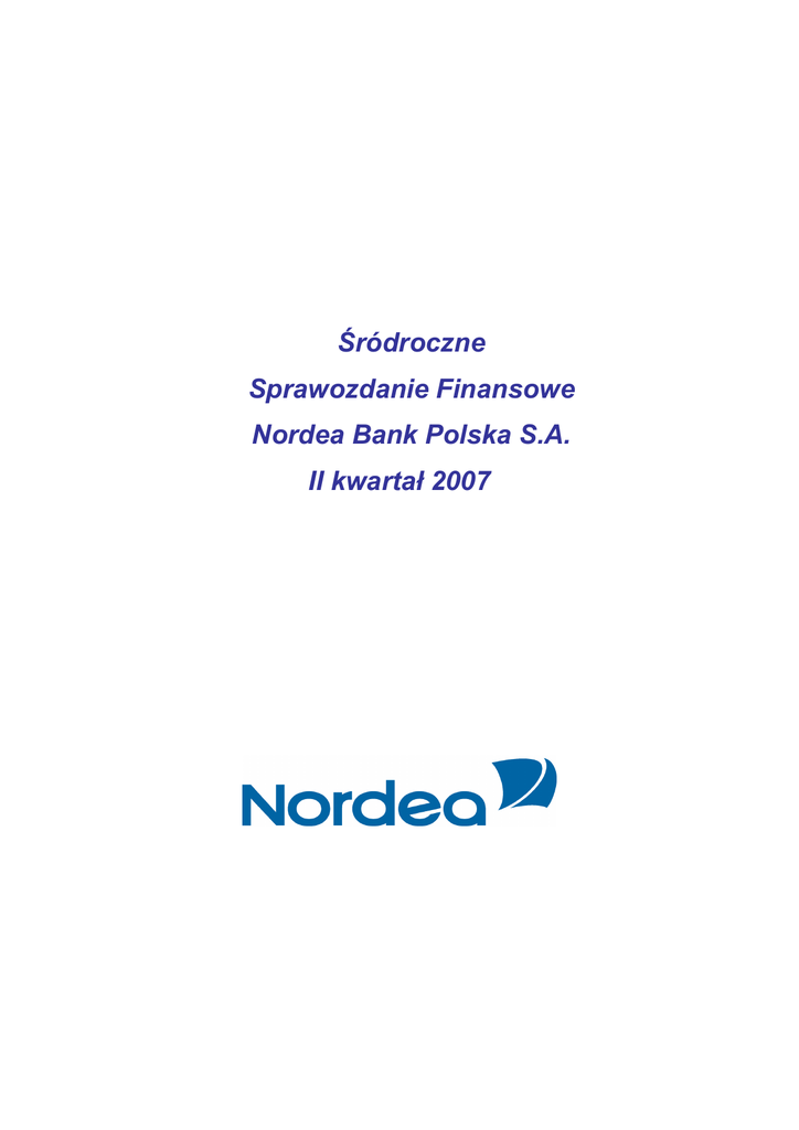 Śródroczne Sprawozdanie Finansowe Nordea Bank Polska S.A. II kwartał 2007 Wybrane dane finansowe 1 2 3 4 5 6 7 8 9 10 11 12 Przychody odsetkowe Przychody prowizyjne Zysk przed opodatkowaniem Zysk za okres Przepływy środków pienięŜnych w danym roku NaleŜności od banków NaleŜności od klientów Aktywa ogółem Zobowiązania wobec banków Zobowiązania wobec klientów Zobowiązania ogółem Kapitały własne ogółem 13 Liczba akcji w tys. zł w tys. EUR okres okres okres okres od 01/01/2007 od 01/01/2006 od 01/01/2007 od 01/01/2006 do 30/06/2007 do 30/06/2006 do 30/06/2007 do 30/06/2006 174 549 149 095 45 354 38 227 33 740 24 977 8 767 6 404 35 375 32 304 9 192 8 283 26 349 23 588 6 847 6 048 (273 762) 300 571 6 730 831 7 939 777 1 771 784 5 255 290 7 346 269 593 508 (10 514) 1 023 413 4 617 217 6 454 872 1 489 214 4 320 710 5 914 193 540 679 (71 133) 79 816 1 787 358 2 108 390 470 943 1 395 531 1 950 786 157 605 (2 696) 253 107 1 141 914 1 596 397 368 307 1 068 583 1 462 678 133 719 33 617 833 33 617 833 - - Wartość księgowa na jedną akcję 14 (w zł/EUR) 17,65 16,08 6,11 3,98 15 Współczynnik wypłacalności 10,40 10,89 - - 0,78 0,70 0,21 0,18 Zysk (strata) na jedną akcję (w 16 zł/EUR) Śródroczne sprawozdanie finansowe Nordea Bank Polska S.A. za II kwartał 2007 w tys. zł Rachunek Zysków i Strat 01/04/2007 01/01/2007 01/04/2006 01/01/2006 30/06/2007 30/06/2007 30/06/2006 30/06/2006 174 549 102 347 72 202 33 740 6 914 26 826 79 058 40 761 38 297 5 91 672 54 263 37 409 18 528 3 480 15 048 12 767 2 840 9 927 149 095 79 030 70 065 24 977 4 451 20 526 6 7 22 551 1 562 41 012 6 168 13 394 1 819 24 305 2 626 76 570 146 208 63 437 117 522 51 011 97 266 36 662 74 241 24 697 47 669 19 338 37 897 26 314 6 018 49 597 11 560 17 324 6 249 36 344 12 470 57 029 254 108 826 2 007 42 911 (692) 86 711 (1 493) Zysk przed opodatkowaniem Podatek dochodowy 19 287 4 368 35 375 9 026 21 218 6 731 32 304 8 716 Zysk za okres 14 919 26 349 14 487 23 588 01/04/2007 01/01/2007 01/04/2006 01/01/2006 Nota PRZYCHODY OPERACYJNE Przychody odsetkowe Koszty odsetkowe Wynik odsetkowy netto Przychody prowizyjne Koszty prowizyjne Wynik prowizyjny netto Wynik wyceny instrumentów finansowych wg wartości godziwej i rewaluacji Pozostałe przychody operacyjne 4 Suma przychodów operacyjnych KOSZTY OPERACYJNE Koszty administracyjne - osobowe - pozostałe koszty administracyjne Amortyzacja Suma kosztów operacyjnych 8 Utrata wartości kredytów i poŜyczek 9 30/06/2007 30/06/2007 30/06/2006 30/06/2006 Zysk przypadający na jedną akcję 0,44 0,78 0,43 0,70 Rozwodniony zysk na jedną akcję 0,44 0,78 0,43 0,70 3 Śródroczne sprawozdanie finansowe Nordea Bank Polska S.A. za II kwartał 2007 w tys. zł Bilans AKTYWA Nota Kasa i środki w banku centralnym Pozostałe aktywa finansowe wyceniane w wartości godziwej przez rachunek zysków i strat NaleŜności od banków NaleŜności od klientów Aktywa finansowe przeznaczone do obrotu Udziały w spółkach zaleŜnych Wartości niematerialne Rzeczowe środki trwałe Aktywa z tytułu podatku odroczonego Pozostałe aktywa AKTYWA OGÓŁEM 10 10 11 PASYWA Zobowiązania wobec banków Zobowiązania wobec klientów Zobowiązania z tytułu emisji dłuŜnych papierów wartościowych Zobowiązania finansowe przeznaczone do obrotu Pozostałe zobowiązania Pasywa z tytułu podatku odroczonego Zobowiązania podporządkowane Rezerwy ZOBOWIĄZANIA OGÓŁEM Kapitał podstawowy Kapitał akcyjny Kapitał zapasowy Kapitał rezerwowy Zysk za okres Kapitały własne ogółem PASYWA OGÓŁEM 10 10 11 01/01/2007 30/06/2007 184 877 01/01/2006 31/12/2006 131 738 01/01/2006 30/06/2006 142 431 508 798 300 571 6 730 831 535 506 681 680 5 335 933 456 983 1 061 028 4 617 217 26 511 40 851 56 065 20 251 71 022 7 939 777 26 595 44 014 56 264 23 971 82 447 6 918 148 4 802 2 529 48 751 51 519 26 867 42 745 6 454 872 01/01/2007 30/06/2007 1 771 784 5 255 290 01/01/2006 31/12/2006 1 383 171 4 799 915 01/01/2006 30/06/2006 1 489 214 4 320 710 1 506 1 824 1 824 13 355 106 688 6 860 180 129 10 657 7 346 269 567 159 168 089 285 955 113 115 26 349 593 508 7 939 777 13 177 127 536 11 617 13 749 6 350 989 517 091 168 089 285 955 63 047 50 068 567 159 6 918 148 10 781 74 117 5 408 12 139 5 914 193 517 091 168 089 285 955 63 047 23 588 540 679 6 454 872 4 Śródroczne sprawozdanie finansowe Nordea Bank Polska S.A. za II kwartał 2007 w tys. zł Zestawienie zmian w kapitale własnym Saldo na 1/01/2007 Podział zysku 2006 Zysk za okres Saldo na koniec 30/06/2007 Kapitał akcyjny 168 089 168 089 Kapitał zapasowy 285 955 285 955 Kapitał rezerwowy 63 047 50 068 113 115 Zysk zatrzymany i zysk za okres 50 068 (50 068) 26 349 26 349 Kapitał razem 567 159 26 349 593 508 Saldo na 1/01/2006 Podział zysku 2005 Pokrycie straty z lat ubiegłych Zysk za okres Saldo na koniec 31/12/2006 Kapitał akcyjny 168 089 168 089 Kapitał zapasowy 302 760 (16 805) 285 955 Kapitał rezerwowy 32 320 30 727 63 047 Zysk zatrzymany i zysk za okres 13 922 ( 30 727) 16 805 50 068 50 068 Kapitał razem 517 091 50 068 567 159 Saldo na 1/01/2006 Podział zysku 2005 Pokrycie straty z lat ubiegłych Zysk za okres Saldo na koniec 30/06/2006 Kapitał akcyjny 168 089 168 089 Kapitał zapasowy 302 760 (16 805) 285 955 Zysk zatrzymany i Kapitał rezerwowy zysk za okres 32 320 13 607 30 727 ( 30 727) 16 805 23 588 63 047 23 588 Kapitał razem 517 091 23 588 540 679 5 Śródroczne sprawozdanie finansowe Nordea Bank Polska S.A. za II kwartał 2007 w tys. zł Rachunek przepływów pienięŜnych 01/04/2007 01/01/2007 01/04/2006 01/01/2006 30/06/2007 30/06/2007 30/06/2006 30/06/2006 Działalność operacyjna Zysk za okres Korekta do uzgodnienia zysku netto ze środkami pienięŜnymi netto z działalności operacyjnej Odsetki zapłacone i otrzymane Podatek dochodowy Efekt róŜnic kursowych dla działalności operacyjnej Działalność operacyjna Zmiany w aktywach operacyjnych Zmiany w kredytach instytucji finansowych Zmiany w poŜyczkach (akcji kredytowe