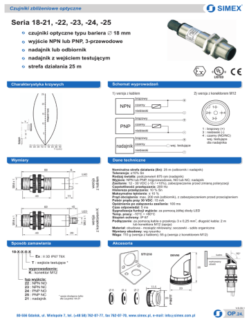R SIMEX Czujniki zbli¿eniowe optyczne Seria 18-21, -22, -23, -24, -25 18 mm czujniki optyczne typu bariera Æ wyjœcie NPN lub PNP, 3-przewodowe nadajnik lub odbiornik nadajnik z wejœciem testuj¹cym strefa dzia³ania 25 m UL C R U LISTED Schemat wyprowadzeñ Charakterystyka krzywych 1) wersja z kablem 2) wersja z konektorem M12 br¹zowy Odleg³oœæ X (cm) NPN + czarny 1 niebieski - Odbiornik br¹zowy PNP + - br¹zowy Nadajnik 4 3 czarny niebieski nadajnik 2 czarny + 1 : br¹zowy (+) 3 : niebieski (-) 4 : czarny (NO/NC) wej. testuj¹ce dla nadajnika wej. testuj¹ce niebieski - Dane techniczne wersja z konektorem K wersja z kablem Wymiary Sposób zamawiania Nominalna strefa dzia³ania (Sn): 25 m (odbiornik i nadajnik) Tolerancja: ±10% Sn Rodzaj œwiat³a: podczerwieñ 875 çm (nadajnik) Wyjœcie: NPN lub PNP, trójprzewodowe, NO lub NC; nadajnik Zasilanie: 12 - 30 VDC (-15 / +10%), zabezpieczenie przed zmian¹ polaryzacji Czêstotliwoœæ prze³¹czania: 200 Hz Histereza prze³¹czania: 10 % Sn Maksymalne têtnienie: ? 10 % Pr¹d obci¹¿enia: max. 200 mA (odbiornik), z zabezpieczeniem przed przeci¹¿eniem Pobór pr¹du przy 30 VDC: 15 mA OpóŸnienie po za³¹czeniu zasilania: 100 ms Czas odpowiedzi: 5 ms Sygnalizacja funkcji wyjœcia: za pomoc¹ ¿ó³tej diody LED Temp. pracy: -10°C ÷ +60°C Stopieñ ochrony: IP 67 Pod³¹czenie: za pomoc¹ kabla o przekroju 3 x 0,25 mm2, d³ugoœæ kabla: 2 m lub konektora M12 (opcja) Materia³: obudowa - mosi¹dz niklowany; soczewki - szk³o organiczne Wymiary obudowy: wg rysunku Waga: 110 g (wersja z kablem); 55 g (wersja z konektorem M12) Akcesoria 18-X-X-X-X Ex : II 3D IP67 T6X DEV90 lustro wykrywany obiekt T : wejœcie testuj¹ce * typ wyjœcia: 22 : NPN NO 23 : NPN NC 24 : PNP NO 25 : PNP NC 21 : nadajnik * opcja dostêpna tylko dla czujnika 18-21 P18OTT wyprowadzenie: K : konektor M12 V.6.09.1 80-556 Gdañsk, ul. Wielopole 7, tel. (+48 58) 762-07-77, fax 762-07-70, www.simex.pl, e-mail: [email protected] OP.24.