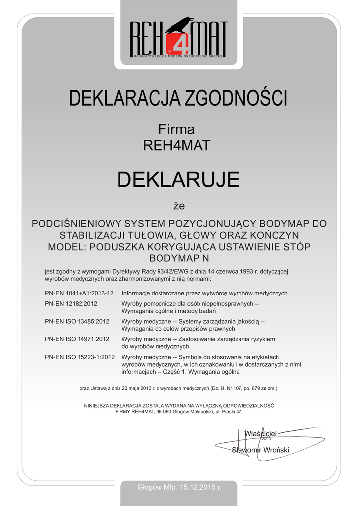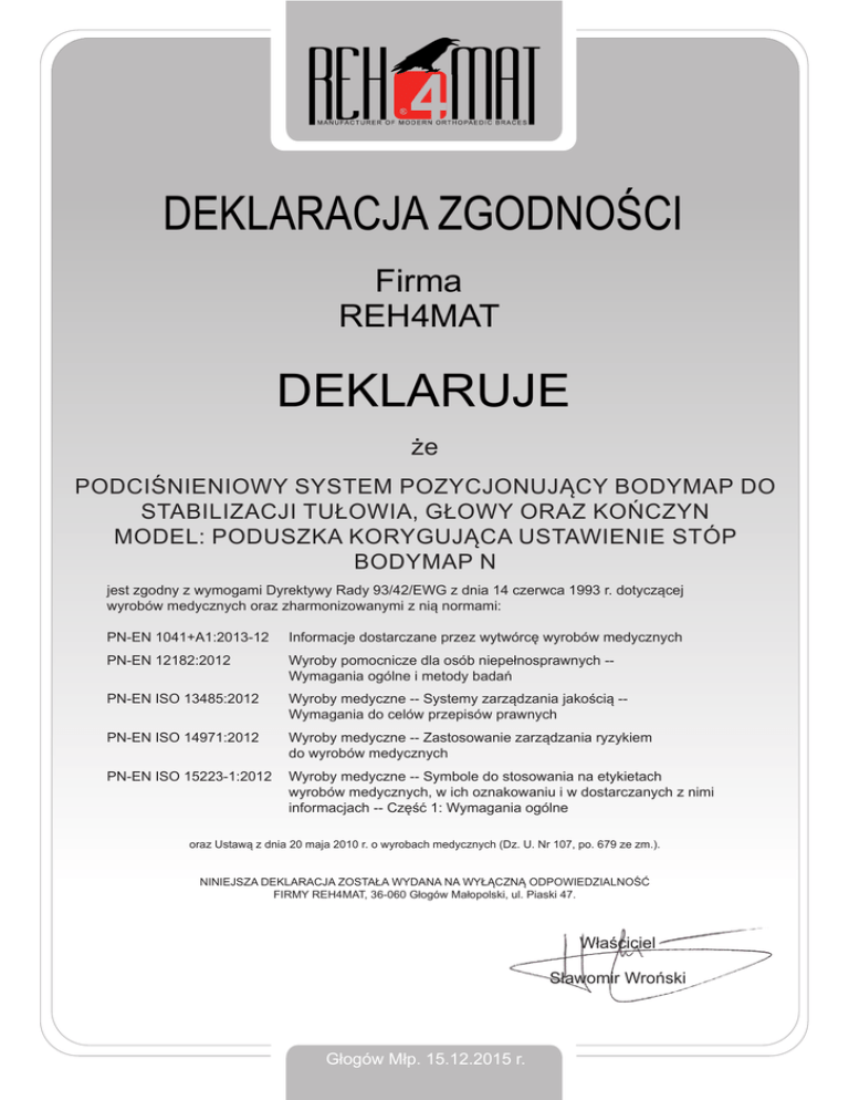 DEKLARACJA ZGODNOŚCI Firma REH4MAT DEKLARUJE że PODCIŚNIENIOWY SYSTEM POZYCJONUJĄCY BODYMAP DO STABILIZACJI TUŁOWIA, GŁOWY ORAZ KOŃCZYN MODEL: PODUSZKA KORYGUJĄCA USTAWIENIE STÓP BODYMAP N jest zgodny z wymogami Dyrektywy Rady 93/42/EWG z dnia 14 czerwca 1993 r. dotyczącej wyrobów medycznych oraz zharmonizowanymi z nią normami: PN-EN 1041+A1:2013-12 Informacje dostarczane przez wytwórcę wyrobów medycznych PN-EN 12182:2012 Wyroby pomocnicze dla osób niepełnosprawnych -Wymagania ogólne i metody badań PN-EN ISO 13485:2012 Wyroby medyczne -- Systemy zarządzania jakością -Wymagania do celów przepisów prawnych PN-EN ISO 14971:2012 Wyroby medyczne -- Zastosowanie zarządzania ryzykiem do wyrobów medycznych PN-EN ISO 15223-1:2012 Wyroby medyczne -- Symbole do stosowania na etykietach wyrobów medycznych, w ich oznakowaniu i w dostarczanych z nimi informacjach -- Część 1: Wymagania ogólne oraz Ustawą z dnia 20 maja 2010 r. o wyrobach medycznych (Dz. U. Nr 107, po. 679 ze zm.). NINIEJSZA DEKLARACJA ZOSTAŁA WYDANA NA WYŁĄCZNĄ ODPOWIEDZIALNOŚĆ FIRMY REH4MAT, 36-060 Głogów Małopolski, ul. Piaski 47. Właściciel Sławomir Wroński Głogów Młp. 15.12.2015 r.