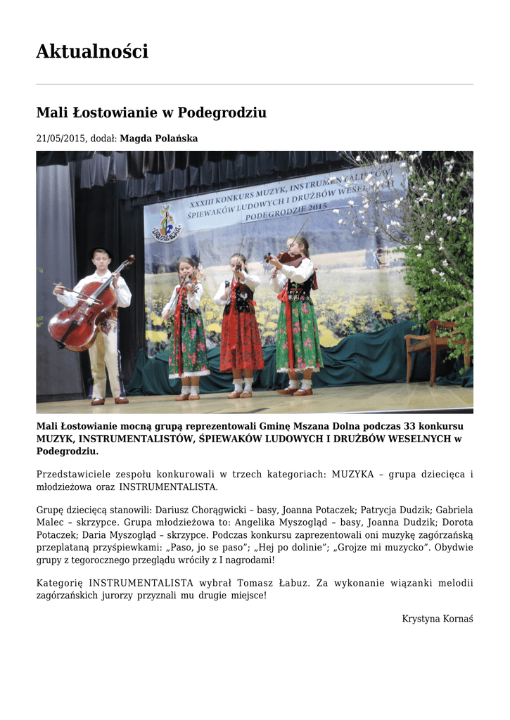 Aktualności Mali Łostowianie w Podegrodziu 21/05/2015, dodał: Magda Polańska Mali Łostowianie mocną grupą reprezentowali Gminę Mszana Dolna podczas 33 konkursu MUZYK, INSTRUMENTALISTÓW, ŚPIEWAKÓW LUDOWYCH I DRUŻBÓW WESELNYCH w Podegrodziu. Przedstawiciele zespołu konkurowali w trzech kategoriach: MUZYKA – grupa dziecięca i młodzieżowa oraz INSTRUMENTALISTA. Grupę dziecięcą stanowili: Dariusz Chorągwicki – basy, Joanna Potaczek; Patrycja Dudzik; Gabriela Malec – skrzypce. Grupa młodzieżowa to: Angelika Myszogląd – basy, Joanna Dudzik; Dorota Potaczek; Daria Myszogląd – skrzypce. Podczas konkursu zaprezentowali oni muzykę zagórzańską przeplataną przyśpiewkami: „Paso, jo se paso”; „Hej po dolinie”; „Grojze mi muzycko”. Obydwie grupy z tegorocznego przeglądu wróciły z I nagrodami! Kategorię INSTRUMENTALISTA wybrał Tomasz Łabuz. Za wykonanie wiązanki melodii zagórzańskich jurorzy przyznali mu drugie miejsce! Krystyna Kornaś
