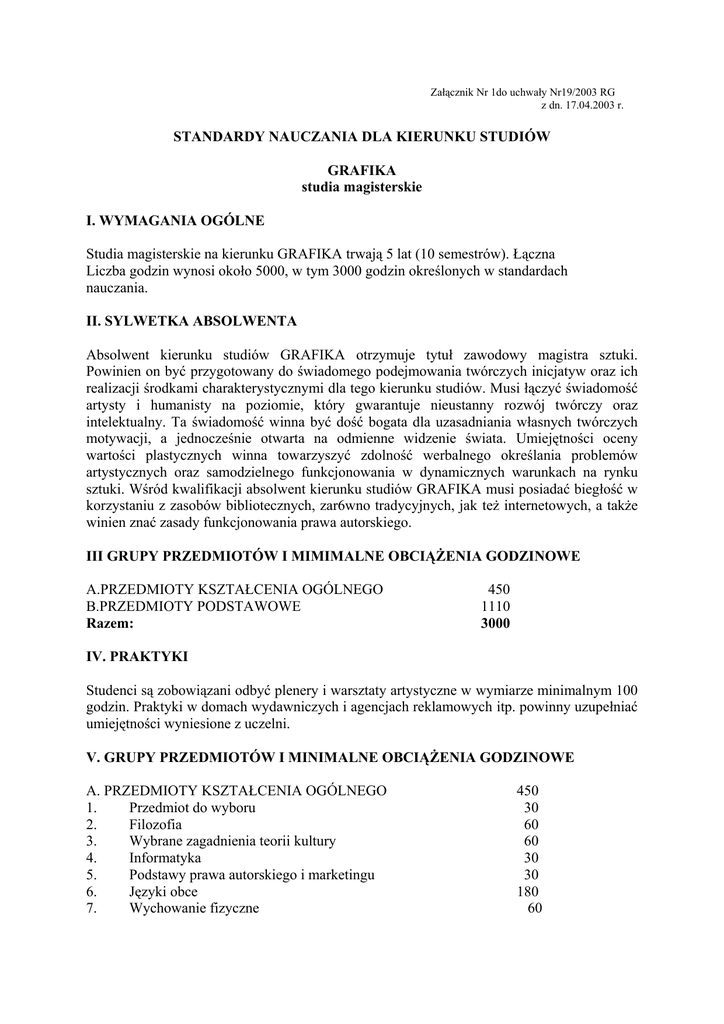Załącznik Nr 1do uchwały Nr19/2003 RG z dn. 17.04.2003 r. STANDARDY NAUCZANIA DLA KIERUNKU STUDIÓW GRAFIKA studia magisterskie I. WYMAGANIA OGÓLNE Studia magisterskie na kierunku GRAFIKA trwają 5 lat (10 semestrów). Łączna Liczba godzin wynosi około 5000, w tym 3000 godzin określonych w standardach nauczania. II. SYLWETKA ABSOLWENTA Absolwent kierunku studiów GRAFIKA otrzymuje tytuł zawodowy magistra sztuki. Powinien on być przygotowany do świadomego podejmowania twórczych inicjatyw oraz ich realizacji środkami charakterystycznymi dla tego kierunku studiów. Musi łączyć świadomość artysty i humanisty na poziomie, który gwarantuje nieustanny rozwój twórczy oraz intelektualny. Ta świadomość winna być dość bogata dla uzasadniania własnych twórczych motywacji, a jednocześnie otwarta na odmienne widzenie świata. Umiejętności oceny wartości plastycznych winna towarzyszyć zdolność werbalnego określania problemów artystycznych oraz samodzielnego funkcjonowania w dynamicznych warunkach na rynku sztuki. Wśród kwalifikacji absolwent kierunku studiów GRAFIKA musi posiadać biegłość w korzystaniu z zasobów bibliotecznych, zar6wno tradycyjnych, jak też internetowych, a także winien znać zasady funkcjonowania prawa autorskiego. III GRUPY PRZEDMIOTÓW I MIMIMALNE OBCIĄŻENIA GODZINOWE A.PRZEDMIOTY KSZTAŁCENIA OGÓLNEGO B.PRZEDMIOTY PODSTAWOWE Razem: 450 1110 3000 IV. PRAKTYKI Studenci są zobowiązani odbyć plenery i warsztaty artystyczne w wymiarze minimalnym 100 godzin. Praktyki w domach wydawniczych i agencjach reklamowych itp. powinny uzupełniać umiejętności wyniesione z uczelni. V. GRUPY PRZEDMIOTÓW I MINIMALNE OBCIĄŻENIA GODZINOWE A. PRZEDMIOTY KSZTAŁCENIA OGÓLNEGO 1. Przedmiot do wyboru 2. Filozofia 3. Wybrane zagadnienia teorii kultury 4. Informatyka 5. Podstawy prawa autorskiego i marketingu 6. Języki obce 7. Wychowanie fizyczne 450 30 60 60 30 30 180 60 B. PRZEDMIOTY PODSTAWOWE 1. 2. 3. 4. 5. 6. 7. 8. 9. 10 Historia sztuki Historia grafiki Rysunek Malarstwo lub rzeźba Psychofizjologia widzenia Wiedza o działaniach i strukturach wizualnych Fotografia Podstawy grafiki warsztatowej Podstawy grafiki projektowej Warsztaty komputerowe C. PRZEDMIOTY KIERUNKOWE 1. 2. 3. 4. 5. 6. Grafika warsztatowa lub projektowanie graficzne Grafika edytorska Grafika multimedialna Liternictwo i typografia Psychologia reklamy Magisterska pracownia artystyczna 1440 120 30 420 420 30 90 90 90 90 60 1110 600 120 120 90 30 50 VI. TREŚCI PROGRAMOWE PRZEDMIOTÓW A. PRZEDMIOTY KSZTAŁCENIA OGÓLNEGO 1. Przedmiot do wyboru Etyka, estetyka, historia kultury, logika itp. 2. Filozofia Zarys historii myśli filozoficznej, elementy logiki i estetyki, współczesne trendy filozoficzne ich znaczenie dla twórczości artystycznej. 3. Wybrane zagadnienia teorii kultury. Główne zagadnienia kultury i ich znaczenia dla praktyki artystycznej. Specyfika współczesnej cywilizacji i powodowane nią zmiany w kulturze. Idee kulturotw6rcze, doktryny estetyczne mające bezpośredni związek ze sztuką. 4. Informatyka Elementarne pojęcia informatyki. Znajomość działania kornputer6w i podstawowych programów cyfrowych. Wykorzystanie ich do twórczości plastycznej w grafice projektowej i warsztatowej. 5. Podstawy prawa autorskiego i marketingu Prawo autorskie, jego znaczenie ochronne dla twórcy dzieła. Metody i strategia promocji twórczości plastycznej. B. PRZEDMIOTY PODSTAWOWE 1. Historia sztuki Podstawy historii sztuki od paleolitu do współczesności, ze szczególnym uwzględnieniem sztuki ostatnich dziesięcioleci. Umiejętność analizy utwor6w artystycznych w ścisłym powiązaniu z historią i doktrynami estetycznymi. 2. Historia grafiki Rola grafiki na przestrzeni dziejów sztuki. Historyczny rozwój polskiej grafiki warsztatowej, edytorskiej, projektowej i plakatu. 3. Rysunek Rysunek podstawowym środkiem wyrazu i głównym sposobem porozumiewania się w dziedzinie sztuk pięknych. Umiejętność posługiwania się rysunkiem jako pomocniczym medium projektującym dzieło, jak też środkiem finalnym. 4. Malarstwo lub rzeźba • malarstwo: umiejętność kształtowania kompozycji barwnych, zasady malarskiej ekspresji i jej znaczenie dla grafiki; • rzeźba jako sposób rozwijania wyobraźni przestrzennej. Wykorzystanie różnorodnych materiałów rzeźbiarskich 5. Psychofizjologia widzenia Spostrzegawczość jako środek przekazu. Widzialna barwna gama jej odbiór emocjonalny, czytelność i znaczenie kształtu. Różnica znaczeń widzenia dla projektanta i artysty. 6. Wiedza o działaniach i strukturach wizualnych Podstawowe reguły kompozycji plastycznych. Umiejętność kształtowania płaskich i przestrzennych struktur wizualnych oraz dzieł animowanych. 7. Fotografia Obsługa sprzętu fotograficznego tradycyjnego i cyfrowego. Kreatywna fotografia jej użycie w grafice projektowej i warsztatowej. 8. Podstawy grafiki warsztatowej Praktyczna znajomość podstawowych metod druku artystycznego: wklęsłego, płaskiego i wypukłego. Druk cyfrowy jako alternatywa dla tradycyjnego warsztatu. Grafika wielobarwna: normy i zwyczaje, kultura środowiskowa. Historia i współczesność w grafice. 9. Podstawy grafiki projektowej Normy i narzędzia dotyczące kultury projektowania. Ogólne zasady i reguły tworzenia warsztatu projektanta sprawność w operowaniu nim. Historia i współczesność grafiki projektowej. 10. Warsztaty komputerowe Praktyczne opanowanie podstawowych programów komputerowych, ich znaczenie we współczesnej sztuce projektowania i w grafice warsztatowej. Bieżące śledzenie rozwoju technik komputerowych (aczkolwiek rezultaty uzyskiwane w za pomocą aparatów cyfrowych np. kamera, aparat fot. używane są w komputerach.) C. PRZEDMIOTY KIERUNKOWE 1. Grafika warsztatowa lub projektowanie graficzne Profesjonalne opanowanie sprawności grafika warsztatowego lub projektanta. Swobodna biegła umiejętność wykorzystywania warsztatu dla zamierzonyc