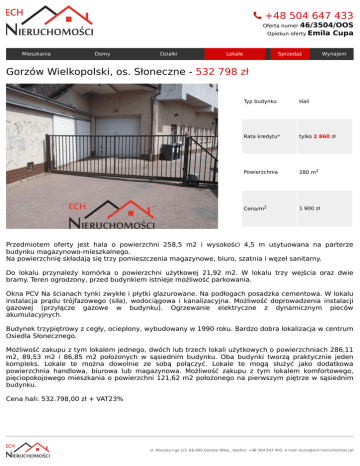 +48504647433 Ofertanumer46/3504/OOS OpiekunofertyEmilaCupa Mieszkania Domy Działki Lokale Sprzedaż Wynajem GorzówWielkopolski,os.Słoneczne-532798zł Typbudynku Hall Ratakredytu* tylko2860zł Powierzchnia 280m2 Cena/m2 1900zł Przedmiotem oferty jest hala o powierzchni 258,5 m2 i wysokości 4,5 m usytuowana na parterze budynkumagazynowo-mieszkalnego. Napowierzchnięskładająsiętrzypomieszczeniamagazynowe,biuro,szatniaiwęzełsanitarny. Do lokalu przynależy komórka o powierzchni użytkowej 21,92 m2. W lokalu trzy wejścia oraz dwie bramy.Terenogrodzony,przedbudynkiemistniejemożliwośćparkowania. OknaPCVNaścianachtynkizwykłeipłytkiglazurowane.Napodłogachposadzkacementowa.Wlokalu instalacja prądu trójfazowego (siła), wodociągowa i kanalizacyjna. Możliwość doprowadzenia instalacji gazowej (przyłącze gazowe w budynku). Ogrzewanie elektryczne z dynamicznym pieców akumulacyjnych. Budynektrzypiętrowyzcegły,ocieplony,wybudowanyw1990roku.Bardzodobralokalizacjawcentrum OsiedlaSłonecznego. Możliwośćzakupuztymlokalemjednego,dwóchlubtrzechlokaliużytkowychopowierzchniach286,11 m2, 89,53 m2 i 86,85 m2 położonych w sąsiednim budynku. Oba budynki tworzą praktycznie jeden kompleks. Lokale te można dowolnie ze sobą połączyć. Lokale te mogą służyć jako dodatkowa powierzchnia handlowa, biurowa lub magazynowa. Możliwość zakupu z tym lokalem komfortowego, pięciopokojowegomieszkaniaopowierzchni121,62m2położonegonapierwszympiętrzewsąsiednim budynku. Cenahali:532.798,00zł+VAT23% ul.MieszkaI-go2/3,66-400GorzówWlkp.,telefon:+48504647443,e-mail:[email protected]