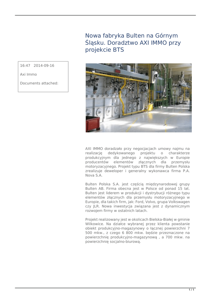 Nowa fabryka Bulten na Górnym Śląsku. Doradztwo AXI IMMO przy projekcie BTS 16:47 2014-09-16 Axi Immo Documents attached: AXI IMMO doradzało przy negocjacjach umowy najmu na realizację dedykowanego projektu o charakterze produkcyjnym dla jednego z największych w Europie producentów elementów złącznych dla przemysłu motoryzacyjnego. Projekt typu BTS dla firmy Bulten Polska zrealizuje deweloper i generalny wykonawca firma P.A. Nova S.A. Bulten Polska S.A. jest częścią międzynarodowej grupy Bulten AB. Firma obecna jest w Polsce od ponad 15 lat. Bulten jest liderem w produkcji i dystrybucji różnego typu elementów złącznych dla przemysłu motoryzacyjnego w Europie, dla takich firm, jak: Ford, Volvo, grupa Volkswagen czy JLR. Nowa inwestycja związana jest z dynamicznym rozwojem firmy w ostatnich latach. Projekt realizowany jest w okolicach Bielska-Białej w gminie Wilkowice. Na działce wybranej przez klienta powstanie obiekt produkcyjno-magazynowy o łącznej powierzchni 7 500 mkw., z czego 6 800 mkw. będzie przeznaczone na powierzchnię produkcyjno-magazynową , a 700 mkw. na powierzchnię socjalno-biurową. 1/1