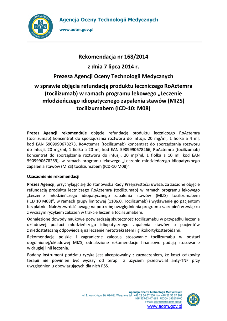 Agencja Oceny Technologii Medycznych www.aotm.gov.pl Rekomendacja nr 168/2014 z dnia 7 lipca 2014 r. Prezesa Agencji Oceny Technologii Medycznych w sprawie objęcia refundacją produktu leczniczego RoActemra (tocilizumab) w ramach programu lekowego „Leczenie młodzieńczego idiopatycznego zapalenia stawów (MIZS) tocilizumabem (ICD-10: M08) Prezes Agencji rekomenduje objęcie refundacją produktu leczniczego RoActemra (tocilizumab) koncentrat do sporządzania roztworu do infuzji, 20 mg/ml, 1 fiolka a 4 ml, kod EAN 5909990678273, RoActemra (tocilizumab) koncentrat do sporządzania roztworu do infuzji, 20 mg/ml, 1 fiolka a 20 ml, kod EAN 5909990678266, RoActemra (tocilizumab) koncentrat do sporządzania roztworu do infuzji, 20 mg/ml, 1 fiolka a 10 ml, kod EAN 5909990678259), w ramach programu lekowego „Leczenie młodzieńczego idiopatycznego zapalenia stawów (MIZS) tocilizumabem (ICD-10 M08)”. Uzasadnienie rekomendacji Prezes Agencji, przychylając się do stanowiska Rady Przejrzystości uważa, za zasadne objęcie refundacją produktu leczniczego RoActemra (tocilizumab) w ramach programu lekowego „Leczenie młodzieńczego idiopatycznego zapalenia stawów (MIZS) tocilizumabem (ICD 10 M08)”, w ramach grupy limitowej (1106.0, Tocilizumab) i wydawanie go pacjentom bezpłatnie. Należy zwrócić uwagę na potrzebę uwzględnienia programu szczepień w związku z wyższym ryzykiem zakażeń w trakcie leczenia tocilizumabem. Odnalezione dowody naukowe potwierdzają skuteczność tocilizumabu w przypadku leczenia układowej postaci młodzieńczego idiopatycznego zapalenia stawów u pacjentów z niedostateczną odpowiedzią na leczenie metotreksatem i glikokortykosteroidami. Rekomendacje polskie i zagraniczne zalecają stosowanie tocilizumabu w postaci uogólnionej/układowej MIZS, odnalezione rekomendacje finansowe podają stosowanie w drugiej linii leczenia. Podany instrument podziału ryzyka jest akceptowalny z zaznaczeniem, że koszt całkowity terapii nie powinien być wyższy od terapii z użyciem przeciwciał anty-TNF przy uwzględnieniu obowiązujących dla nich RSS. ___________________________________________________________________________ Agencja Oceny Technologii Medycznych ul. I. Krasickiego 26, 02-611 Warszawa tel. +48 22 56 67 200 fax +48 22 56 67 202 NIP 525-23-47-183 REGON 140278400 e-mail: [email protected] www.aotm.gov.pl Rekomendacja nr 168/2014 Prezesa AOTM z dnia 7 lipca 2014 r. Przedmiot wniosku Wnioskodawca, we wniosku o objęcie refundacją i ustalenie urzędowej ceny zbytu produktu leczniczego RoActemra (tocilizumab) koncentrat do sporządzania roztworu do infuzji, 20 mg/ml, 1 fiolka a 4 ml, kod EAN 5909990678273, RoActemra (tocilizumab) koncentrat do sporządzania roztworu do infuzji, 20 mg/ml, 1 fiolka a 20 ml, kod EAN 5909990678266, RoActemra (tocilizumab) koncentrat do sporządzania roztworu do infuzji, 20 mg/ml, 1 fiolka a 10 ml, kod EAN 5909990678259), w ramach programu lekowego „Leczenie młodzieńczego idiopatycznego zapalenia stawów (MIZS) tocilizumabem (ICD 10 M08), Problem zdrowotny Młodzieńcze idiopatyczne zapalenie stawów (MIZS; ICD-10: M08) jest najczęstszą przewlekłą układową chorobą tkanki łącznej wieku rozwojowego o podłożu autoimmunologicznym. Według kryteriów przyjętych przez ILAR, MIZS dotyczy heterogennej grupy zapaleń stawów rozpoczynających się przed 16. r.ż. i trwających co najmniej 6 tyg. Szczyt zachorowań stwierdza się między 1. a 3. r.ż., częściej u dziewczynek. MIZS jest chorobą rzadką, może rozpocząć się u dzieci przed 16. r.ż. i dotyczy 80-100 zachorowań/100 tys. dzieci. Postać wielostawowa ma dwa szczyty zachorowań: między 2. i 4. r.ż. oraz między 6. i 12. r.ż. MIZS o początku uogólnionym (postać układowa, uMIZS) – najcięższy przebieg kliniczny i najpoważniejsze następstwa. Stanowi 10-20% wszystkich postaci MIZS, występuje z jednakową częstością u obu płci. Charakterystyczna grupa objawów: nawracająca gorączka, wysypka skórna najczęściej na tułowiu, zapalenie stawów, uogólnione powiększenie węzłów chłonnych lub/oraz wątroby/śledziony. Wskaźniki laboratoryjne mogą być znacznie podwyższone. Obecnie można wyróżnić 2 podgrupy choroby: z dominującymi objawami układowymi lub stawowymi. MIZS o początku wielostawowym (co najmniej 5 stawów, wMIZS) – postać wielostawowa u 20-30% chorych. Rozpoczyna się na ogół w wieku dojrzewania, może mieć ostry początek ze stanami podgorączkowymi, sztywnością poranną oraz znacznie podwyższonymi czynnikami zapalnymi. Celem postępowania farmakologicznego jest zmniejszenie aktywności zapalnej i immunologicznej choroby, aby nie dopuścić do postępującej dysfunkcji narządu ruchu. W ramach I linii leczenia w przebiegu wMIZS oraz u pacjentów z uMIZS z dominacją objawów stawowych stosuje się: Metotreksat (MTX), inne leki modyfikujące przebieg choroby (DiseaseModifying Antirheumatic Drugs – DMARDs) niebiologiczne (leflunomid, sulfasalazyna, chlorochina cyklosporyna A, azatiopryna), Niesteroidowe Leki Przeciwzapalne (Non-Steroid Anti-Inflammatory Drugs – NLPZ), iniekcje dostawowe Glukokortykosteroidy (GKS), systemowe leczenie GKS (głównie w uMIZS i RF+ wMIZS). W przebiegu uMIZS z dominacją objawów narządowych: NLPZ, systemowe leczenie GKS. W przypadku niewystarczającej odpowiedzi na terapię I linii lub nietolerancji leczenia wytyczne wskazują na stosowanie terapii DMARDs biologicznej – w przebiegu wMIZS i uMIZS z dominacją objawów stawowych: antagonistów TNF-α (etanercept, adalimumab); w przebiegu uMIZS z dominacją objawów narządowych: anakinra, tocilizumab. Opis wnioskowanego świadczenia RoActemra, substancja czynna tocilizumab, to lek należący do grupy farmakoterapeutycznej: leki immunosupresyjne, inhibitory interleukin; kod ATC: L04AC07. Tocilizumab wiąże się swoiście z receptorami IL-6 (sIL-6R i mIL-6R), zarówno rozpuszczalnymi, jak i związanymi z błonami komórkowymi