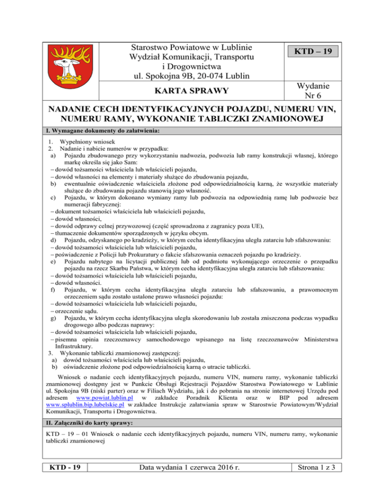 Starostwo Powiatowe w Lublinie Wydział Komunikacji, Transportu i Drogownictwa ul. Spokojna 9B, 20-074 Lublin KARTA SPRAWY KTD – 19 Wydanie Nr 6 NADANIE CECH IDENTYFIKACYJNYCH POJAZDU, NUMERU VIN, NUMERU RAMY, WYKONANIE TABLICZKI ZNAMIONOWEJ I. Wymagane dokumenty do załatwienia: 1. Wypełniony wniosek 2. Nadanie i nabicie numerów w przypadku: a) Pojazdu zbudowanego przy wykorzystaniu nadwozia, podwozia lub ramy konstrukcji własnej, którego markę określa się jako Sam: dowód tożsamości właściciela lub właścicieli pojazdu, dowód własności na elementy i materiały służące do zbudowania pojazdu, b) ewentualnie oświadczenie właściciela złożone pod odpowiedzialnością karną, że wszystkie materiały służące do zbudowania pojazdu stanowią jego własność. c) Pojazdu, w którym dokonano wymiany ramy lub podwozia na odpowiednią ramę lub podwozie bez numeracji fabrycznej: dokument tożsamości właściciela lub właścicieli pojazdu, dowód własności, dowód odprawy celnej przywozowej (część sprowadzona z zagranicy poza UE), tłumaczenie dokumentów sporządzonych w języku obcym. d) Pojazdu, odzyskanego po kradzieży, w którym cecha identyfikacyjna uległa zatarciu lub sfałszowaniu: dowód tożsamości właściciela lub właścicieli pojazdu, poświadczenie z Policji lub Prokuratury o fakcie sfałszowania oznaczeń pojazdu po kradzieży. e) Pojazdu nabytego na licytacji publicznej lub od podmiotu wykonującego orzeczenie o przepadku pojazdu na rzecz Skarbu Państwa, w którym cecha identyfikacyjna uległa zatarciu lub sfałszowaniu: dowód tożsamości właściciela lub właścicieli pojazdu, dowód własności. f) Pojazdu, w którym cecha identyfikacyjna uległa zatarciu lub sfałszowaniu, a prawomocnym orzeczeniem sądu zostało ustalone prawo własności pojazdu: dowód tożsamości właściciela lub właścicieli pojazdu, orzeczenie sądu. g) Pojazdu, w którym cecha identyfikacyjna uległa skorodowaniu lub została zniszczona podczas wypadku drogowego albo podczas naprawy: dowód tożsamości właściciela lub właścicieli pojazdu, pisemna opinia rzeczoznawcy samochodowego wpisanego na listę rzeczoznawców Ministerstwa Infrastruktury. 3. Wykonanie tabliczki znamionowej zastępczej: a) dowód tożsamości właściciela lub właścicieli pojazdu, b) oświadczenie złożone pod odpowiedzialnością karną o utracie tabliczki. Wniosek o nadanie cech identyfikacyjnych pojazdu, numeru VIN, numeru ramy, wykonanie tabliczki znamionowej dostępny jest w Punkcie Obsługi Rejestracji Pojazdów Starostwa Powiatowego w Lublinie ul. Spokojna 9B (niski parter) oraz w Filiach Wydziału, jak i do pobrania na stronie internetowej Urzędu pod adresem www.powiat.lublin.pl w zakładce Poradnik Klienta oraz w BIP pod adresem www.splublin.bip.lubelskie.pl w zakładce Instrukcje załatwiania spraw w Starostwie Powiatowym/Wydział Komunikacji, Transportu i Drogownictwa. II. Załączniki do karty sprawy: KTD – 19 – 01 Wniosek o nadanie cech identyfikacyjnych pojazdu, numeru VIN, numeru ramy, wykonanie tabliczki znamionowej KTD - 19 Data wydania 1 czerwca 2016 r. Strona 1 z 3 III. Dokumenty do wglądu: Dowód tożsamości właściciela przy złożeniu dokumentów. IV. Wymagane opłaty: 1. Opłata skarbowa - 10 zł – opłata skarbowa za wydanie decyzji o nadanie cech identyfikacyjnych pojazdu, numeru VIN, numeru ramy, wykonanie tabliczki znamionowej - 17 zł za pełnomocnictwo, bądź upoważnienie. Opłatę skarbową należy wnieść w momencie składania wniosku – zgodnie z art. 6 ustawy o opłacie skarbowej. Wpłaty z tytułu opłaty skarbowej można dokonywać: - przelewem na rachunek bankowy: BANK PEKAO S.A. 95 1240 2092 9329 9200 0620 0000, - gotówką w kasie tutejszego Starostwa (ul. Spokojna 9, parter głównego budynku Starostwa), Godziny otwarcia kasy: Poniedziałek, Środa, Czwartek, Piątek 745 – 1500 Wtorek 700 – 1700 - gotówką w kasie Wydziału Finansowego Urzędu Miasta Lublin: ul. Wieniawska 14 (I piętro) i ul. Leszczyńskiego 20 (I piętro) - poniedziałek, wtorek 730 - 1630; środa, czwartek, piątek 730 - 1430; ul. Filaretów 44 (parter) - poniedziałek, wtorek, środa, czwartek, piątek 7 30 - 1445; ul. Kleeberga 12a poniedziałek, wtorek, środa, czwartek, piątek 745 - 1445 W przypadku błędnie uiszczonej opłaty skarbowej można ubiegać się o jej zwrot, składając wniosek do organu podatkowego, do którego została wniesiona. V. Sposób i miejsce złożenia dokumentów: 1. Osobiście lub przez osobę posiadającą pełnomocnictwo: a) Wydział Komunikacji, Transportu i Drogownictwa Starostwa Powiatowego w Lublinie – niski parter, w godzinach: Poniedziałek, Środa, Czwartek, Piątek 745 – 1500 Wtorek 700 – 1700 b) Filia Wydziału z siedzibą w Bychawie dla mieszkańców gmin: Bychawa, Zakrzew, Wysokie, Krzczonów, Strzyżewice, Jabłonna; c) Filia Wydziału z siedzibą w Bełżycach dla mieszkańców gmin: Bełżyce, Wojciechów, Borzechów; d) Filia Wydziału z siedzibą w Niedrzwicy Dużej dla mieszkańców gminy Niedrzwica Duża; w godzinach: Poniedziałek, Wtorek, Środa, Czwartek, Piątek 745 – 1500 2. Elektronicznie za pośrednictwem elektronicznej skrzynki podawczej (wymagane jest posiadanie konta na epuap oraz profilu zaufanego lub kwalifikowanego podpisu elektronicznego). VI. Sposób i termin załatwienia sprawy: Wydanie decyzji administracyjnej niezwłocznie po złożeniu wymaganych dokumentów. VII. Wydział załatwiający sprawę: 1. Wydział Komunikacji, Transportu i Drogownictwa – Rejestracja Pojazdów (niski parter) ul. Spokojna 9B 20-074 Lublin tel. 81 52 86 700, 52 86 701 mail: [email protected] 2. Filia Wydziału Komunikacji, Transportu i Drogownictwa ul. Piłsudskiego 22 23-100 Bychawa tel. 81 566 21 71 mail: [email protected] 3. Filia Wydziału Komunikacji, Transportu i Drogownictwa ul. Fabryczna 2b KTD - 19 Data wydania 1 czerwca 2016 r. Strona 2 z 3 24-200 Bełżyce tel. 81 517 34 48 mail: [email protec