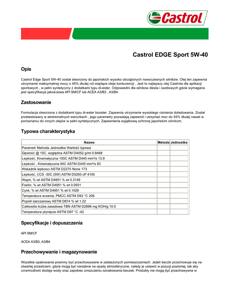 Castrol EDGE Sport 5W-40 Opis Castrol Edge Sport 5W-40 został stworzony do japońskich wysoko obciążonych nowoczesnych silników. Olej ten zapewnia utrzymanie maksymalnej mocy o 45% dłużej niż wiądące oleje konkurencji . Jest to najlepszy olej Castrola dla aplikacji sportowych , w pełni syntetyczny z dodatkami typu di-ester. Odpowiedni dla silnikow diesla i osobowych gdzie wymagana jest specyfikacja jakościowa API SM/CF lub ACEA A3/B3 , A3/B4. Zastosowanie Formulacja stworzona z dodatkami typu di-ester booster. Zapewnia utrzymanie wysokiego cisnienia doładowania. Został przetestowany w ekstremalnych warunkach , jego parametry pozwalają zapewnić i utrzymać moc do 45% dłużej nawet w porównaniu do innych olejów w pełni syntetycznych. Zapewnienia wyjątkową ochronę japońskim silnikom. Typowa charakterystyka Nazwa Metoda Jednostka Parametr Met\oda Jednostka Wartość typowa Gęstość @ 15C, względna ASTM D4052 g/ml 0.8468 Lepkość, Kinematyczna 100C ASTM D445 mm²/s 13.9 Lepkość , Kinematyczna 40C ASTM D445 mm²/s 83 Wskaźnik lepkosci ASTM D2270 None 173 Lepkość, CCS -30C (5W) ASTM D5293 cP 4100 Wapń, % wt ASTM D4951 % wt 0.3149 Fosfor, % wt ASTM D4951 % wt 0.0931 Cynk, % wt ASTM D4951 % wt 0.1029 Temperatura wrzenia, PMCC ASTM D93 °C 206 Popiół siarczanowy ASTM D874 % wt 1.22 Całkowita liczba zasadowa TBN ASTM D2896 mg KOH/g 10.5 Temperatura płynięcia ASTM D97 °C -42 Specyfikacje i dopuszczenia API SM/CF ACEA A3/B3, A3/B4 Przechowywanie i magazynowanie Wszelkie opakowania powinny być przechowywane w zadaszonych pomieszczeniach. Jeżeli beczki przechowuje się na otwartej przestrzeni, gdzie mogą być narażone na opady atmosferyczne, należy je ustawić w pozycji poziomej, tak aby uniemożliwić dostęp wody oraz zapobiec zniszczeniu oznakowania beczek. Produkty nie mogą być przechowywne w temperaturze wyższej niż 60°C, ani też narażone na działanie promieni słonecznych lub bardzo niskich temperatur.