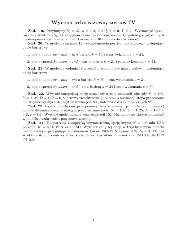 Wycena arbitrażowa, zestaw IV Zad. 19. Przyjmijmy S0 = 36, u = 1, 5, d = 23 , r = 0, T = 2. Wyznaczyć łączne rozkłady wektora (ST , τ ) względem prawdopodobieństwa martyngałowego, gdzie τ jest czasem pierwszego przejścia przez barierę k = 30 (drzewo dwuokresowe). Zad. 20. W modelu z zadania 19 wycenić metodą portfela replikującego następujące opcje barierowe: 1. opcja kupna up − and − in z barierą k = 54 i ceną wykonania e = 24, 2. opcja sprzedaży down − and − out z barierą k = 24 i ceną wykonania e = 54. Zad. 21. W modelu z zadania 19 wycenić metodą miary martyngałowej następujące opcje barierowe: 1. opcja kupna up − and − out z barierą k = 50 i ceną wykonania e = 24, 2. opcja sprzedaży down − and − in z barierą k = 24 i ceną wykonania e = 50. Zad. 22. Wycenić europejską opcję sprzedaży z ceną realizacji 120, gdy S0 = 100, U = 1, 25, D = 1/U = 0, 8, drzewo dwuokresowe (1 okres= 3 miesiace), stopa procentowa dla trzymiesięcznych depozytów równa jest 8%, natomiast dla 6-miesiecznych 9% Zad. 23. Rynek modelujemy przy pomocy dwuokresowego (jeden okres=3 miesiące) drzewa dwumianowego o następujących parametrach: S0 = 100, U = 1, 25, D = 1/U = 0, 8, r = 8%. Wycenić opcję kupna z ceną realizacji 102. Następnie zwiększyć zmienność w modelu dwukrotnie i powtórzyć wycenę. Zad. 24. Rozpatrzmy europejską trzymiesięczną opcję kupna N = 100 mln USD po cenie K = 4, 20 PLN za 1 USD. Wyznacz cenę tej opcji w trzyokresowym modelu dwumianowym przyjmując, że zmienność kursu USD/PLN wynosi 20%, S0 = 4 : 00, zaś struktura stóp procentowych jest stała dla każdego okresu i wynosi dla USD 3%, dla PLN 6% (pa). 1