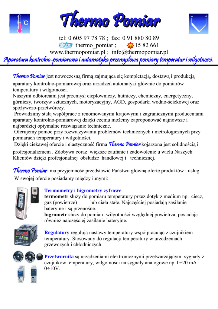 Thermo Pomiar tel: 0 605 97 78 78 ; fax: 0 91 880 80 89 thermo_pomiar ; 15 82 661 www.thermopomiar.pl ; [email protected] Aparatura kontrolno-pomiarowa i autamatyka przemyslowa pomiary temperatur i wilgotnosci. Thermo Pomiar jest nowoczesną firmą zajmująca się kompletacją, dostawą i produkcją aparatury kontrolno-pomiarowej oraz urządzeń automatyki głównie do pomiarów temperatury i wilgotności. Naszymi odbiorcami jest przemysł ciepłowniczy, hutniczy, chemiczny, energetyczny, górniczy, tworzyw sztucznych, motoryzacyjny, AGD, gospodarki wodno-ściekowej oraz spożywczo-przetwórczy. Prowadzimy stałą współprace z renomowanymi krajowymi i zagranicznymi producentami aparatury kontrolno-pomiarowej dzięki czemu możemy zaproponować najnowsze i najbardziej optymalne rozwiązanie techniczne. Oferujemy pomoc przy rozwiązywaniu problemów technicznych i metrologicznych przy pomiarach temperatury i wilgotności. Dzięki ciekawej ofercie i elastyczność firma Thermo Pomiar kojarzona jest solidnością i profesjonalizmem . Zdobywa coraz większe zaufanie i zadowolenie u wielu Naszych Klientów dzięki profesjonalnej obsłudze handlowej i technicznej. Thermo Pomiar ma przyjemność przedstawić Państwu główną ofertę produktów i usług. W swojej ofercie posiadamy między innymi: Termometry i higrometry cyfrowe termometr służy do pomiaru temperatury przez dotyk z medium np. ciecz, gaz (powietrze) lub ciała stałe. Najczęściej posiadają zasilanie bateryjne i są przenośne. higrometr służy do pomiaru wilgotności względnej powietrza, posiadają również najczęściej zasilanie bateryjne. Regulatory regulują nastawy temperatury współpracując z czujnikiem temperatury. Stosowany do regulacji temperatury w urządzeniach grzewczych i chłodniczych. Przetworniki są urządzeniami elektronicznymi przetwarzającymi sygnały z czujników temperatury, wilgotności na sygnały analogowe np. 0÷20 mA. 0÷10V. • Pirometry służą do szybkiego i bezdotykowego pomiaru temperatury za pomocą techniki podczerwieni. Stosowany do szybkiego pomiaru temperatury w trudno dostępnych i niebezpiecznych miejscach np. obiektach w ruchu, pod napięciem, agresywnych chemicznie Rejestratory służą do precyzyjnego pomiaru wraz z rejestracją i archiwizacją danych w czasie rzeczywistym np. temperatury, wilgotności, sygnałów analogowych np. 0÷20 mA. 0÷10V. Rozróżniamy dwa typy rejestracji: papierowa dane zapisywane pisakiem na taśmie papierowej, cyfrowe elektroniczne które wartości pomiaru zapisują w pamięci procesora i następnie w dowolnym czasie można je wydrukować. Kalibratory są przyrządami do wzorcowania (kontroli)sygnałów z czujników temperatury oraz sygnałów analogowych np. 0÷20 mA. 0÷10V. Kamery termowizyjne dokonują pomiaru temperatury bezdotykowo z rozkładem temperatur na widzianym obrazie na zasadzie przetwarzania promieniowanie podczerwonego przez obserwowany obiekt na kamerze termowizyjnej obrazując rozkład temperatur na obrazie. Przekaźniki półprzewodnikowe SSR elektroniczny przekaźnik bez kontaktowy, zwiększa bezawaryjność, częstotliwość łączeń, cicha praca. Rezystory termometryczne stosowane jako sensor do pomiaru temperatury np. Pt100 określa 100 Ω w temperaturze 0°C Złącza skompensowane gniazdo i wtyczka stosowana do łączenia przewodów termoparowych i kompensacyjnych. Usługi wzorcowanie, kalibracja, naprawa, konserwacja profesjonalnej aparatury kontrolmo-pomiarowej, oraz kompleksowy serwis gwarancyjny i pogwarancyjny. Proponujemy atrakcyjne ceny. Prowadzimy sprzedaż wysyłkową. Zapraszamy Państwa do współpracy !!!