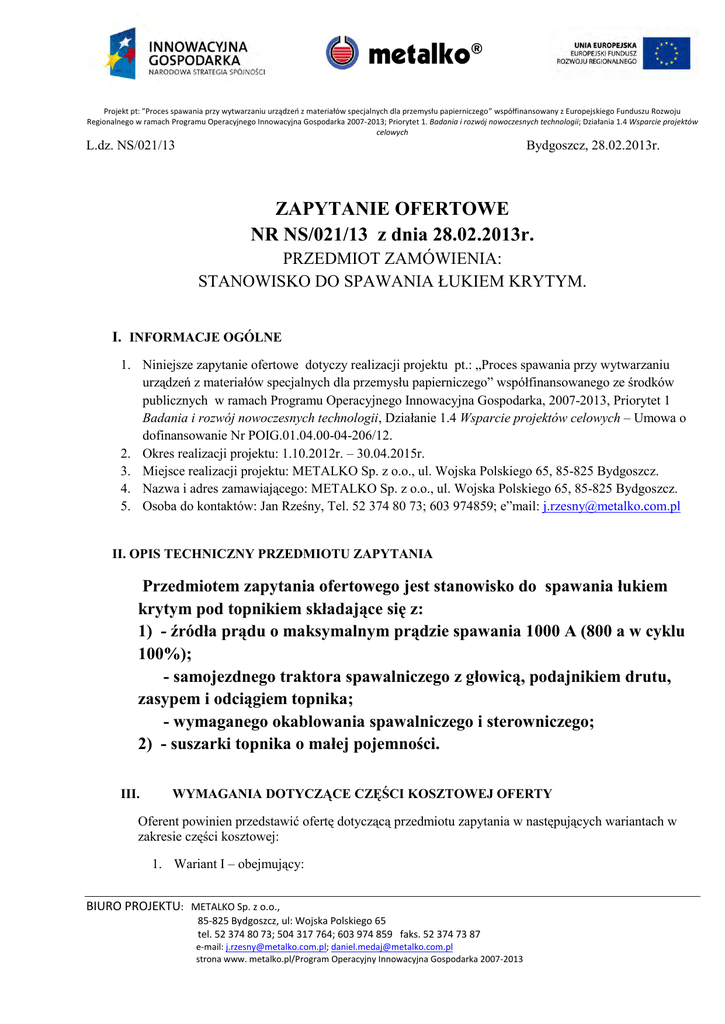 metalko® Projekt pt: ”Proces spawania przy wytwarzaniu urządzeń z materiałów specjalnych dla przemysłu papierniczego” współfinansowany z Europejskiego Funduszu Rozwoju Regionalnego w ramach Programu Operacyjnego Innowacyjna Gospodarka 2007-2013; Priorytet 1. Badania i rozwój nowoczesnych technologii; Działania 1.4 Wsparcie projektów celowych L.dz. NS/021/13 Bydgoszcz, 28.02.2013r. ZAPYTANIE OFERTOWE NR NS/021/13 z dnia 28.02.2013r. PRZEDMIOT ZAMÓWIENIA: STANOWISKO DO SPAWANIA ŁUKIEM KRYTYM. I. INFORMACJE OGÓLNE 1. Niniejsze zapytanie ofertowe dotyczy realizacji projektu pt.: „Proces spawania przy wytwarzaniu urządzeń z materiałów specjalnych dla przemysłu papierniczego” współfinansowanego ze środków publicznych w ramach Programu Operacyjnego Innowacyjna Gospodarka, 2007-2013, Priorytet 1 Badania i rozwój nowoczesnych technologii, Działanie 1.4 Wsparcie projektów celowych – Umowa o dofinansowanie Nr POIG.01.04.00-04-206/12. 2. Okres realizacji projektu: 1.10.2012r. – 30.04.2015r. 3. Miejsce realizacji projektu: METALKO Sp. z o.o., ul. Wojska Polskiego 65, 85-825 Bydgoszcz. 4. Nazwa i adres zamawiającego: METALKO Sp. z o.o., ul. Wojska Polskiego 65, 85-825 Bydgoszcz. 5. Osoba do kontaktów: Jan Rześny, Tel. 52 374 80 73; 603 974859; e”mail: [email protected] II. OPIS TECHNICZNY PRZEDMIOTU ZAPYTANIA Przedmiotem zapytania ofertowego jest stanowisko do spawania łukiem krytym pod topnikiem składające się z: 1) - źródła prądu o maksymalnym prądzie spawania 1000 A (800 a w cyklu 100%); - samojezdnego traktora spawalniczego z głowicą, podajnikiem drutu, zasypem i odciągiem topnika; - wymaganego okablowania spawalniczego i sterowniczego; 2) - suszarki topnika o małej pojemności. III. WYMAGANIA DOTYCZĄCE CZĘŚCI KOSZTOWEJ OFERTY Oferent powinien przedstawić ofertę dotyczącą przedmiotu zapytania w następujących wariantach w zakresie części kosztowej: 1. Wariant I – obejmujący: BIURO PROJEKTU: METALKO Sp. z o.o., 85-825 Bydgoszcz, ul: Wojska Polskiego 65 tel. 52 374 80 73; 504 317 764; 603 974 859 faks. 52 374 73 87 e-mail: [email protected]; [email protected] strona www. metalko.pl/Program Operacyjny Innowacyjna Gospodarka 2007-2013 metalko® Projekt pt: ”Proces spawania przy wytwarzaniu urządzeń z materiałów specjalnych dla przemysłu papierniczego” współfinansowany z Europejskiego Funduszu Rozwoju Regionalnego w ramach Programu Operacyjnego Innowacyjna Gospodarka 2007-2013; Priorytet 1. Badania i rozwój nowoczesnych technologii; Działania 1.4 Wsparcie projektów celowych - Koszt wynajmu stanowiska opisanego w punkcie II w okresie od 1.04.2013 do 30.11.2013 oraz od 1.11.2014 do 31.01.2015 (łącznie 11 miesięcy); - Koszt zakupu wynajmowanego urządzenia po okresie wynajmu. 2. Wariant II – obejmujący: - Koszt zakupu stanowiska opisanego w punkcie II. W każdym z przedstawionych wariantów, oferta w części kosztowej powinna uwzględniać i mieć wyspecyfikowane wszystkie koszty towarzyszące, takie jak: koszt dostawy urządzenia, koszt opłat serwisowych, koszt szkolenia obsługi, koszt części szybkozużywających się niezbędnych w okresie wynajmu stanowiska. IV. TERMIN WYKONANIA ZAMÓWIENIA Dla wariantu I - Przedmiot zamówienia powinien być zrealizowany w terminie zgodnie z podanym w punkcie III okresem wynajmu. Dla wariantu II – wymagany termin dostawy przedmiotu zamówienia – 30.03.2013r. V. OFERTY CZĘŚCIOWE Przedmiot zamówienia stanowi dla Zamawiającego jedną całość i nie dopuszcza składania ofert obejmujących część dostawy. VI. OPIS PRZYGOTOWANIA OFERTY Złożona oferta powinna zawierać następujące elementy: 1. 2. 3. 4. Nr i datę zapytania ofertowego w odpowiedzi na które składana jest oferta. Nazwę oferenta, dane kontaktowe oraz siedzibę oferenta. Specyfikację oferowanego stanowiska z pełną charakterystyką techniczną. Cenę jednostkową oferowanego stanowiska (netto oraz brutto) w odniesieniu do wariantów opisanych w punkcie III zapytania ofertowego wraz z kosztami towarzyszącymi, o których mowa w punkcie III zapytania. 5. Warunki gwarancji. 6. Warunki płatności. 7. Termin dostawy stanowiska w odniesieniu do wymagań opisanych w punkcie IV zapytania ofertowego. 8. Termin ważności oferty. 9. Oświadczenie, że podane ceny nie ulegną zmianie. 10. Podpisane Oświadczenie Oferenta stanowiące załącznik do niniejszego zapytania. VII. MIEJSCE I TERMIN SKŁADANIA OFERT 1. Ofertę należy składać nie później niż do dnia 14.03.2013r. do godziny 15-tej, w wersji papierowej na adres Biura Projektu: METALKO Sp. z o.o. Ul. Wojska Polskiego 65 85-825 Bydgoszcz BIURO PROJEKTU: METALKO Sp. z o.o., 85-825 Bydgoszcz, ul: Wojska Polskiego 65 tel. 52 374 80 73; 504 317 764; 603 974 859 faks. 52 374 73 87 e-mail: [email protected]; [email protected] strona www. metalko.pl/Program Operacyjny Innowacyjna Gospodarka 2007-2013 metalko® Projekt pt: ”Proces spawania przy wytwarzaniu urządzeń z materiałów specjalnych dla przemysłu papierniczego” współfinansowany z Europejskiego Funduszu Rozwoju Regionalnego w ramach Programu Operacyjnego Innowacyjna Gospodarka 2007-2013; Priorytet 1. Badania i rozwój nowoczesnych technologii; Działania 1.4 Wsparcie projektów celowych 2. O ważności składanej oferty decyduje data i godzina wpływu oferty do Biura Projektu. 3. Oferta powinna być opatrzona pieczęcią Oferenta, podpisem oraz zaparafowana na każdej stronie. VIII. WARUNKI UDZIAŁU W POSTĘPOWANIU O udzielenie zamówienia mogą ubiegać się Oferenci, którzy spełniają następujące warunki: 1. Posiadają uprawnienia do wykonywania określonej działalności lub czynności, jeśli przepisy prawne nakładają obowiązek posiadania takich uprawnień. 2. Posiadają niezbędną wiedzę doświadczenie oraz dysponują potencjałem technicznym i osobowym niezbędnym do wykonania usługi zgodnie z zamówieniem. 3. Nie otwarto wobec nich postępowania likwidacyjnego ani upadłośc