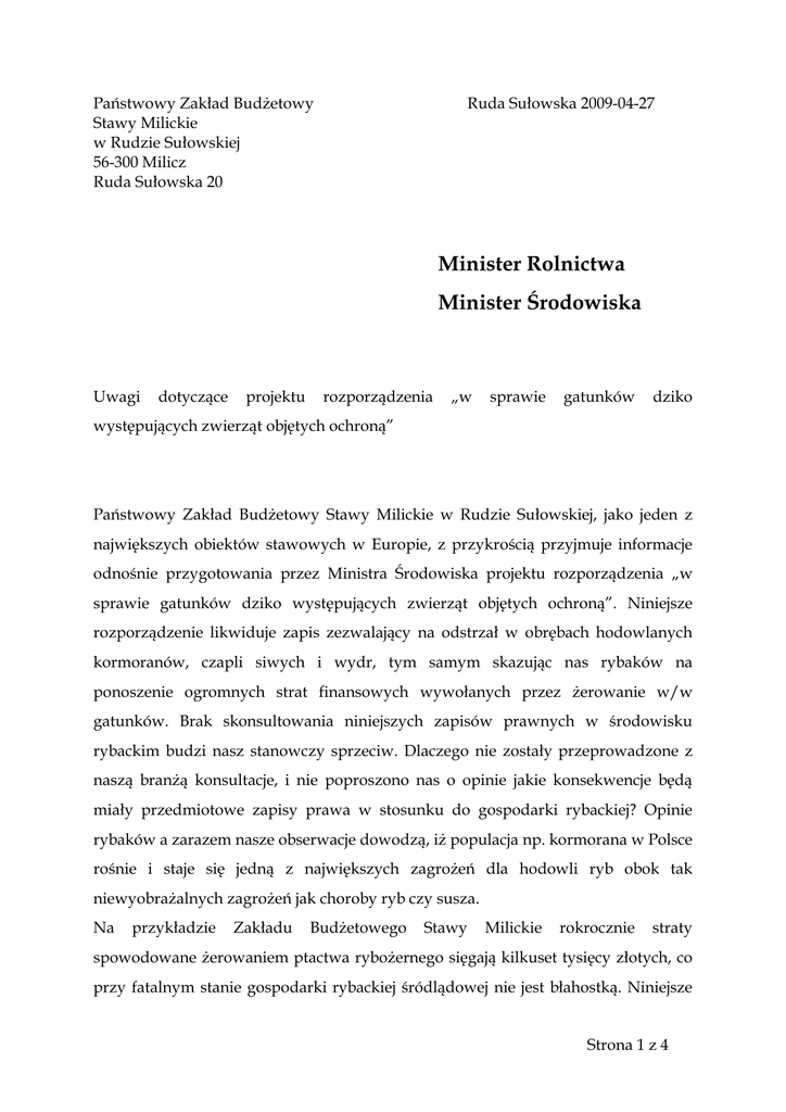 Państwowy Zakład BudŜetowy Stawy Milickie w Rudzie Sułowskiej 56-300 Milicz Ruda Sułowska 20 Ruda Sułowska 2009-04-27 Minister Rolnictwa Minister Środowiska Uwagi dotyczące projektu rozporządzenia „w sprawie gatunków dziko występujących zwierząt objętych ochroną” Państwowy Zakład BudŜetowy Stawy Milickie w Rudzie Sułowskiej, jako jeden z największych obiektów stawowych w Europie, z przykrością przyjmuje informacje odnośnie przygotowania przez Ministra Środowiska projektu rozporządzenia „w sprawie gatunków dziko występujących zwierząt objętych ochroną”. Niniejsze rozporządzenie likwiduje zapis zezwalający na odstrzał w obrębach hodowlanych kormoranów, czapli siwych i wydr, tym samym skazując nas rybaków na ponoszenie ogromnych strat finansowych wywołanych przez Ŝerowanie w/w gatunków. Brak skonsultowania niniejszych zapisów prawnych w środowisku rybackim budzi nasz stanowczy sprzeciw. Dlaczego nie zostały przeprowadzone z naszą branŜą konsultacje, i nie poproszono nas o opinie jakie konsekwencje będą miały przedmiotowe zapisy prawa w stosunku do gospodarki rybackiej? Opinie rybaków a zarazem nasze obserwacje dowodzą, iŜ populacja np. kormorana w Polsce rośnie i staje się jedną z największych zagroŜeń dla hodowli ryb obok tak niewyobraŜalnych zagroŜeń jak choroby ryb czy susza. Na przykładzie Zakładu BudŜetowego Stawy Milickie rokrocznie straty spowodowane Ŝerowaniem ptactwa ryboŜernego sięgają kilkuset tysięcy złotych, co przy fatalnym stanie gospodarki rybackiej śródlądowej nie jest błahostką. Niniejsze Strona 1 z 4 dane empiryczne nie są wyłącznie opiniami wewnętrznymi lecz są równieŜ potwierdzone przez naukowców-przyrodników. Na dowód swych spostrzeŜeń przytoczyć moŜemy opracowanie dokonane przez niezaleŜnych naukowcówornitologów pracowników naukowych Uniwersytetu Wrocławskiego: dr hab., prof. U.Wr. Józefa Witkowskiego oraz mgr Beaty Orłowskiej: … ” Oznacza to, iŜ stawy milickie są siedliskiem lęgowym dla około 20 000 par ptaków reprezentujących ponad 160 gatunków. Spośród nich po kilkanaście naleŜy do ryboŜernych i podjadających pasze zboŜowe przeznaczone dla ryb. W okresie dyspersji polęgowej i migracji pojawia się tu znacznie więcej ptaków, a liczba osobników ryboŜernych i zjadających pasze wynosi przeciętnie niespełna 40 000, czasami dochodząc do 70 000. Nie ulega zatem wątpliwości, iŜ ptaki te przynoszą straty w gospodarce rybackiej. Są one tym dotkliwsze, Ŝe przeciwdziałanie im jest utrudnione, a czasem wręcz niemoŜliwe, ze względu na wspomniany wyŜej status ochronny stawów. Celem niniejszej ekspertyzy jest próba oszacowania rozmiaru tych strat. (…)Na stawach Gospodarstwa BudŜetowego „Stawy Milickie” stwierdzono 18 gatunków ptaków Ŝywiących się rybami (pominięto gatunki pojawiające się sporadycznie i w liczbie do kilku osobników). (…) Istotne straty powodują zatem cztery gatunki: kormoran, czapla siwa, czapla biała i nurogęś. Kormoran i czapla siwa gniazdują na stawach milickich. (…) Straty spowodowane przez kormorana Phalacrocorax carbo (…) W oparciu o (…) dane i zastrzeŜenia wyliczono liczbę Ŝerujących na stawach milickich kormoranów, reprezentatywną dla roku 2006 i lat późniejszych, która wyniosła 74 213 osobniko/dni. (…) Wszelkie stwierdzenia wskazują, iŜ kormoran jest niemal wyłącznie ichtiofagiem i to łowiącym ryby Ŝywe. Dane dotyczące jego dobowego zapotrzebowania pokarmowego (…) mieszczą się w granicach 0,34-0,80 kg, chociaŜ najwięcej oscyluje między wartościami 0,4-0,55 kg. W związku z tym do dalszych obliczeń przyjęto 0,45 kg, pomimo Ŝe najlepiej dotąd udokumentowane badania (Keller i Visser 1999) podają 0,539 kg. Z pomnoŜenia liczby osobniko/dni (74 213) przez dobowe zapotrzebowanie pokarmowe (0,425 kg) otrzymujemy wartość 31 540 kg ryb, które zjadają kormorany na stawach milickich w ciągu całego roku. Z badań SierŜanta (2005) nad zawartością treści pokarmowej odstrzeliwanych tutaj kormoranów wynika, Ŝe 90% ich zdobyczy stanowi karp o masie 0,20,3 kg. Pozostałe 10% to dzikie gatunki ryb, głównie płoć, wzdręga, okoń i karaś. Uwzględniając to w ostatecznym rozliczeniu rocznych strat od kormorana naleŜy zatem przyjąć, iŜ wynoszą one: 28 386 kg narybku i kroczka karpia 354 kg dzikich gatunków ryb. (…) Straty spowodowane przez czaple siwe Ardea cinerea (…) Obserwacje miejsc Ŝerowania czapli (rowy, inne cieki, łowiska i zagłębienia w odłowionych juŜ stawach, rozmarzliny) w okresie grudzień-luty pozwalają przyjąć, Ŝe straty dla Gospodarstwa są wtedy minimalne lub Ŝadne, stąd pominięto ten okres przy całkowitym ich obliczaniu. Po uwzględnieniu powyŜszego średnia liczba dla czapli siwej wynosi 229 530 osobniko/dni. Strona 2 z 4 (…) Po uwzględnieniu innego niŜ ryby pokarmu, śniętych ryb, oraz dzikich gatunków ryb o zbyt małej masie Ŝeby je moŜna było sprzedać przyjęto, Ŝe przeciętna milicka czapla zjada na dobę 0,15 kg ryb w klasie handlowej. MnoŜąc 229 530 osobniko/dni przez 0,15 kg ryb otrzymujemy stratę 34 430 kg ryby handlowej w ciągu całego roku. Z masy tej, co najmniej 85% przypada na duŜy narybek i kroczek karpia. 15% stanowią dzikie ryby, takie jak w przypadku kormorana. Biorąc to pod uwagę w konkluzji naleŜy stwierdzić iŜ czaple siwe zjadają na stawach milickich w ciągu roku: 29 265 kg karpia w klasie narybek i kroczek 5 165 kg dzikiej ryby klasy handlowej. (…) Podsumowanie strat spowodowanych przez ptaki w Gospodarstwie BudŜetowym Stawy Milickie” w 2008 roku Straty w rybach Gatunek ptaka Kormoran Czapla siwa Czapla biała Nurogęś RAZEM Narybek i kroczek karpia Dzikie ryby (kg) (kg) 28 386 3 154 29 265 5 165 6 729 1 187 18 351 82 731 9 506 Straty spowodowane wyłącznie przez kormorana i czaplę (na podstawie danych J. Witkowskiego i B. Orłowskiej) Rodzaj strat karp - narybe