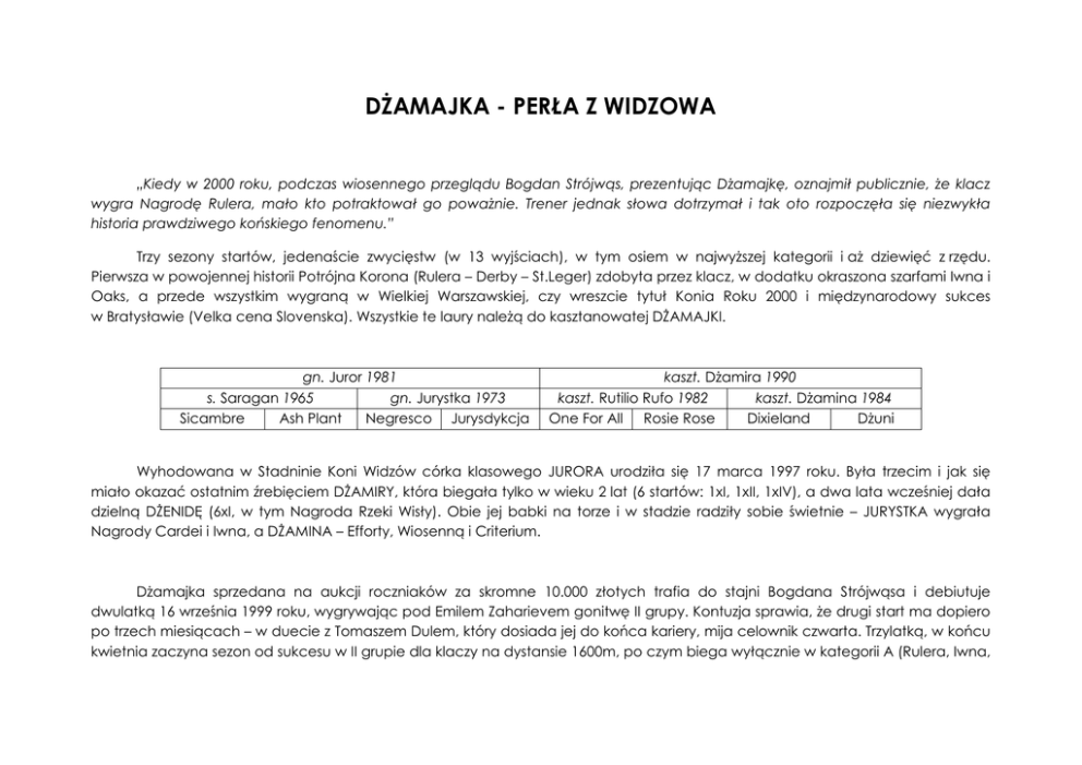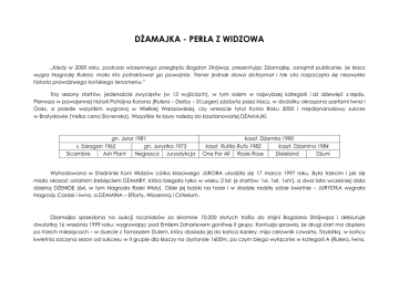 DŻAMAJKA - PERŁA Z WIDZOWA „Kiedy w 2000 roku, podczas wiosennego przeglądu Bogdan Strójwąs, prezentując Dżamajkę, oznajmił publicznie, że klacz wygra Nagrodę Rulera, mało kto potraktował go poważnie. Trener jednak słowa dotrzymał i tak oto rozpoczęła się niezwykła historia prawdziwego końskiego fenomenu.” Trzy sezony startów, jedenaście zwycięstw (w 13 wyjściach), w tym osiem w najwyższej kategorii i aż dziewięć z rzędu. Pierwsza w powojennej historii Potrójna Korona (Rulera – Derby – St.Leger) zdobyta przez klacz, w dodatku okraszona szarfami Iwna i Oaks, a przede wszystkim wygraną w Wielkiej Warszawskiej, czy wreszcie tytuł Konia Roku 2000 i międzynarodowy sukces w Bratysławie (Velka cena Slovenska). Wszystkie te laury należą do kasztanowatej DŻAMAJKI. gn. Juror 1981 s. Saragan 1965 gn. Jurystka 1973 Sicambre Ash Plant Negresco Jurysdykcja kaszt. Dżamira 1990 kaszt. Rutilio Rufo 1982 kaszt. Dżamina 1984 One For All Rosie Rose Dixieland Dżuni Wyhodowana w Stadninie Koni Widzów córka klasowego JURORA urodziła się 17 marca 1997 roku. Była trzecim i jak się miało okazać ostatnim źrebięciem DŻAMIRY, która biegała tylko w wieku 2 lat (6 startów: 1xI, 1xII, 1xIV), a dwa lata wcześniej dała dzielną DŻENIDĘ (6xI, w tym Nagroda Rzeki Wisły). Obie jej babki na torze i w stadzie radziły sobie świetnie – JURYSTKA wygrała Nagrody Cardei i Iwna, a DŻAMINA – Efforty, Wiosenną i Criterium. Dżamajka sprzedana na aukcji roczniaków za skromne 10.000 złotych trafia do stajni Bogdana Strójwąsa i debiutuje dwulatką 16 września 1999 roku, wygrywając pod Emilem Zaharievem gonitwę II grupy. Kontuzja sprawia, że drugi start ma dopiero po trzech miesiącach – w duecie z Tomaszem Dulem, który dosiada jej do końca kariery, mija celownik czwarta. Trzylatką, w końcu kwietnia zaczyna sezon od sukcesu w II grupie dla klaczy na dystansie 1600m, po czym biega wyłącznie w kategorii A (Rulera, Iwna, Derby, Oaks, St.Leger, Wielka Warszawska). W rekordowym 20-konnym polu Derby rusza w dystans z 19 boksu, a mimo to wychodzi na finiszową prostą przy barierze i deklasuje rywali. W Wielkiej Warszawskiej powtarza wyczyn innego wychowanka SK Widzów – Dipola, zostając drugim w służewieckiej historii trójkoronowanym trzylatkiem, który swój prymat potrafi przypieczętować zwycięstwem w tym najcenniejszym z porównawczych sprawdzianów. Klacz pozostaje w treningu na następny rok, a jej zwycięska passa trwa (Golejewka, Velka cena Slovenska) aż do wyjazdu do Hamburga, gdzie w Idee Hansa-Preis G2 (2200m) nie odgrywa roli, wzbudzając jednak zainteresowanie niemieckich fachowców. Wygraną w Nagrodzie Kozienic ta wyjątkowa klacz żegna się z warszawską publicznością. DŻAMAJKA po torowej karierze wróciła do macierzystej stadniny, gdzie rok w rok rodzi źrebię. Pierwsza czwórka to przychówek maści kasztanowatej: urodzona w 2003 roku Dżordżia (po Sorbie Tower) – 2-3 let. 10 startów: 1xI, 1xII, 2xIII, 2xIV; rok młodszy Di-Dżej (Belenus), który nie wyszedł do startu; olbrzymi Dżiakomo (Zafonium) – 2-4 let. 5 st.: 3xI, 1xII, 1xIV, który zademonstrował spore możliwości, ale kłopoty zdrowotne stanęły na drodze do większych sukcesów; oraz pobudliwa Dżenifer (Zafonium) – 2-let. 3 st.: 1xI (Próbna), 1xIII (Skarba), którą po roku przerwy mamy okazję znów zobaczyć w akcji. Trzy najmłodsze źrebięta Dżamajki to: siwa Dżezabel (Tioman Island) 2007, która nie biegała, gniada Dżulietta (Roulette) – interesująca dwulatka ze stajni Macieja Jodłowskiego (trener ten przygotowuje także wciąż niespełnionego Dżiakomo) oraz roczny Dżordano (Roulette), który maść odziedziczył po swojej wspaniałej matce. A Nagroda Dżamajki to wyścig z krótką historią. Podobnie jak przed laty Nagrody Miry czy Dziwożony II pełni on rolę gonitwy przygotowawczej do rozgrywanej w maju Wiosennej – klasycznej milerskiej próby dla trzyletnich klaczy. Zwyciężczynie Nagrody Dżamajki (3-letnie klacze II grupy, 1600m) rok zwycięzca ojciec matka ojciec matki hodowca waga biegało koni trener jeździec czas tor 2007 DRAHMA FAIR N LOVELY (IRE) Ray of Light Druzga Omen SK Jaroszówka 59 7 M.Romanowski dż.A.Sanna 1'39.9" lekki (2,3) Domedriver Fieldfare Selkirk A.V.Bloodstock 59 6 A.Wyrzyk dż.P.Krowicki 1'39.3" lekki (2,5) 2009
