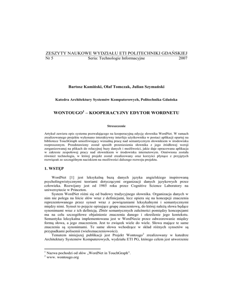 ZESZYTY NAUKOWE WYDZIAŁU ETI POLITECHNIKI GDAŃSKIEJ Nr 5 Seria: Technologie Informacyjne 2007 Bartosz Kamiński, Olaf Tomczak, Julian Szymański Katedra Architektury Systemów Komputerowych, Politechnika Gdańska WONTOUGO1 – KOOPERACYJNY EDYTOR WORDNETU Streszczenie Artykuł zawiera opis systemu pozwalającego na kooperacyjną edycję słownika WordNet. W ramach zrealizowanego projektu wykonano interaktywny interfejs użytkownika w postaci aplikacji opartej na bibliotece TouchGraph umożliwiający wizualną pracę nad semantycznym słownikiem w środowisku rozproszonym. Przedstawiony został sposób przeniesienia słownika z jego źródłowej wersji zorganizowanej na plikach do relacyjnej bazy danych i możliwości, jakie daje opracowana aplikacja w zakresie zespołowej pracy nad słownikiem w środowisku internetowym. Omówiona została również technologia, w której projekt został zrealizowany oraz korzyści płynące z przyjętych rozwiązań ze szczególnym naciskiem na możliwości dalszego rozwoju projektu. 1. WSTĘP WordNet [1] jest leksykalną bazą danych języka angielskiego inspirowaną psycholingwistycznymi teoriami dotyczącymi organizacji danych językowych przez człowieka. Rozwijany jest od 1985 roku przez Cognitive Science Laboratory na uniwersytecie w Princeton. System WordNet różni się od budowy tradycyjnego słownika. Organizacja danych w nim nie polega na liście słów wraz z definicjami, lecz opiera się na koncepcji znaczenia reprezentowanego przez synset wraz z powiązaniami leksykalnymi i semantycznymi między nimi. Synset to pojęcie opisujące grupę znaczeniową, do której należą słowa będące synonimami wraz z ich definicją. Zbiór semantycznych zależności pomiędzy koncepcjami ma na celu szczegółowe objaśnienie znaczenia danego i określenie jego kontekstu. Semantyka leksykalna implementowana jest w WordNecie przez odwzorowanie między formą słowa, a jego znaczeniem. Jest to związek wiele do wiele. Słowa mające te same znaczenia są synonimami. Te same słowa wchodzące w skład różnych synsetów są przypadkami polisemii (wieloznaczeniowości). Tematem niniejszej publikacji jest Projekt Wontougo2 zrealizowany w katedrze Architektury Systemów Komputerowych, wydziału ETI PG, którego celem jest utworzenie 1 2 Nazwa pochodzi od słów „WordNet in TouchGraph”. www. wontougo.org 2 Bartosz Kamiński, Olaf Tomczak, Julian Szymański kooperacyjnego edytora dla sytemu WordNet z wykorzystaniem bibliotek pozwalających na wizualizować grafy w interakcji z użytkownikiem - TouchGraph [2]. 2. CELE PROJEKTU Wontougo jest aplikacją, której celem jest umożliwienie przeglądania i kooperacyjnej edycji słownika WordNetu przy pomocy graficznego interfejsu. Realizacji projektu przyświecały następujące cele: 1. zaprojektowanie obiektowego modelu danych opartego na bazie danych systemu WordNet oraz metod utrwalania i przechowywania obiektów modelu. 2. zaprojektowanie kontenera do składowania kontekstowych danych i opracowanie warstwy logiki biznesowej umożliwiającej odczyt danych z bazy WordNet i ich konwersję na obiekty modelu, 3. opracowanie graficznego interfejsu użytkownika, umożliwiającego przejrzystą prezentację danych i dokonywanie operacji związanych z edycją słownika, 4. zaadaptowanie aplikacji do warunków i ograniczeń środowiska rozproszonego. 3. ARCHITEKTURA SYSTEMU System Wontougo został napisany w języku Java. Architekturę oparto o technologię Java Enterprise Edition w wersji 5.0[3]. Projekt modelu dziedziny (domain model) został zaimplementowany w postaci komponentów encyjnych Enterprise Java Beans w wersji 3.0. Obiekty modelu, są w wyniku mapowania obiektowo-relacyjnego zamieniane na krotki relacyjnej bazy danych SQL, którymi zarządzać może dowolny system zarządzania bazą danych. Istniejąca implementacja oparta została o bazę danych MySQL. Cała logika związana z operacjami odczytu i zapisu obiektów dziedziny znajduje się w pojedynczym komponencie sesyjnym EJB. Komponent ten udostępnia dwa interfejsy: lokalny oraz zdalny, które mogą być wykorzystywane przez inne systemy. Stworzony graficzny interfejs użytkownika jest przykładem wykorzystania takiego zewnętrznego systemu – niezależnej aplikacji operującej poprzez udostępniony interfejs na modelu dziedziny dołączonym do systemu w formie biblioteki. Wykorzystana technologia pozwoliła na implementację modelu dziedziny w postaci „lekkich” komponentów POJO (plain old java objects). Dodatkowo, cała logika związana z „utrwalaniem” obiektów modelu (persistence) i zarządzaniem transakcjami (transaction management) obsługiwana jest przez kontener, wewnątrz którego uruchamiana jest aplikacja. W przypadku tym może być to dowolny serwer aplikacji zgodny ze standardem JEEE 5.0. Dzięki takiemu podejściu system posiada zwartą i modyfikowalną architekturę. 3.1 Model dziedziny System WordNet w swojej źródłowej wersji oparty jest na plikach tekstowych. W formie tej nie nadaje się on do kooperacyjnej pracy, dlatego konieczna była jego konwersja na model obiektowy, a następnie wykonany został jego eksport do relacyjnej bazy danych. Przeprowadzona konwersja odbyła się w dwóch etapach: 1. odczytaniu wszystkich krotek z plików tekstowych i stworzeniu na ich podstawie odpowiednich obiektów modelu dziedziny zaprojektowanego dla systemu Wontougo, (rys. 1) Wontougo – kooperacyjny edytor WordNetu 2. 3 wyeksportowaniu utworzonego w ten sposób modelu do schematu SQL, który następnie zapisany został do relacyjnej bazy danych. (rys. 2) Rys.1. Model obiektowy struktury WordNetu. Model dziedziny systemu Wontougo zawężony został do podstawowych powiązań odzwierciedlających strukturę bazy WordNet. Składają się na niego cztery podstawowe encje: 1. 2. 3. 4. Synset – znaczenie (zbiór wyrazów bliskoznacznych opisujących pewną koncepcję), Sense – sens (powiązanie między konkretnym wyrazem a jego znacze