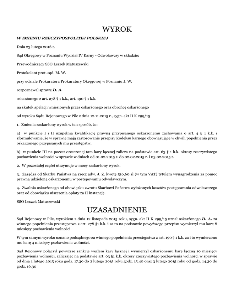 WYROK W IMIENIU RZECZYPOSPOLITEJ POLSKIEJ Dnia 23 lutego 2016 r. Sąd Okręgowy w Poznaniu Wydział IV Karny - Odwoławczy w składzie: Przewodniczący SSO Leszek Matuszewski Protokolant prot. sąd. M. W. przy udziale Prokuratora Prokuratury Okręgowej w Poznaniu J. W. rozpoznawał sprawę D. A. oskarżonego z art. 278 § 1 k.k., art. 190 § 1 k.k. na skutek apelacji wniesionych przez oskarżonego oraz obrońcę oskarżonego od wyroku Sądu Rejonowego w Pile z dnia 12.11.2015 r., sygn. akt II K 299/15 1. Zmienia zaskarżony wyrok w ten sposób, że: a) w punkcie I i II uzupełnia kwalifikację prawną przypisanego oskarżonemu zachowania o art. 4 § 1 k.k. i sformułowanie, że w sprawie mają zastosowanie przepisy Kodeksu karnego obowiązujące w chwili popełnienia przez oskarżonego przypisanych mu przestępstw, b) w punkcie III na poczet orzeczonej tam kary łącznej zalicza na podstawie art. 63 § 1 k.k. okresy rzeczywistego pozbawienia wolności w sprawie w dniach od 01.02.2015 r. do 02.02.2015 r. i 03.02.2015 r. 2. W pozostałej części utrzymuje w mocy zaskarżony wyrok. 3. Zasądza od Skarbu Państwa na rzecz adw. J. Z. kwotę 516,60 zł (w tym VAT) tytułem wynagrodzenia za pomoc prawną udzieloną oskarżonemu w postępowaniu odwoławczym. 4. Zwalnia oskarżonego od obowiązku zwrotu Skarbowi Państwa wyłożonych kosztów postępowania odwoławczego oraz od obowiązku uiszczenia opłaty za II instancję. SSO Leszek Matuszewski UZASADNIENIE Sąd Rejonowy w Pile, wyrokiem z dnia 12 listopada 2015 roku, sygn. akt II K 299/15 uznał oskarżonego D. A. za winnego popełnienia przestępstwa z art. 278 §1 k.k. i za to na podstawie powyższego przepisu wymierzył mu karę 8 miesięcy pozbawienia wolności. W tym samym wyroku uznano podsądnego za winnego popełnienia przestępstwa z art. 190 § 1 k.k. za i to wymierzono mu karę 4 miesięcy pozbawienia wolności. Sąd Rejonowy połączył powyższe sankcje węzłem kary łącznej i wymierzył oskarżonemu karę łączną 10 miesięcy pozbawienia wolności, zaliczając na podstawie art. 63 §1 k.k. okresy rzeczywistego pozbawienia wolności w sprawie od dnia 1 lutego 2015 roku godz. 17.30 do 2 lutego 2015 roku godz. 15.40 oraz 3 lutego 2015 roku od godz. 14.30 do godz. 16.30 Na podstawie art. 230 § 12 k.p.k. zwrócono Dyrektorowi sklepu (...) w P. przy ul. 14 lutego 26 dowodu rzeczowego w postaci płyty CD-R marki „. (...) z nagraniem z monitoringu. W ostatnich dwóch punktach wyroku wydano rozstrzygnięcia dotyczące wynagrodzenia obrońcy i kosztów postepowania. Z powyższym wyrokiem nie zgodzili się: obrońca oskarżonego oraz oskarżony, składając apelacje. Obrońca zarzucił orzeczeniu między innymi: obrazę w ustaleniach faktycznych, obrazę przepisów postępowania, a także naruszenie prawa materialnego. Autor apelacji wniósł o zmianę wyroku Sądu I instancji poprzez przyjęcie, że czyn przypisany podsądnemu w punkcie I wyroku stanowi wypadek mniejszej wagi, a także złagodzenie sankcji karnej wymierzonej podsądnemu, jak również umorzenie postępowania, co drugiego z przypisanych mu czynów z uwagi na znikoma społeczną szkodliwość czynu. Oskarżony podważył orzeczenie w części dotyczącej przypisania mu przestępstwa gróźb karalnych. Podsądny zarzucił także wyrokowi rażącą surowość wymierzonych sankcji karnych. Skarżący wniósł o złagodzenie wymierzonych mu kar. Sąd Okręgowy zważył, co następuje: Obie apelacje okazały się tylko o tyle konieczne, że doprowadziły do kontroli odwoławczej, skutkującej wskazaniem w kwalifikacji prawnej czynów przypisanych w wyroku -przepisu art. 4 §1 k.k. oraz skorygowaniem okresu zatrzymania na poczet orzeczonej kary łącznej. Wywody autorów apelacji nie zdołały podważyć ustaleń o winie i sprawstwie podsądnego, a także doprowadzić do złagodzenia kar wymierzonych oskarżonemu. Na wstępie należy zauważyć, że postępowanie dowodowe w niniejszej sprawie zostało przeprowadzone prawidłowo. Sąd I instancji rozważył wszystkie dowody i okoliczności ujawnione w toku rozprawy, na ich podstawie poczynił prawidłowe ustalenia faktyczne oraz należycie wykazał winę oskarżonego w zakresie przypisanych mu przestępstw. Ocena materiału dowodowego, dokonana przez Sąd I instancji jest wnikliwa i nie wykazuje żadnych błędów logicznych, utrzymując się w granicach swobodnej oceny dowodów chronionej art. 7 k.p.k. Przedmiotem rozważań Sądu były dowody zarówno na korzyść podsądnego, jak i wszelkie dowody im przeciwne. Wszystkie te dowody zostały ocenione zgodnie z zasadami logicznego rozumowania, wskazań wiedzy i doświadczenia życiowego z uwzględnieniem zasad wynikających z art.2, 4 k.p.k. i 5 § 2 k.p.k.. Uzasadnienie wyroku odpowiada zaś wymogom art. 424 k.p.k. i w pełni pozwala na kontrolę prawidłowości rozstrzygnięcia. Zdaniem Sądu odwoławczego wina i sprawstwo podsądnego D. A., co do obu przypisanych mu występków nie budzi żadnych wątpliwości. Na to, że popełnił on przypisane mu występki wskazują między innymi: wypowiedzi procesowe świadków: J. K., P. Z., D. T., R. B.. Z ich wypowiedzi jednoznacznie wyłaniają się zachowania przestępcze przypisane oskarżonemu w zaskarżonym wyroku. Kwestionowanie przez oskarżonego ustaleń faktycznych co do popełnienia przestępstwa gróźb karalnych na szkodę J. K. jest oczywiście nietrafne. Sąd Okręgowy przypomina, że błąd w ustaleniach faktycznych może wynikać bądź to z niepełności postępowania dowodowego, bądź z przekroczenia granic swobodnej oceny dowodów. Może być on wynikiem nieznajomości określonych dowodów albo nieprzestrzegania dyrektyw obowiązujących przy ich ocenie. Zarzut błędu w ustaleniach faktycznych nie może natomiast sprowadzać się do samej tylko odmiennej oceny materiału dowodowego przez skarżącego, lecz powinien polegać na wykazaniu, jakich w tym zakresie uchybień w świetle wskazań wiedzy i doświadc