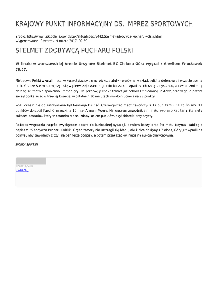 KRAJOWY PUNKT INFORMACYJNY DS. IMPREZ SPORTOWYCH Źródło: http://www.kpk.policja.gov.pl/kpk/aktualnosci/3442,Stelmet-zdobywca-Pucharu-Polski.html Wygenerowano: Czwartek, 9 marca 2017, 02:39 STELMET ZDOBYWCĄ PUCHARU POLSKI W finale w warszawskiej Arenie Ursynów Stelmet BC Zielona Góra wygrał z Anwilem Włocławek 79:57. Mistrzowie Polski wygrali mecz wykorzystując swoje największe atuty - wyrównany skład, solidną defensywę i wszechstronny atak. Gracze Stelmetu męczyli się w pierwszej kwarcie, gdy do kosza nie wpadały ich rzuty z dystansu, a rywale zmienną obroną skutecznie spowalniali tempo gry. Na przerwę jednak Stelmet już schodził z siedmiopunktową przewagą, a potem zaczął odskakiwać w trzeciej kwarcie, w ostatnich 10 minutach rywalom uciekła na 22 punkty. Pod koszem nie do zatrzymania był Nemanja Djurisć. Czarnogórzec mecz zakończył z 12 punktami i 11 zbiórkami. 12 punktów dorzucił Karol Gruszecki, a 10 miał Armani Moore. Najlepszym zawodnikiem finału wybrano kapitana Stelmetu Łukasza Koszarka, który w ostatnim meczu zdobył osiem punktów, pięć zbiórek i trzy asysty. Podczas wręczania nagród zwycięzcom doszło do kuriozalnej sytuacji, bowiem koszykarze Stelmetu trzymali tablicę z napisem: "Zbobywca Pucharu Polski". Organizatorzy nie ustrzegli się błędu, ale kibice drużyny z Zielonej Góry już wpadli na pomysł, aby zawodnicy złożyli na bannerze podpisy, a potem przekazać ów napis na aukcję charytatywną. źródło: sport.pl Ocena: 0/5 (0) Tweetnij